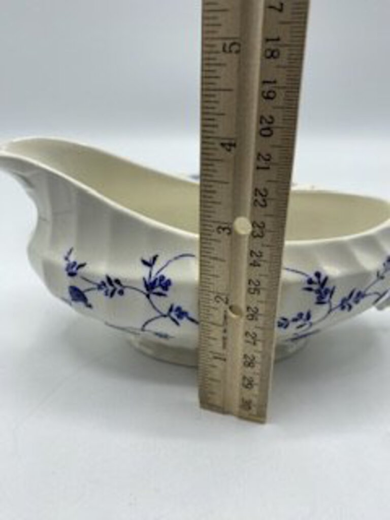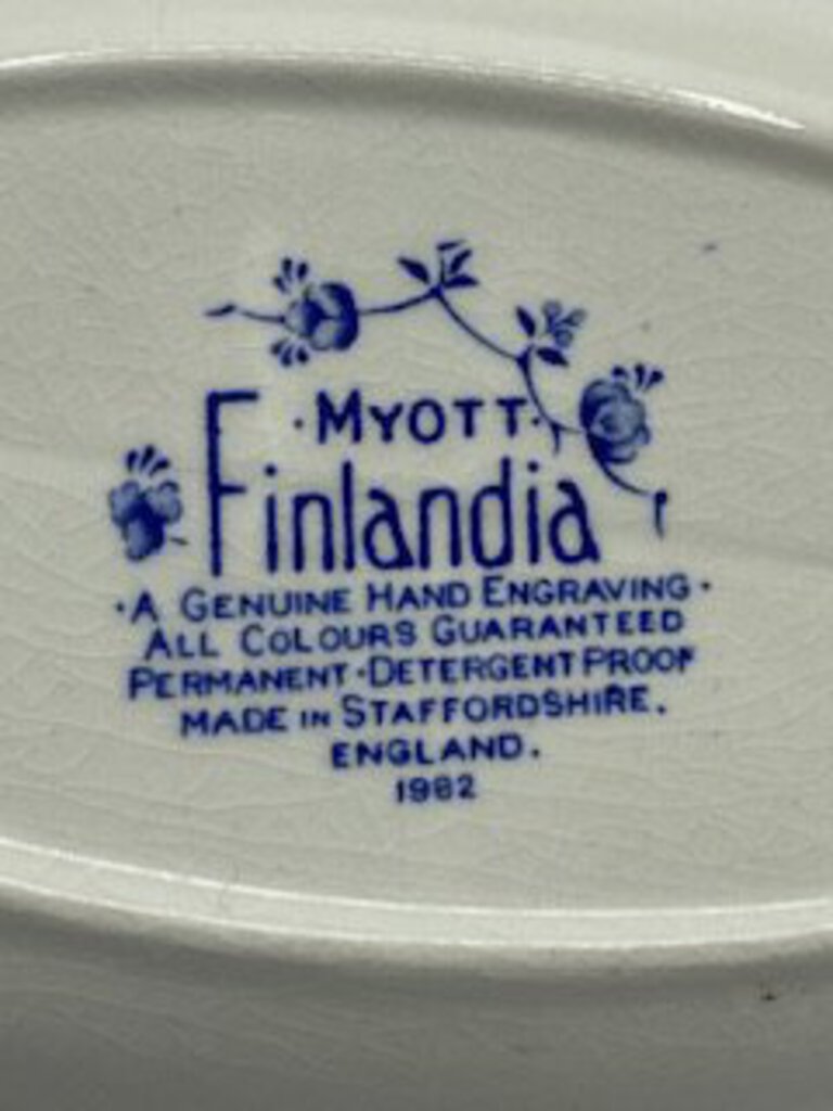 Myott Finlandia Fine Staffordshire Ware made in England. This Blue and White handled Gravy Boat and matching underplate are in excellent condition with no chips, cracks or scratches. The raised edge (to catch the drippings) underplate measures approximately 9” x 6.25”. The gravy boat is 9” long including the handle, 4” wide and 2” deep. Beautiful set for your dining table.