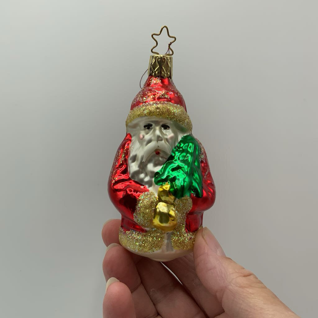 Old World Christmas Ornament Set of 2. Colorful Blown Glass ornaments with glitter accents. A standing Thanksgiving Turkey with its feathers in full display measures 3.5” tall. And Santa holding a miniature Christmas tree measures 3.5” tall. No damage found. Made in Germany.