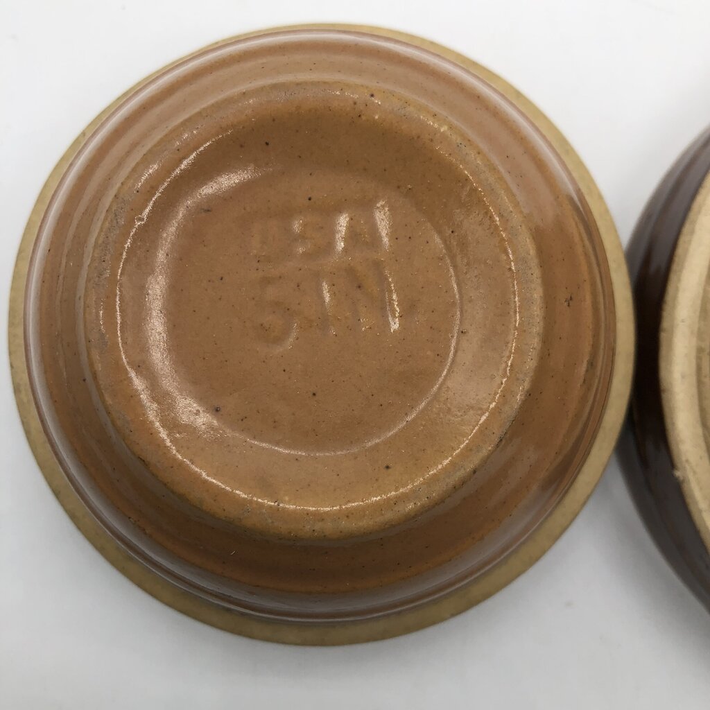 The light carmel color bowl is a 5” inch, stands 2 7/8” tall, incised “USA 5IN”. No chips, cracks or issues.