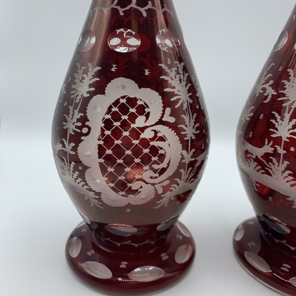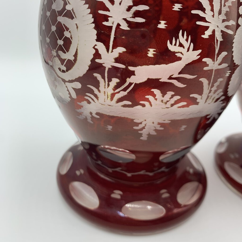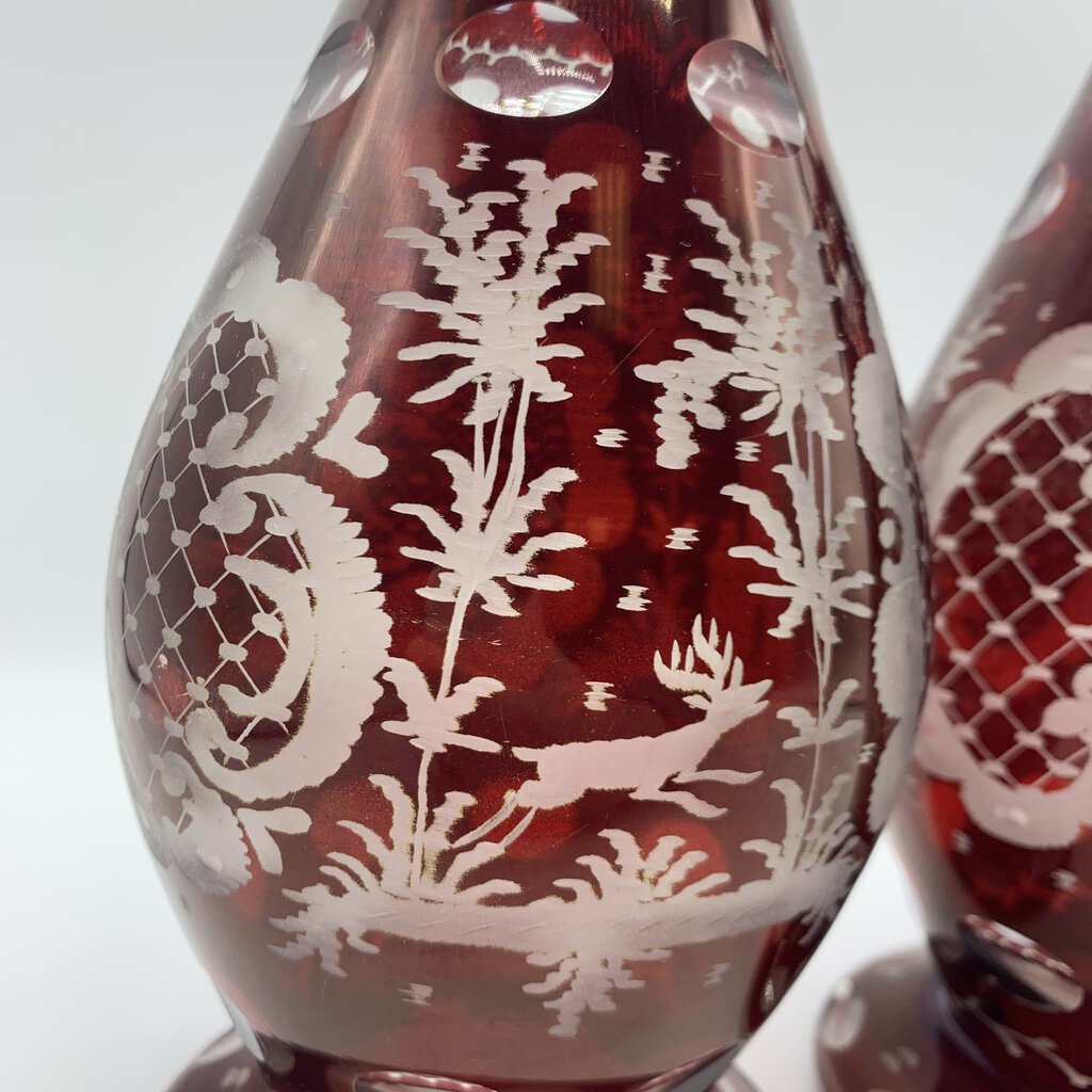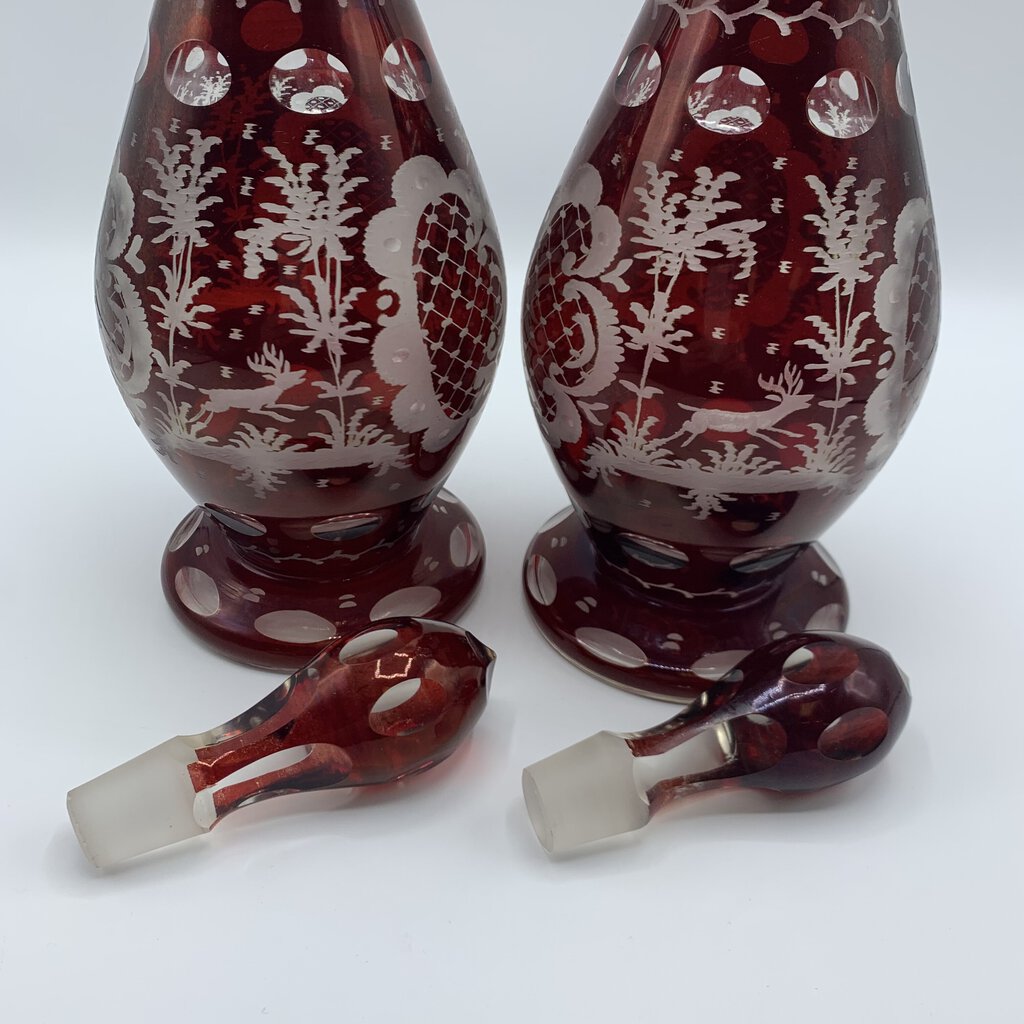 Enchanting etching on these cut to clear antique ruby red decanters made by Egermann of Prague, Czech Republic. They have a strong botanical theme with deer and trees depicted. Truly striking pieces!