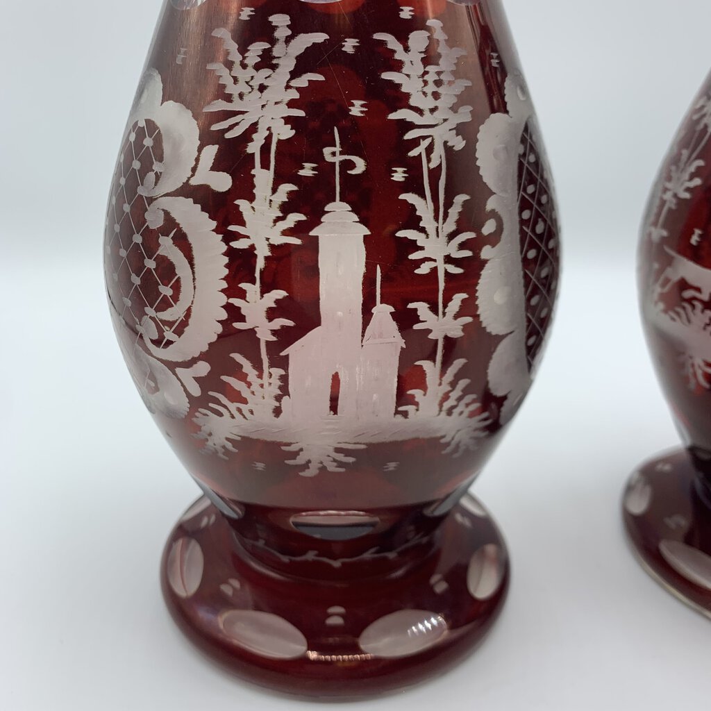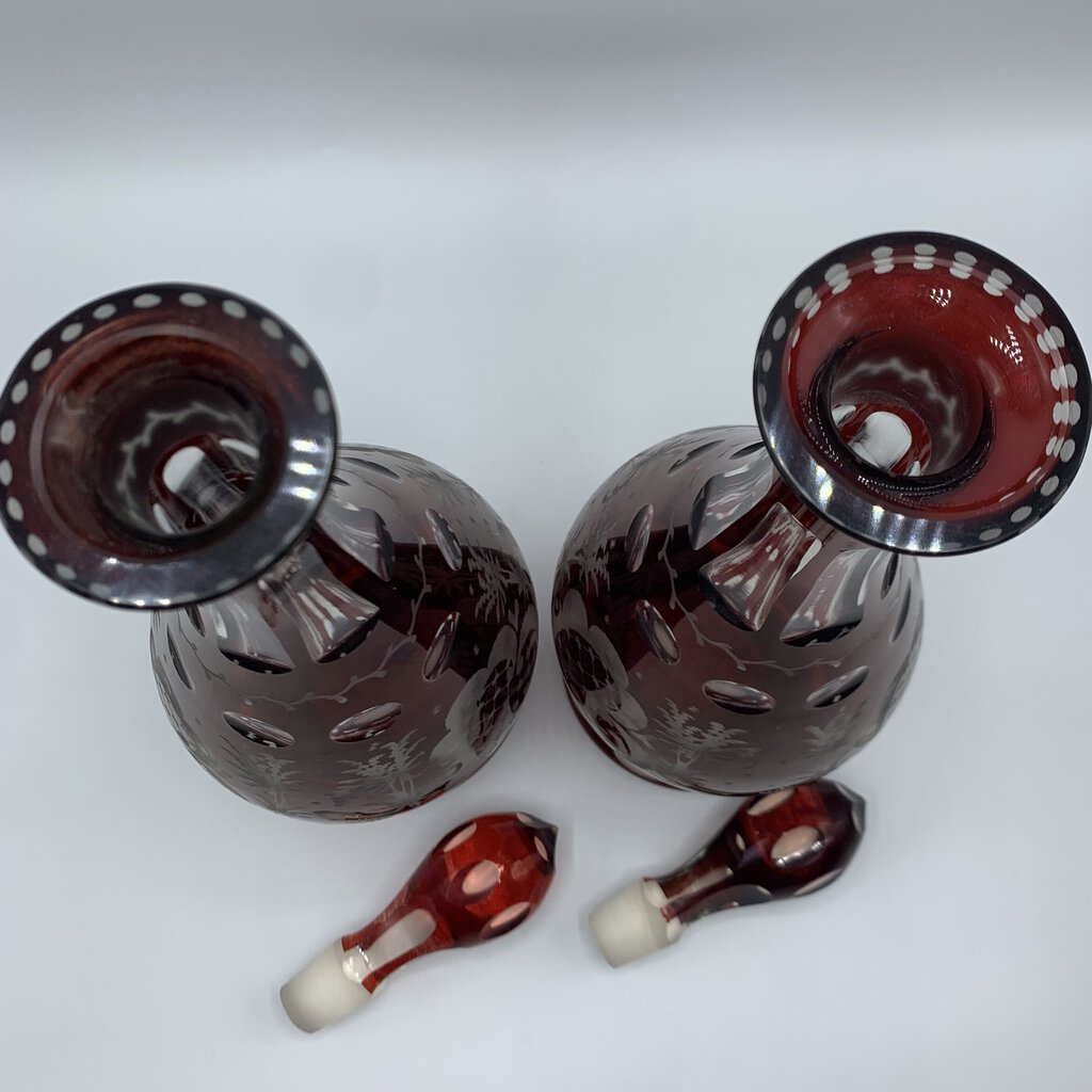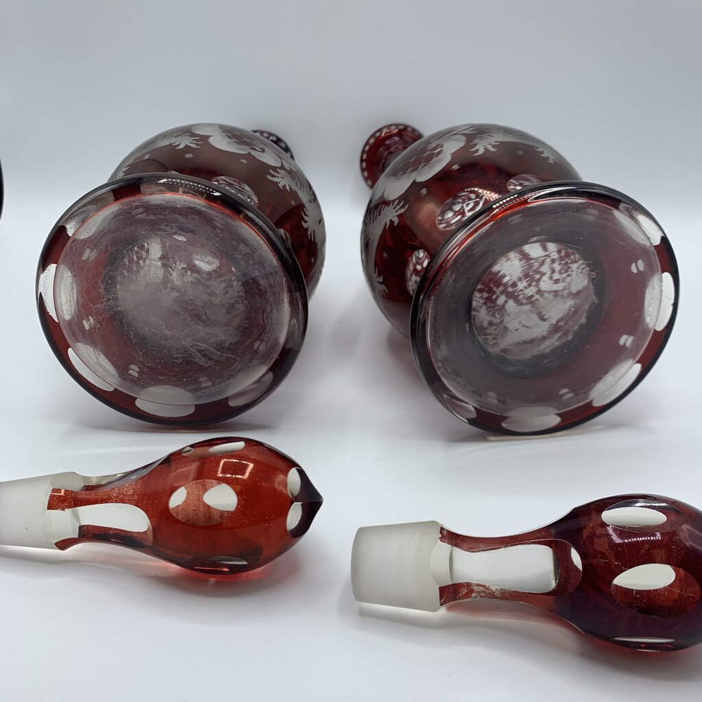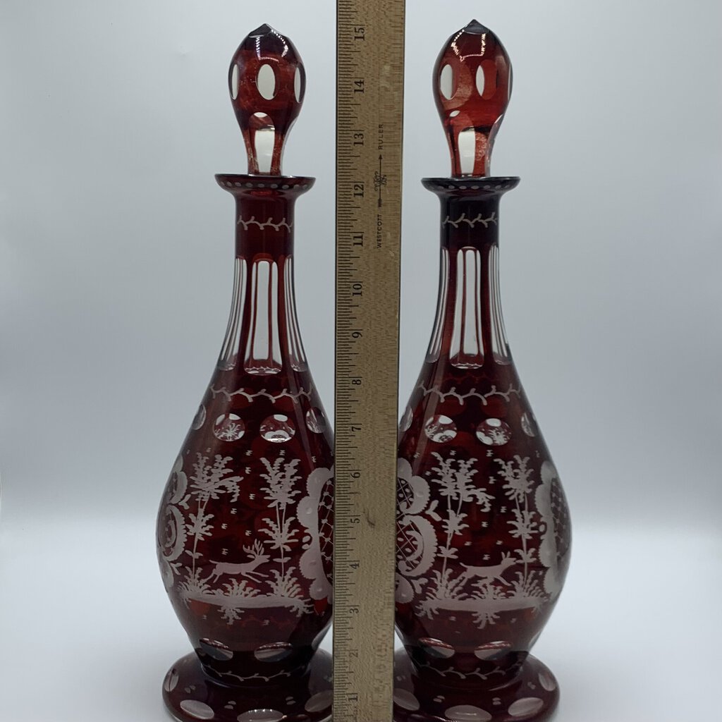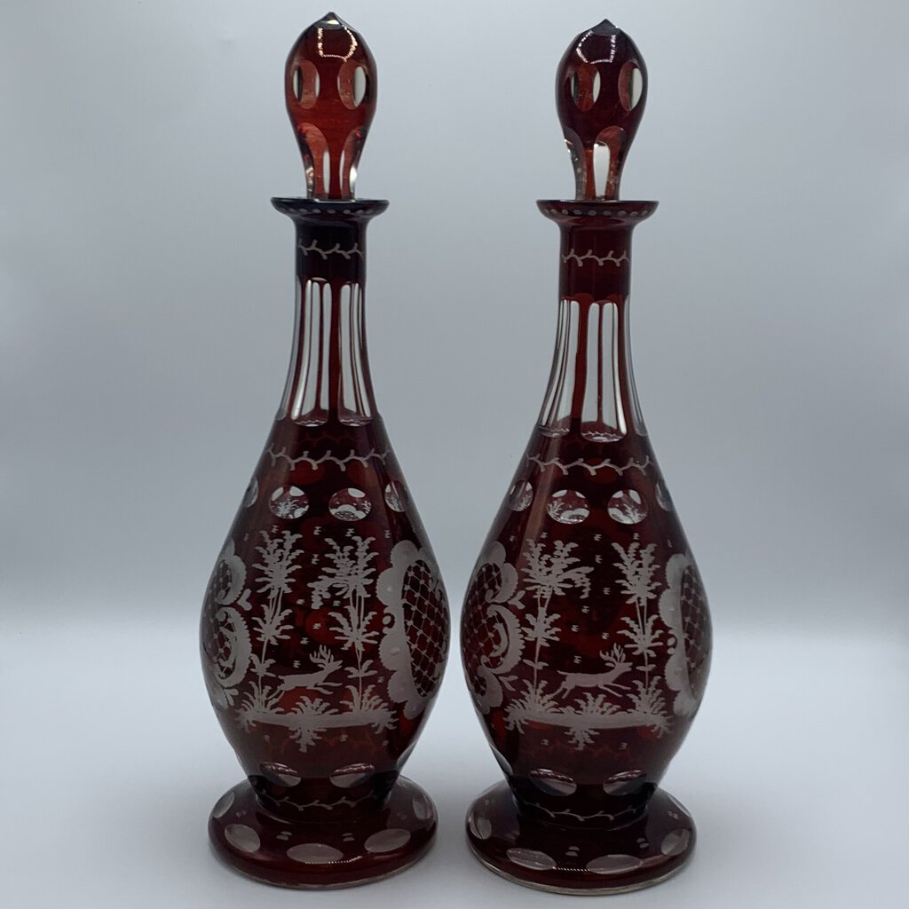 Enchanting etching on these cut to clear antique ruby red decanters made by Egermann of Prague, Czech Republic. They have a strong botanical theme with deer and trees depicted. Truly striking pieces!