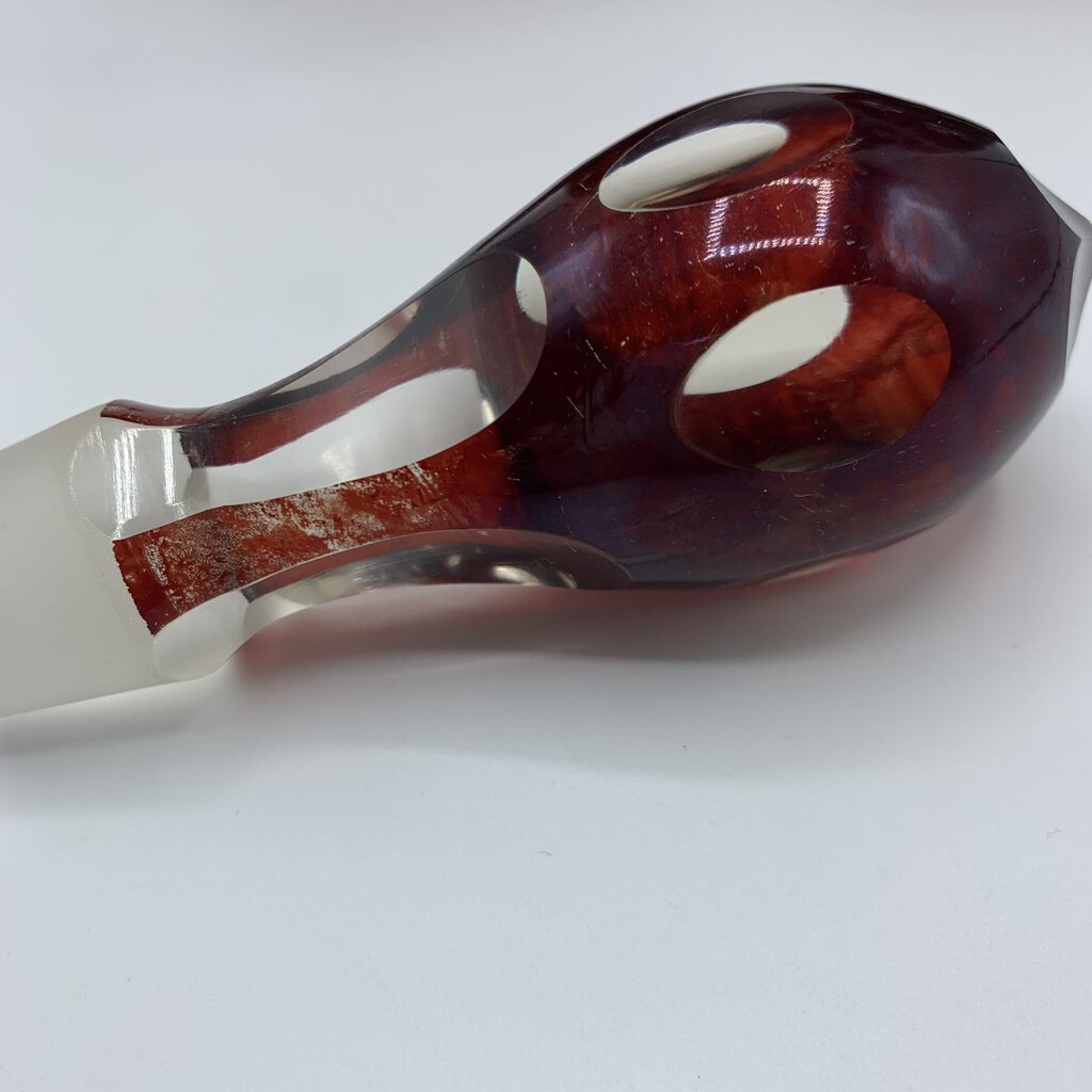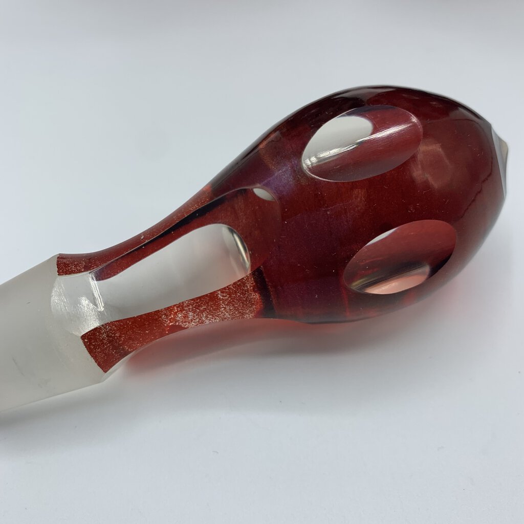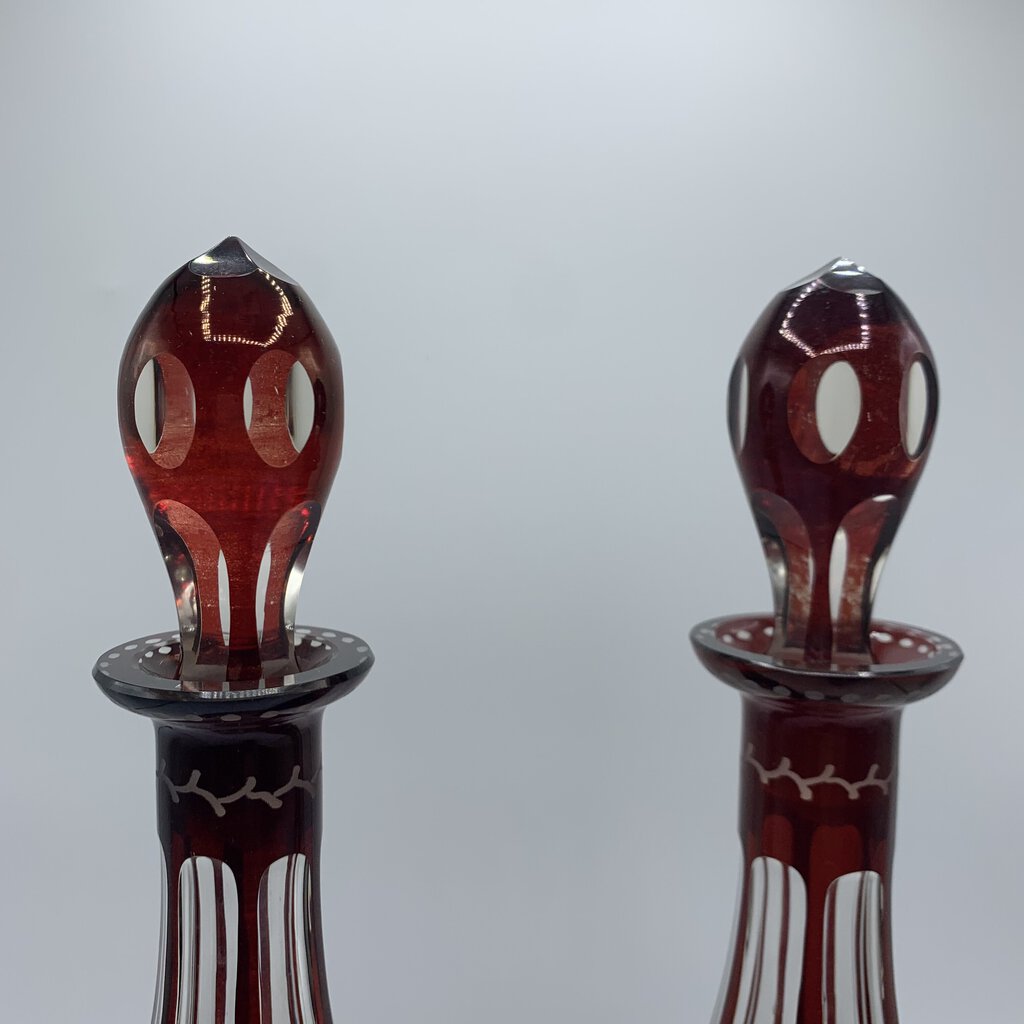 The decanters were estate-owned and are in excellent antique condition. You will see a little wear to the red flashing (especially on the stoppers) and a couple of subtle scratches, but overall they’re in beautiful shape! No chips or cracks found.