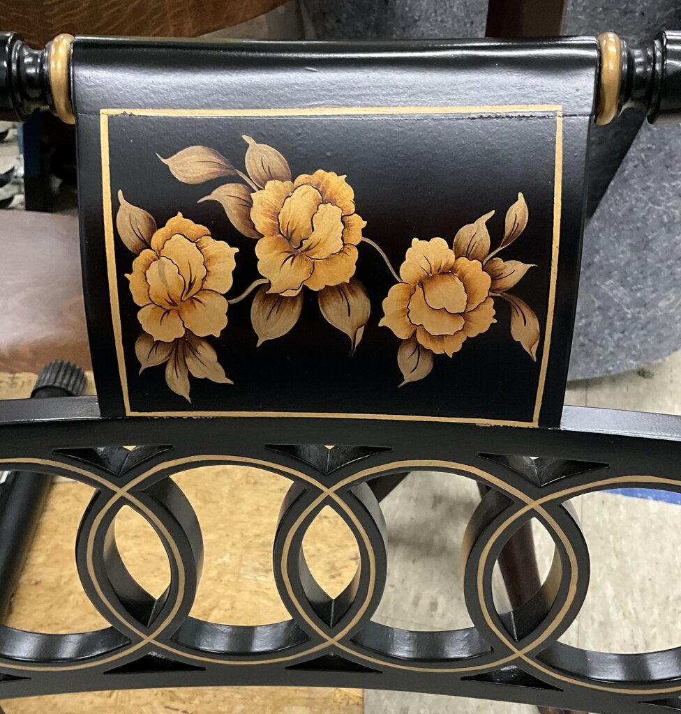 These chairs are in great condition and have no damage or rips to the upholstery. Beautiful hand painted flowers and gold trim on both chairs.