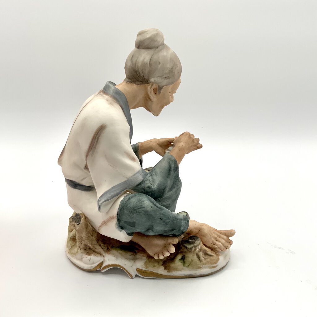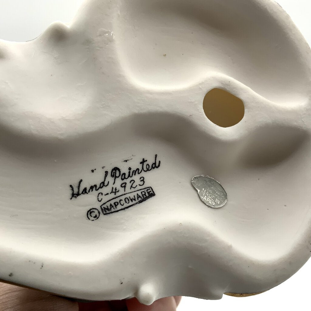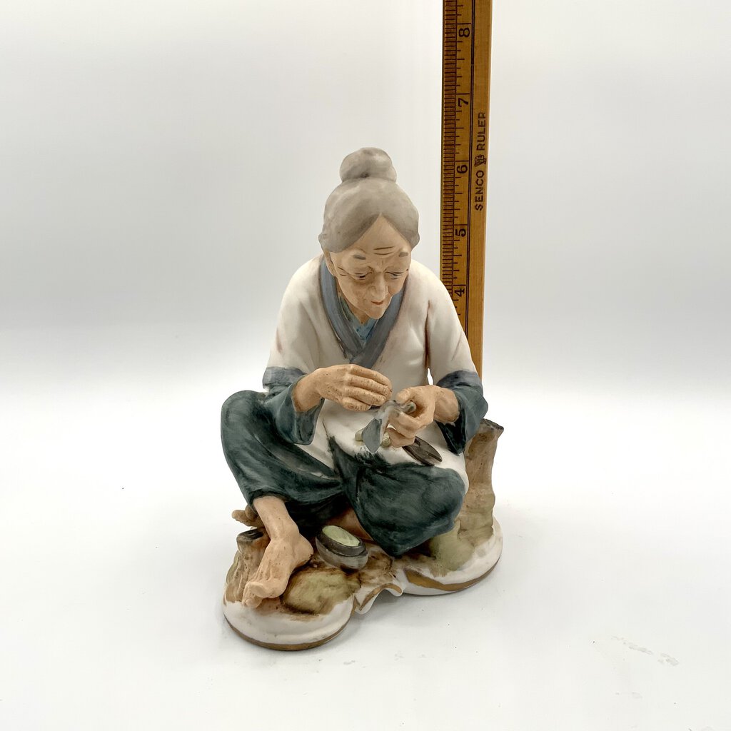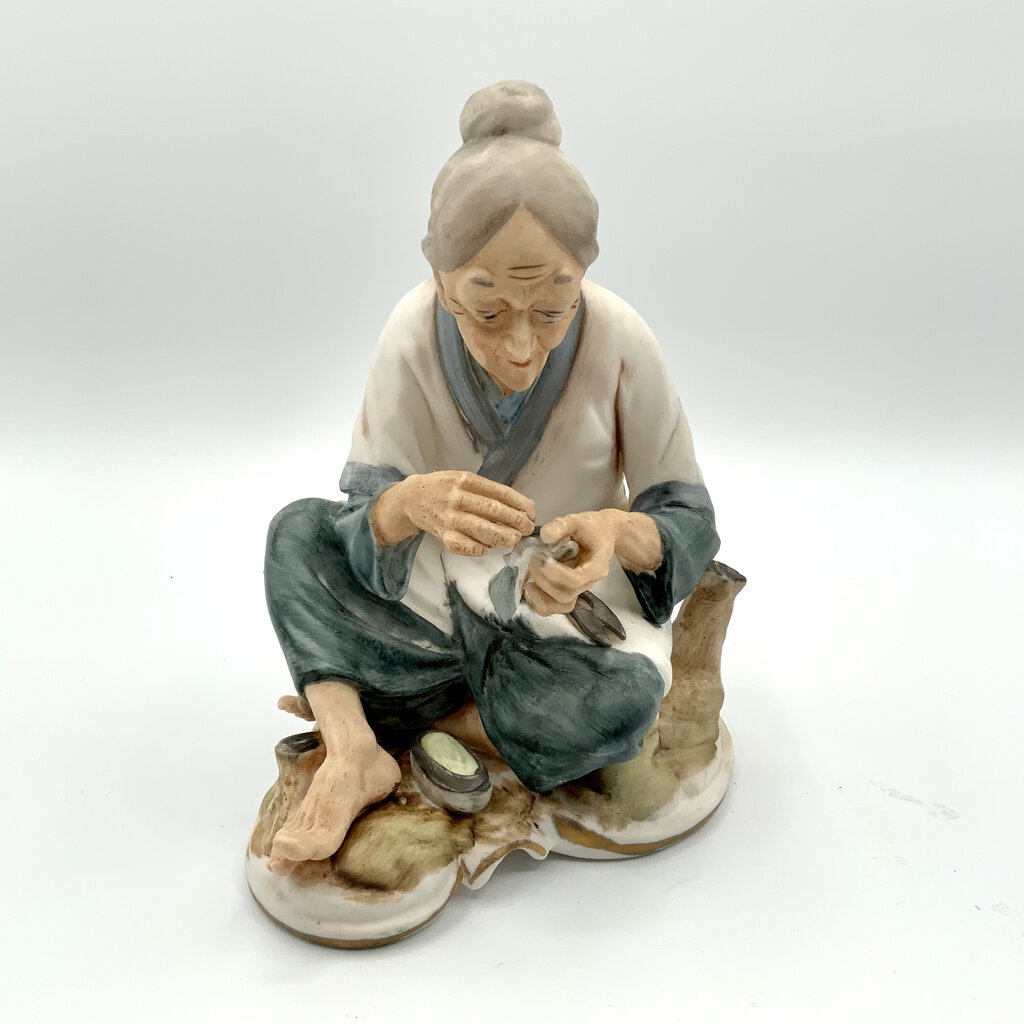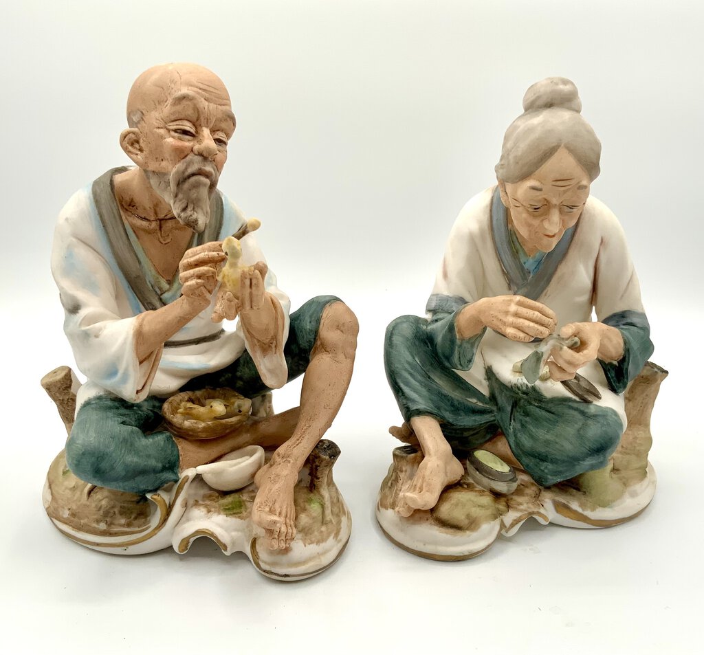 Adorable pair of vintage hand painted Napco C-4923 figurines. Made in Japan. Old man feeding baby bird and old women doing needlework. Both figurines are in excellent condition. The old women has a mold crack from manufacture (pictured), but otherwise no chips, cracks, or repairs. Priced appropriately. Perfect for collectors. Stamps and stickers at the bottom of both figurines.