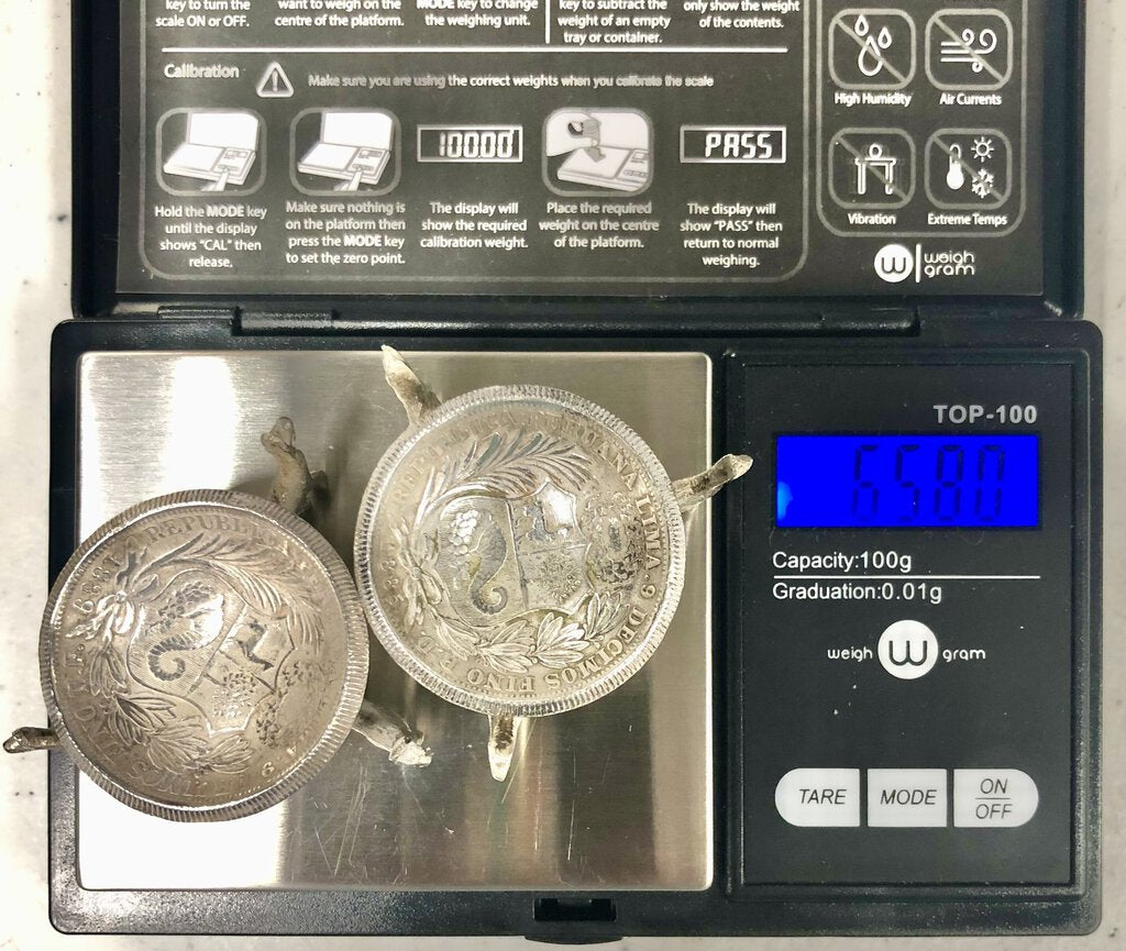 From a Fine Estate. This is a nice pair of salt cellars made from a Peruvian coin. Each coin is held by three figural llamas. Coin dates are 1885 and 1889. Measure 1 3/4” tall, length 1 3/4”. The pair weighs 65.80 grams. Each cellar has some cracking on the underside. Does not affect usage. Please review all photos carefully for condition and consideration. Fine Estate item. Condition is Pre Owned. |