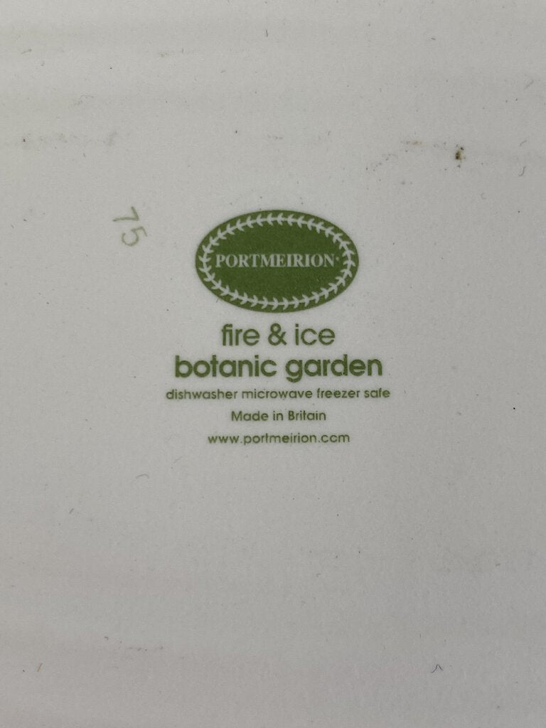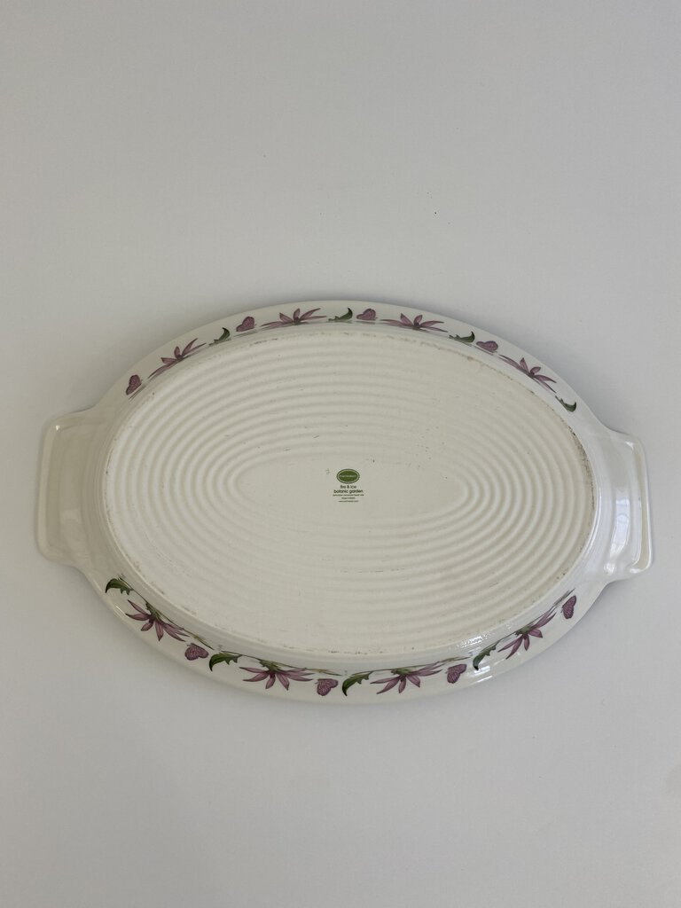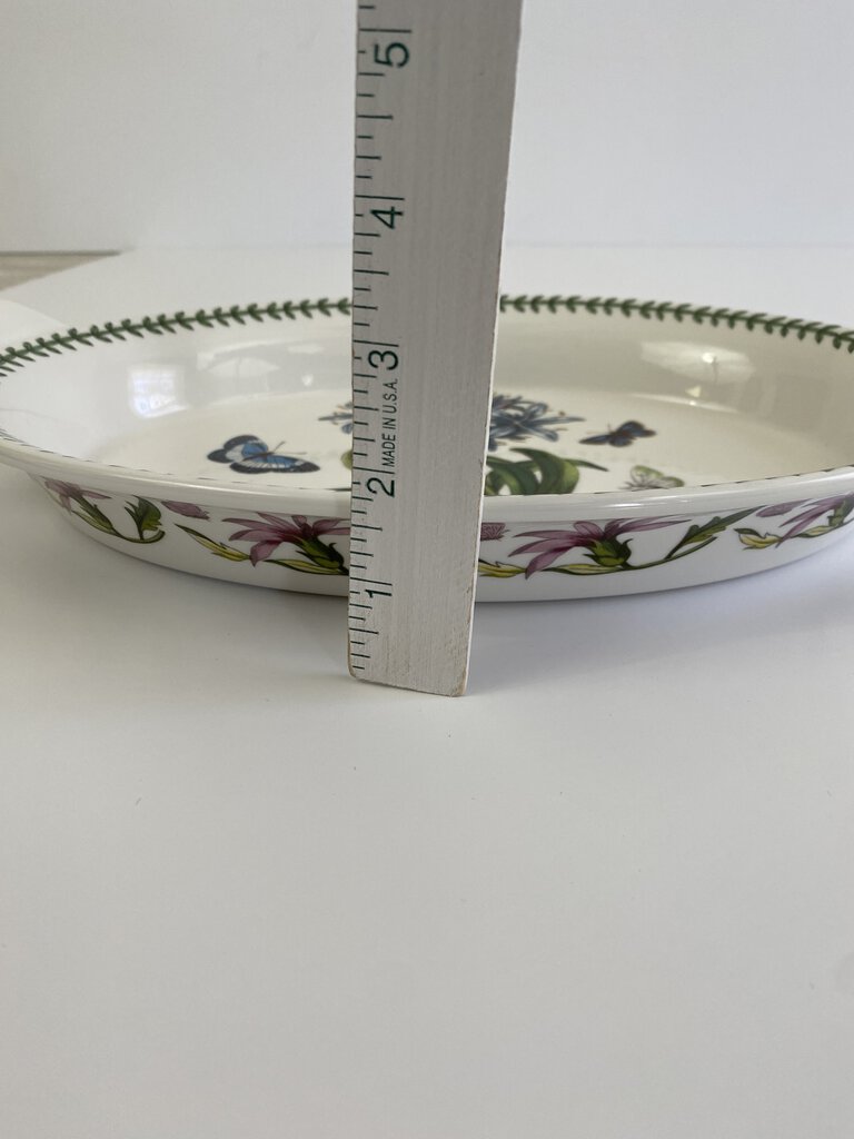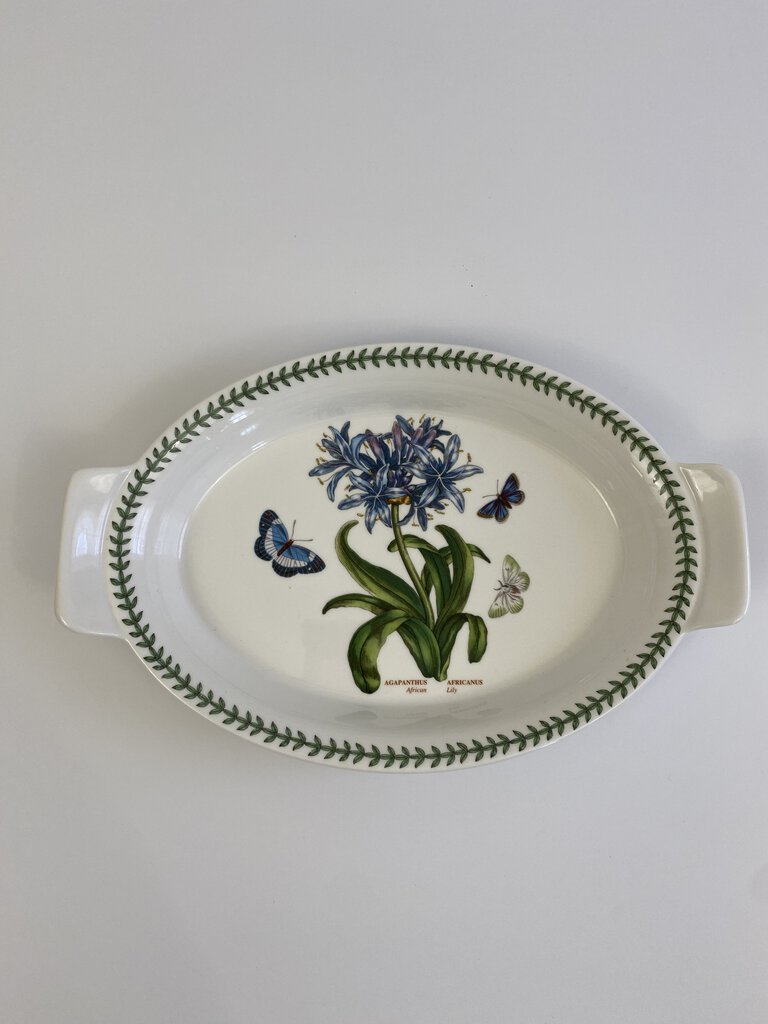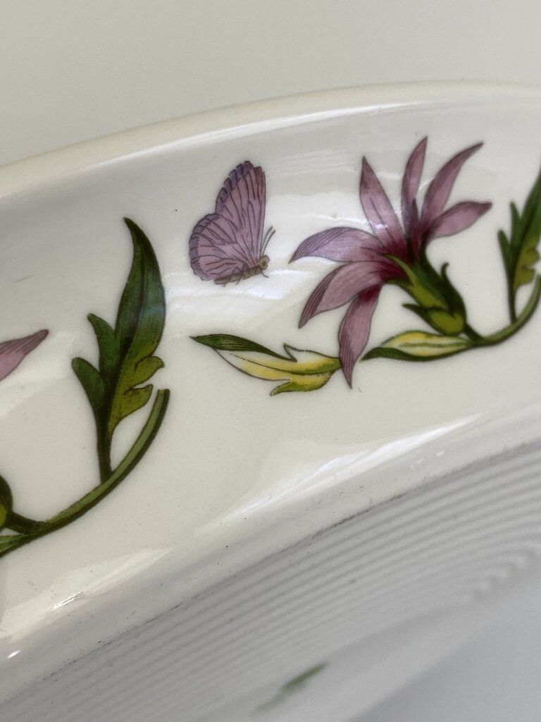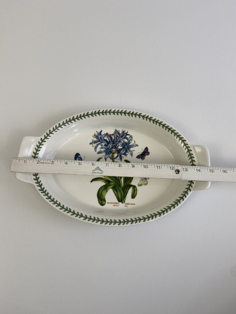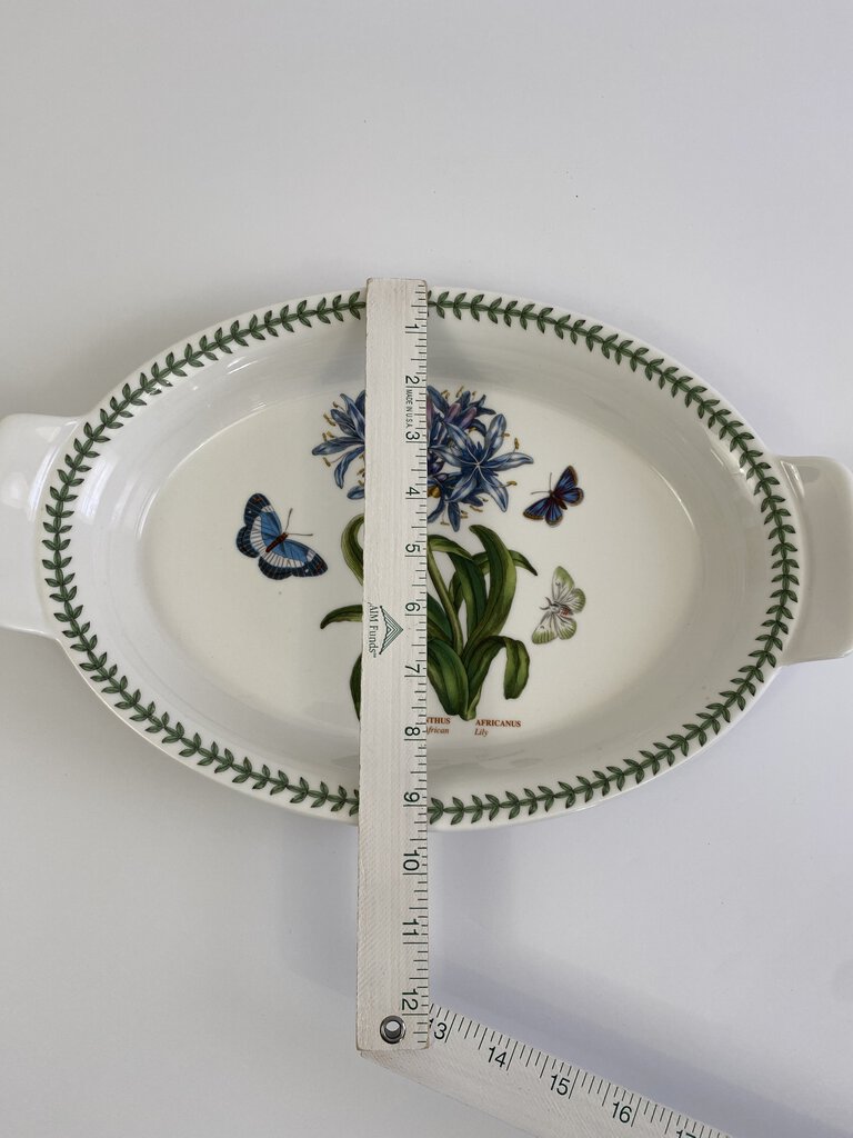 Portmeirion Botanic Garden Handled Oval Tray measuring 14 3/4” long handle to handle, 10” wide and 1.75” deep. Decorated with African Lily on the interior with butterflies and exterior flowers only. No chips, cracks, crazing or scratches, excellent!