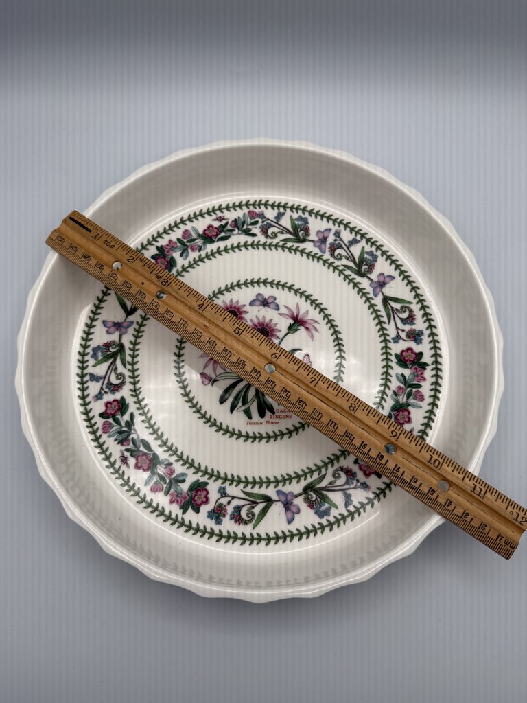 Portmeirion Botanic Garden Series 10” Quiche Dish in the Fire and Ice Variations series. The dish is decorated with the Gazania Ringens ~ Treasure Flower pattern. Oven, Microwave, Dishwasher, Freezer safe. Clean, no damage found, looks never used. Finish is bright and shiny!