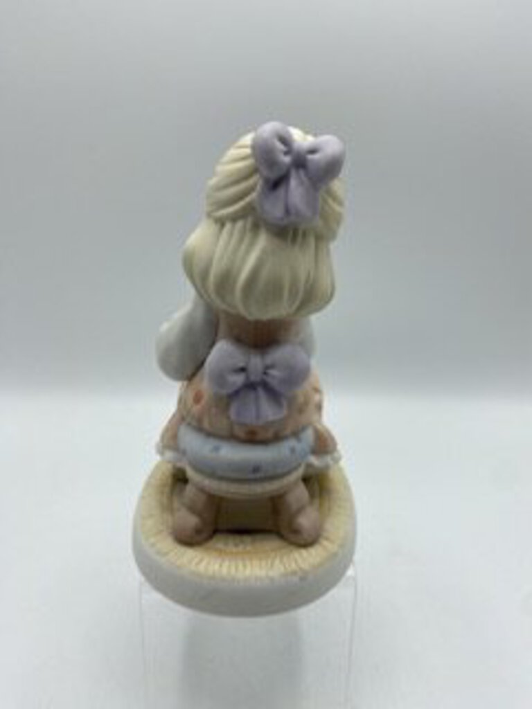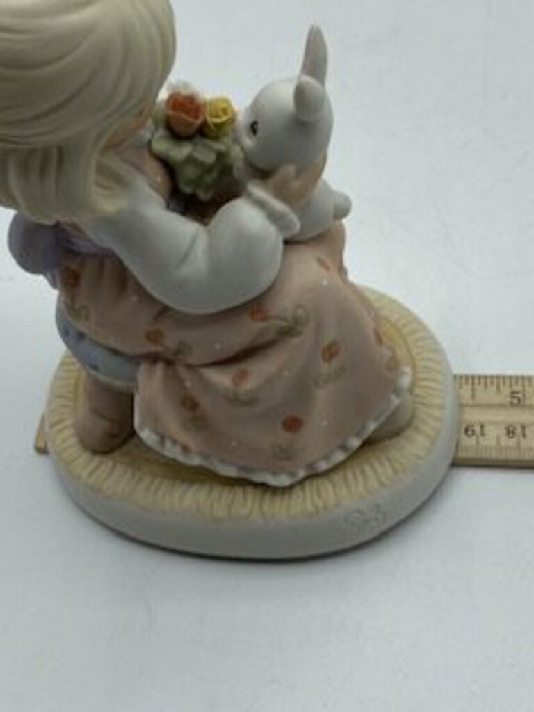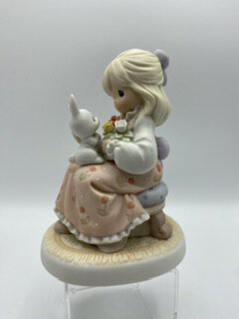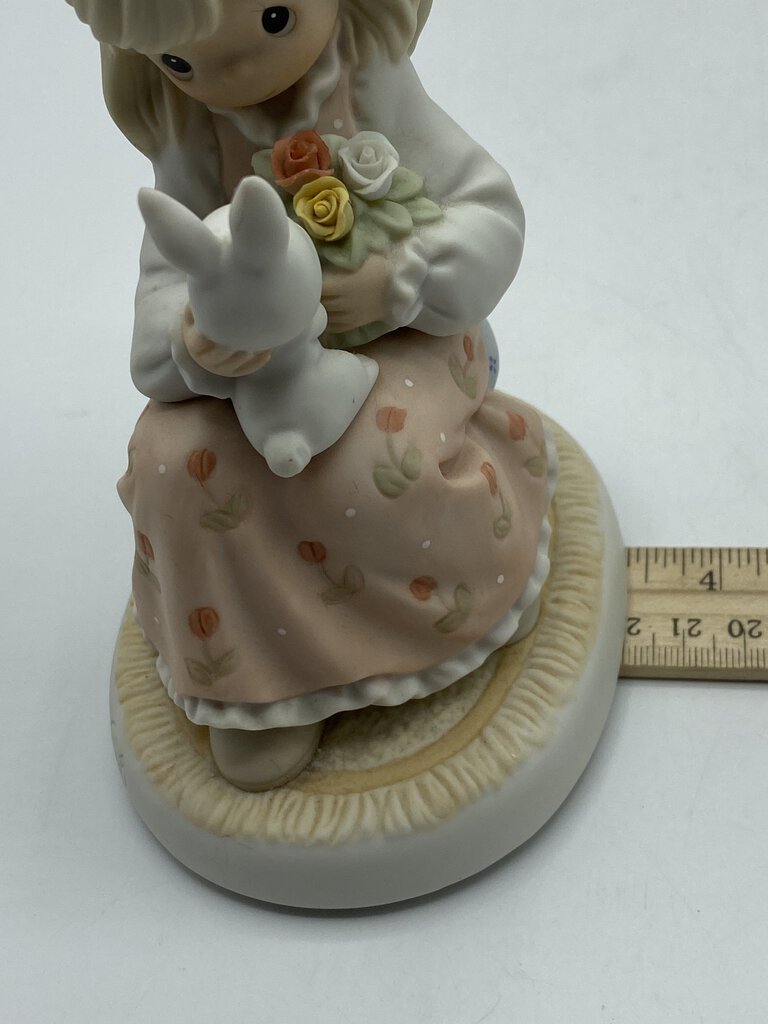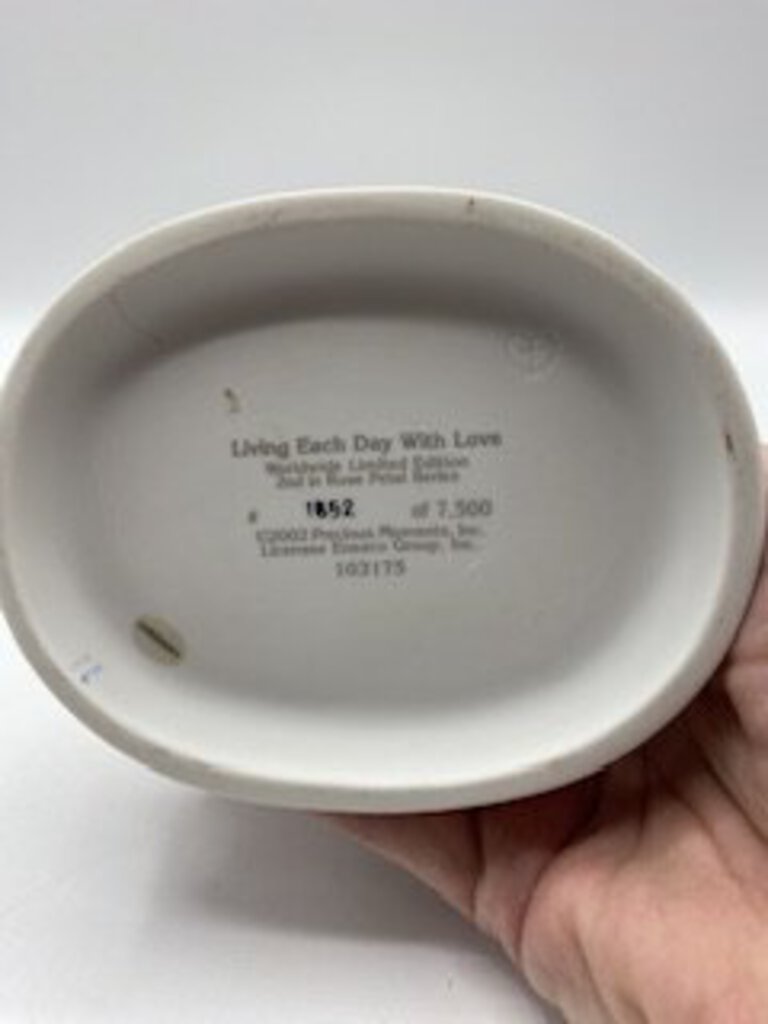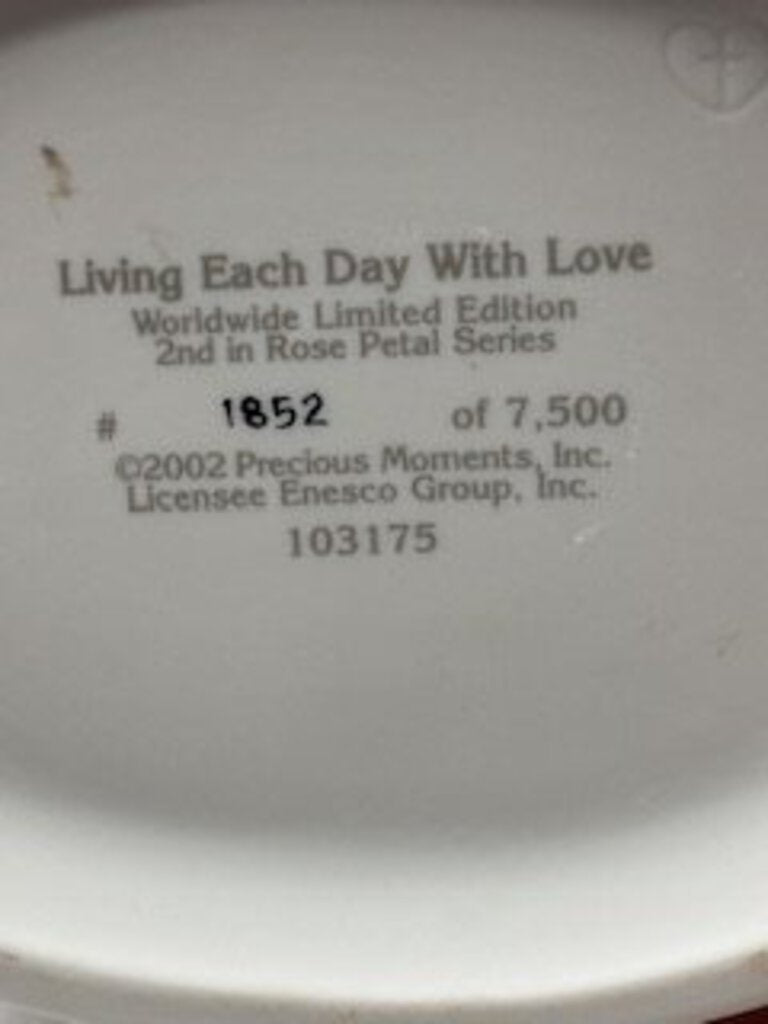 PRECIOUS MOMENTS FIGURINE - LIVING EACH DAY WITH LOVE - 2ND IN ROSE PETAL SERIES - LT ED 1852/7500. PORCELAIN, APPROX 6" HIGH. 3.5” x 4.5” base.ITEM 103175, YEAR 2002. No chips or cracks, just sweet!