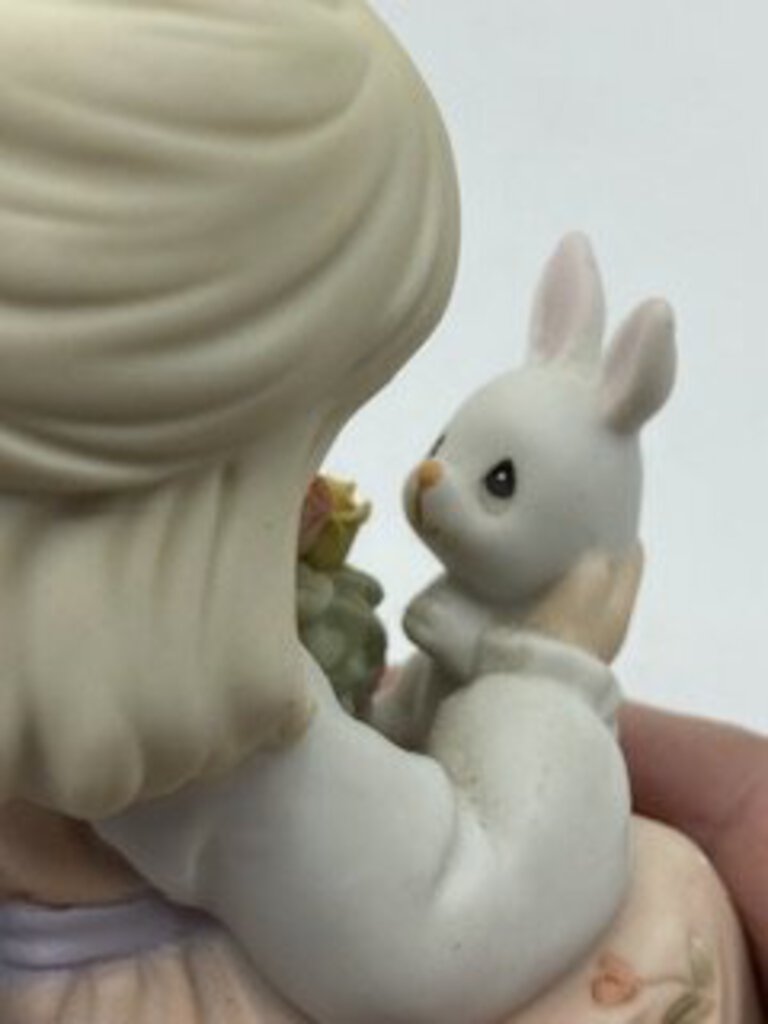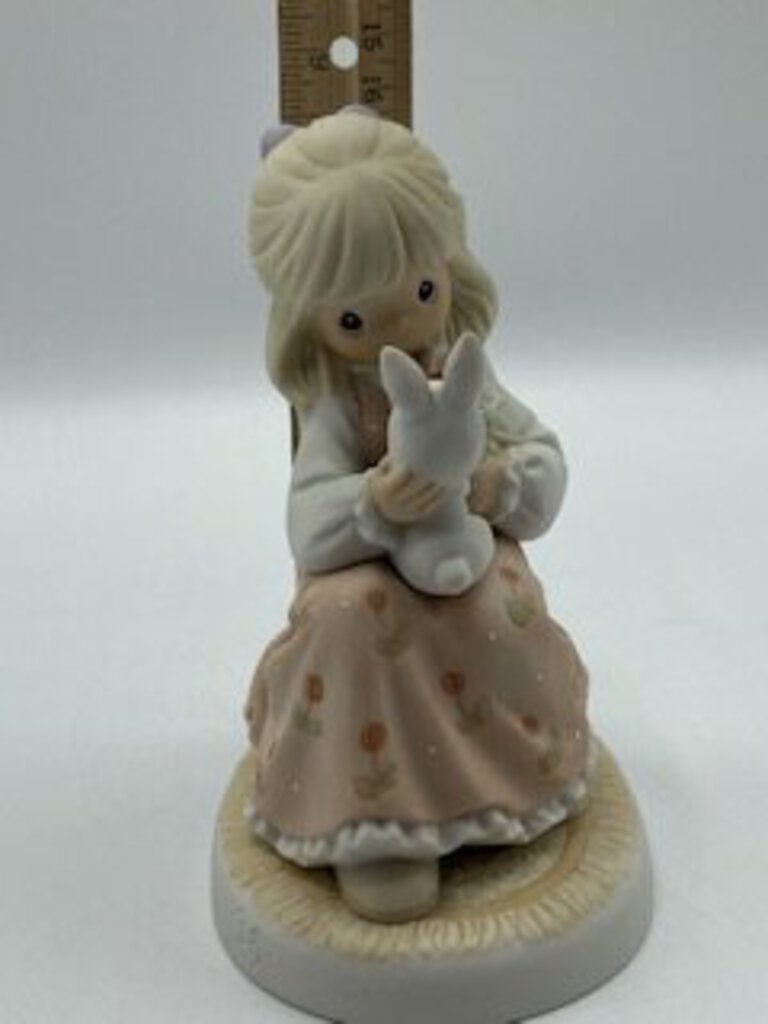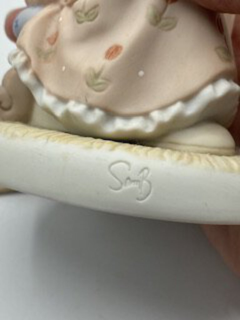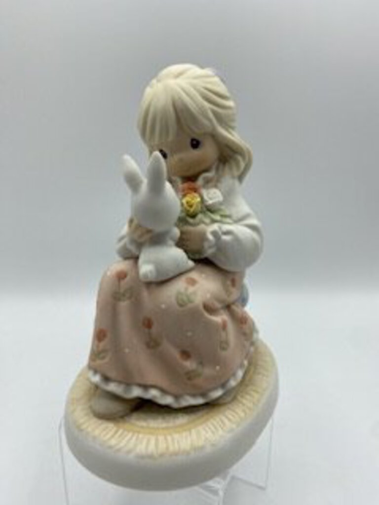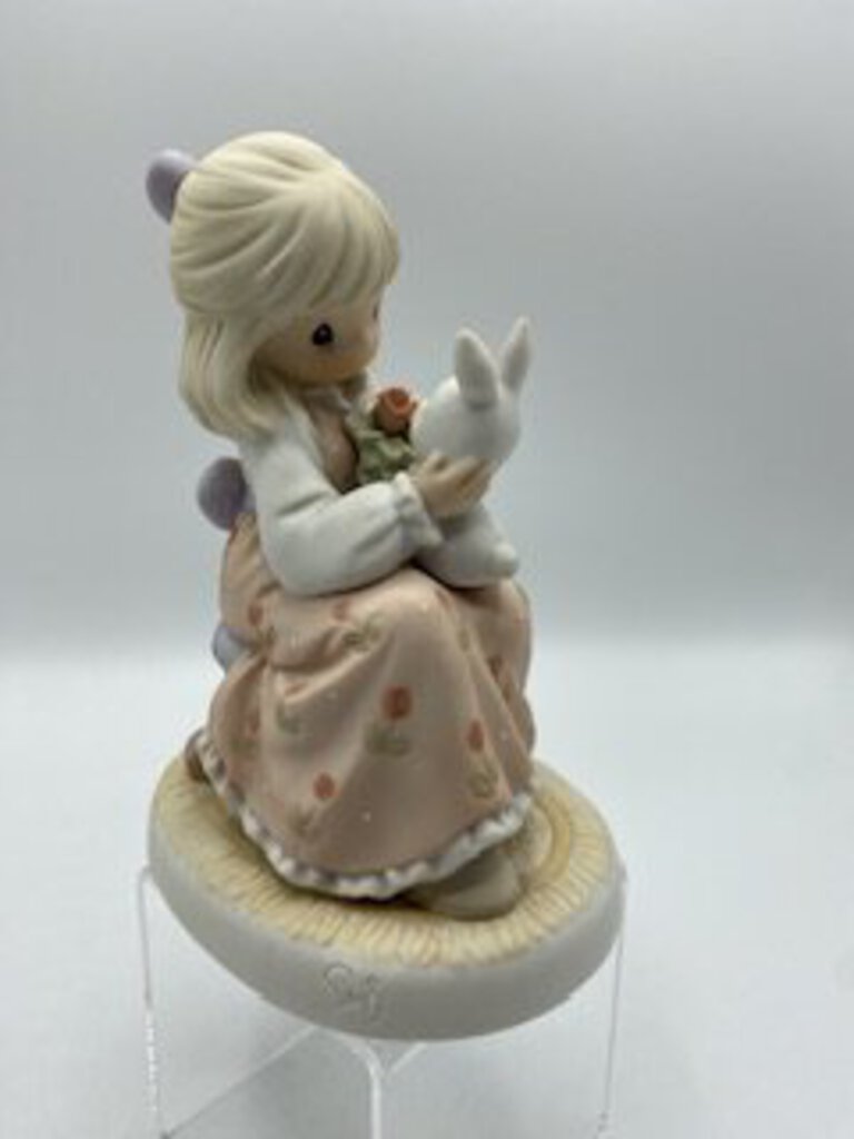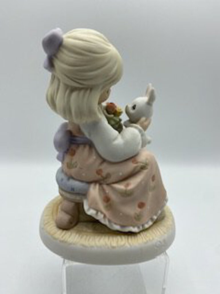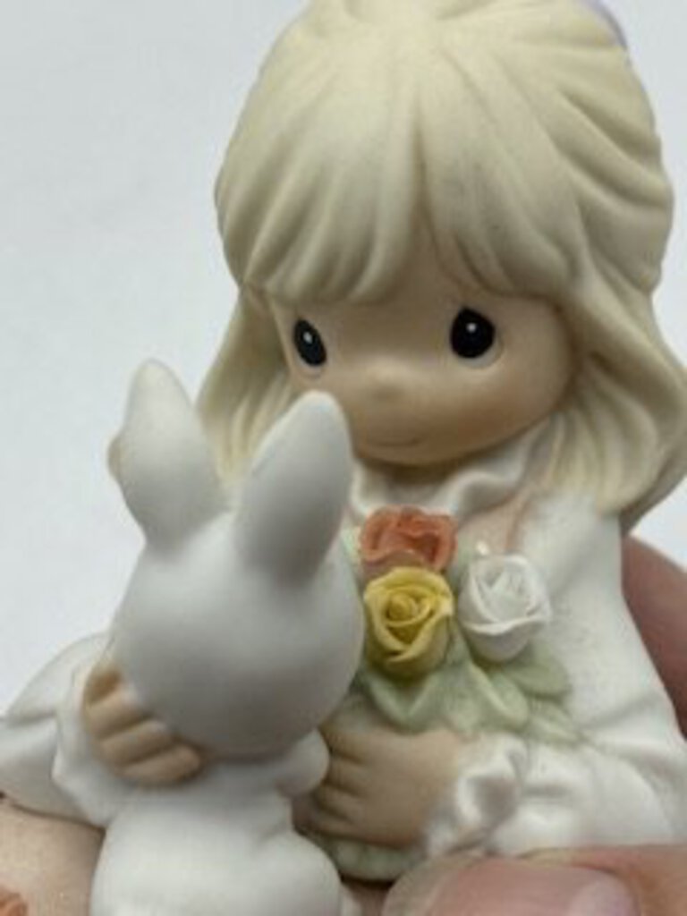 PRECIOUS MOMENTS FIGURINE - LIVING EACH DAY WITH LOVE - 2ND IN ROSE PETAL SERIES - LT ED 1852/7500. PORCELAIN, APPROX 6" HIGH. 3.5” x 4.5” base.ITEM 103175, YEAR 2002. No chips or cracks, just sweet!