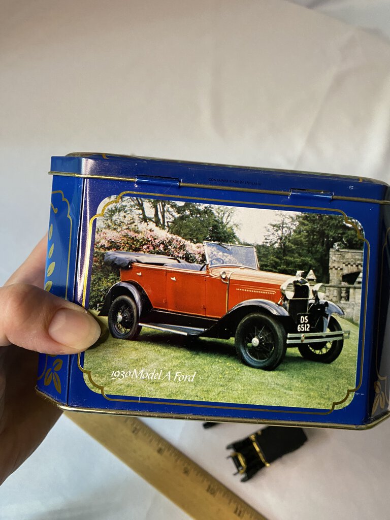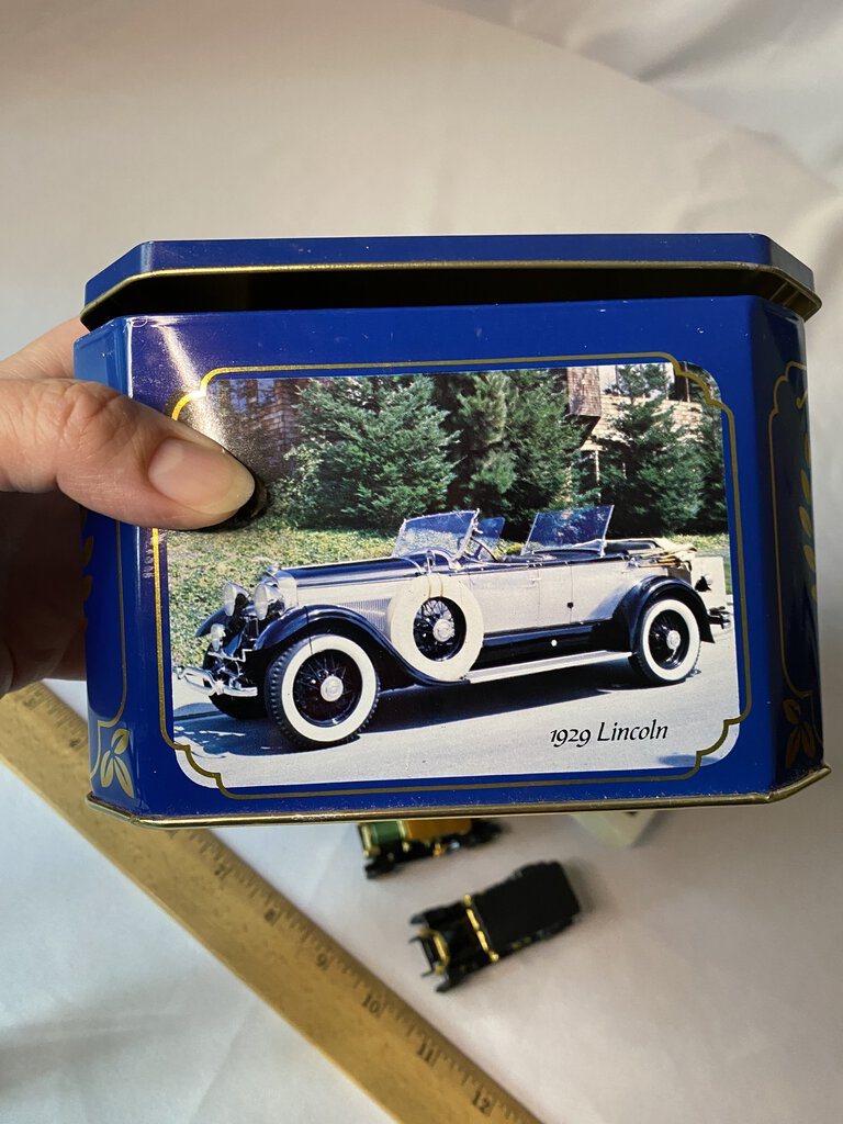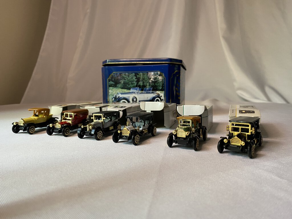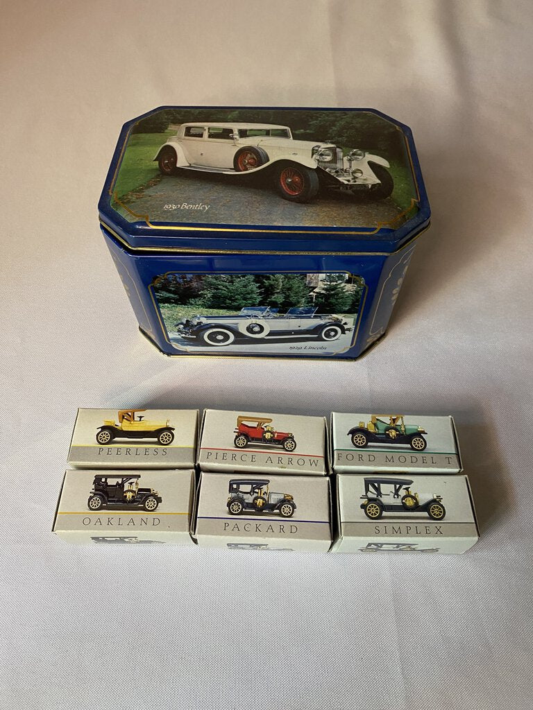 Sweet collection from Readers Digest Collection of 6 1/64 die cast antique cars in original cardboard boxes plus storage tin. Set of 6 includes:Pierce Arrow No. 302, Packard No.306, Ford Model T No.204,Simplex No. 305, Oakland No. 303, Peerless No. 211. All cars and cardboard boxes are clean with no damage. Classic Cars Tin Storage Box Hinged Lid included.