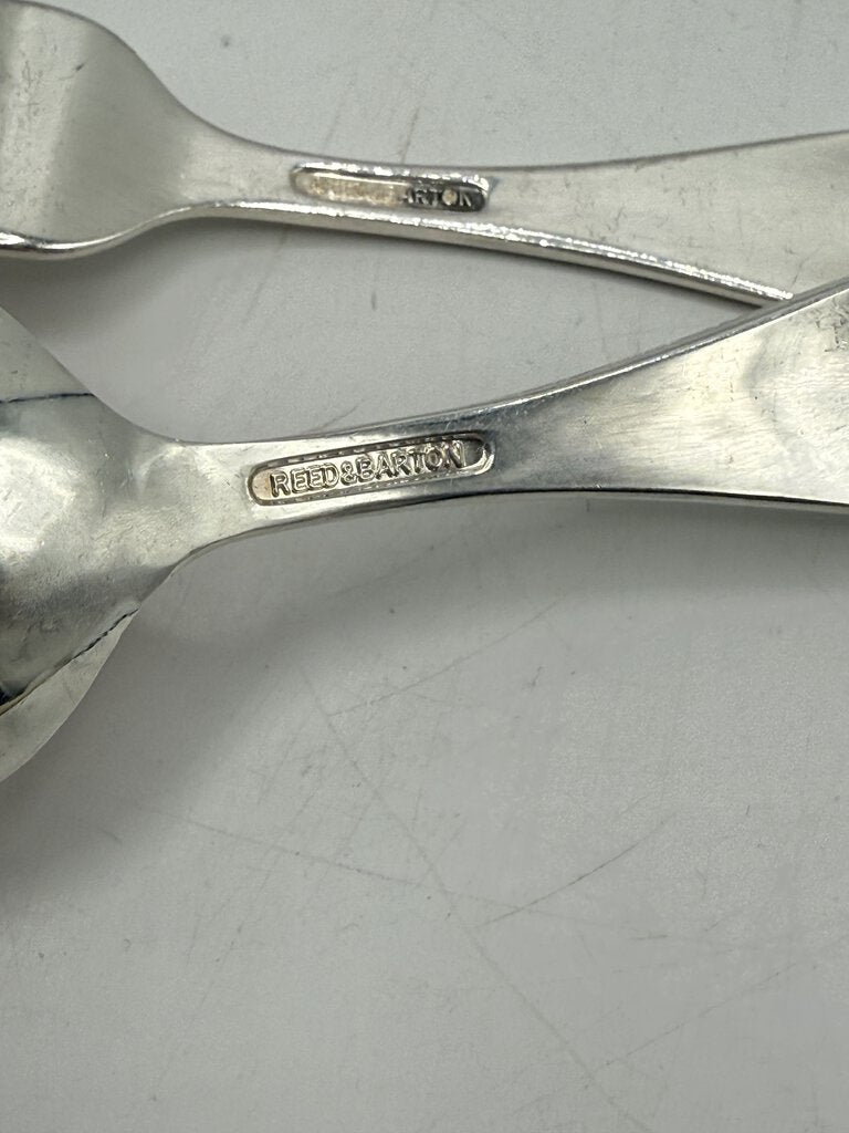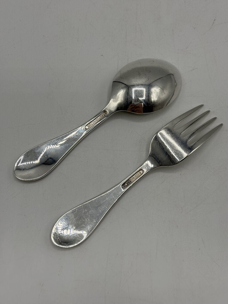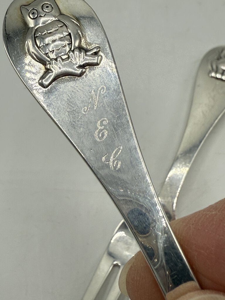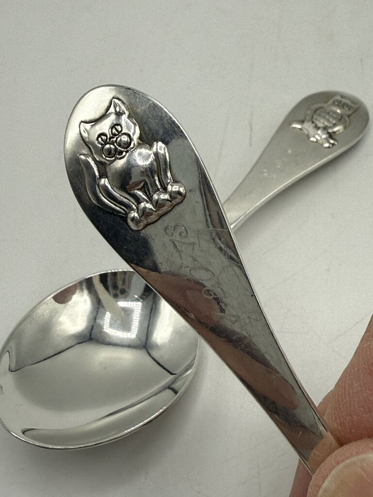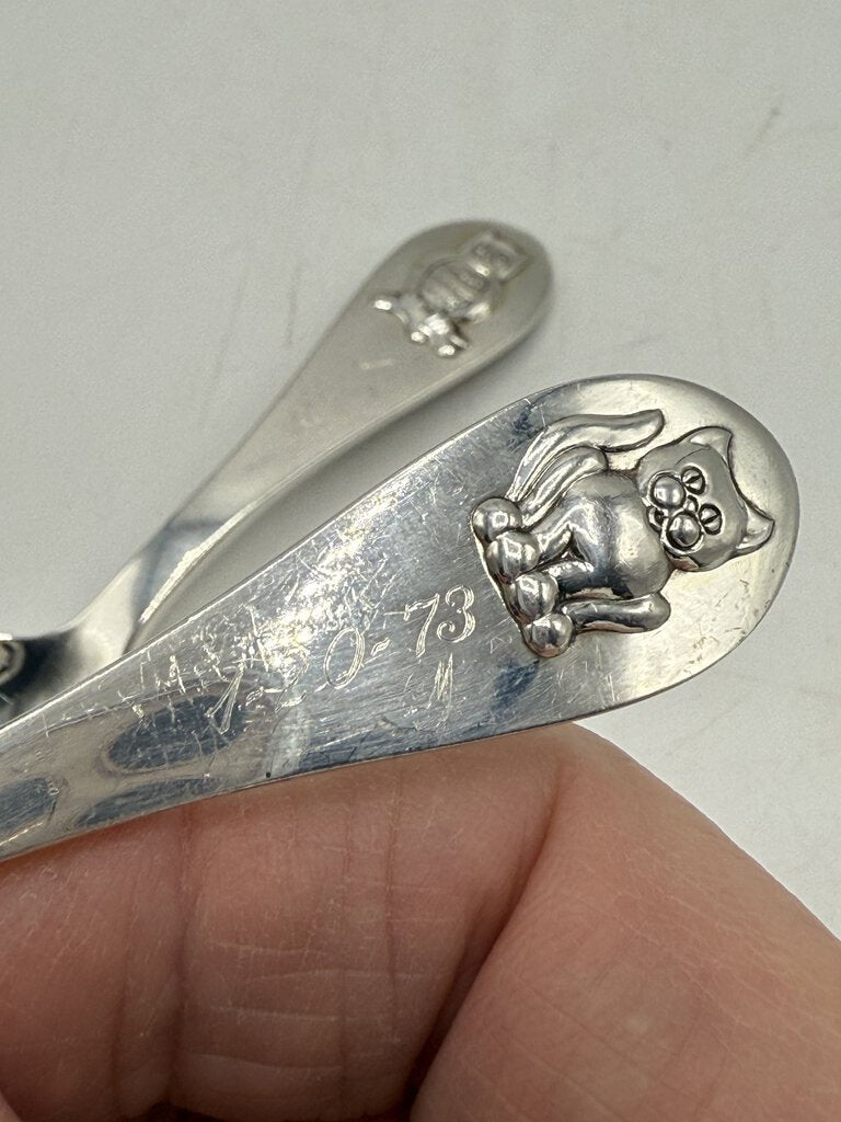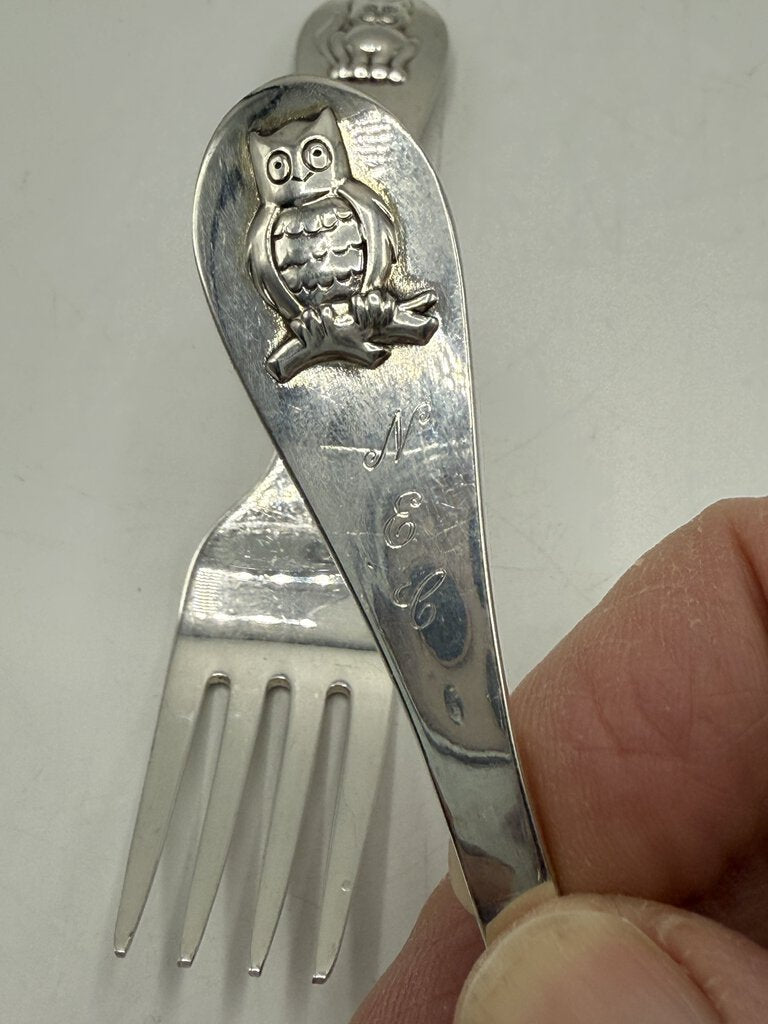 Estate set of Reed & Barton baby flatware. Baby Spoon has an Owl and the Monogram “N E C” engraved. Baby Fork has a Kitty Cat with the date 1 -20-73. Adorable set, no tarnish, light scratches from use.