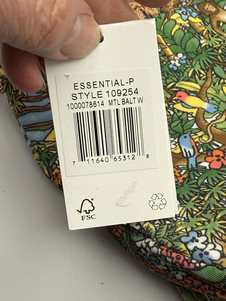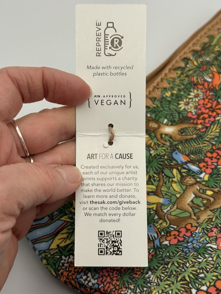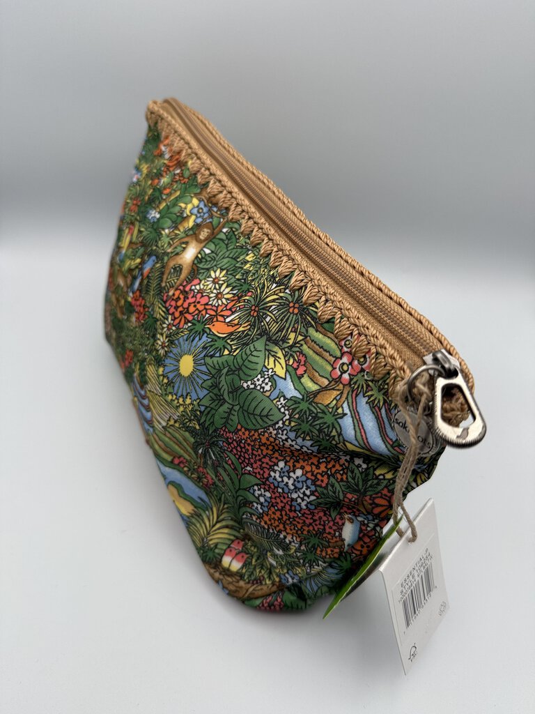 The Sakroots Artist Circle Essential Clutch made of Recycled plastic bottles in the Bali Wana pattern. A tropical rainforest is home to colorful birds and hanging around monkeys on this brand new clutch style bag. New with original tags. Measures approximately 11” long by 7” deep and 3” wide. Main enclosure zipper, interior zipper pocket and two pouch pockets.