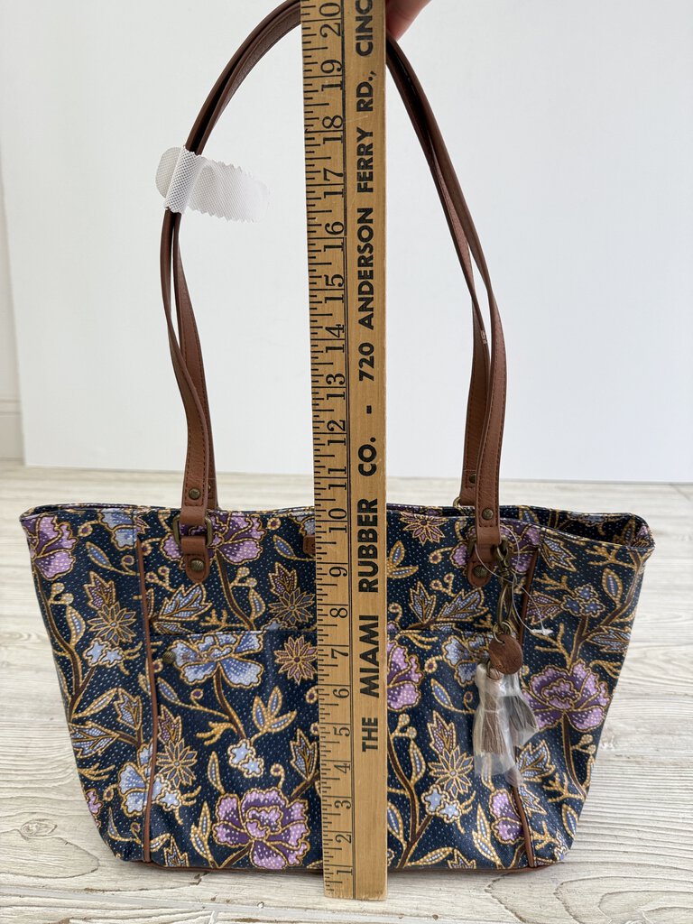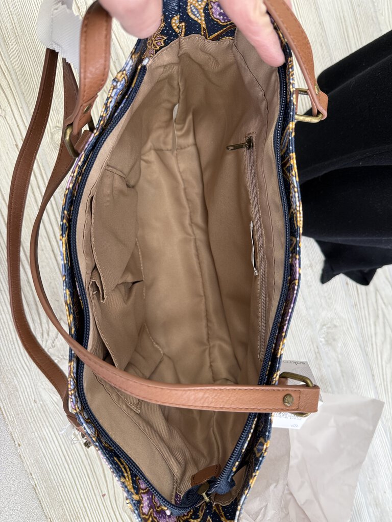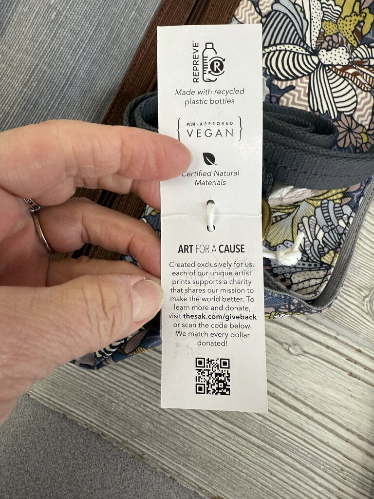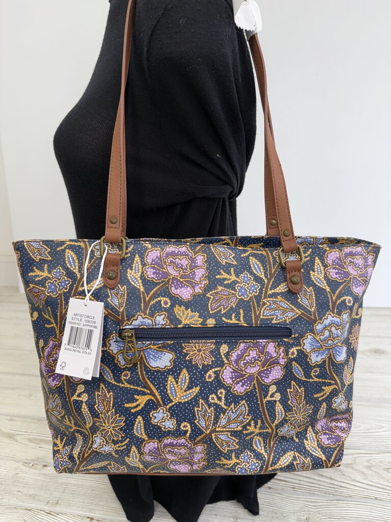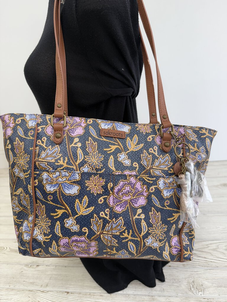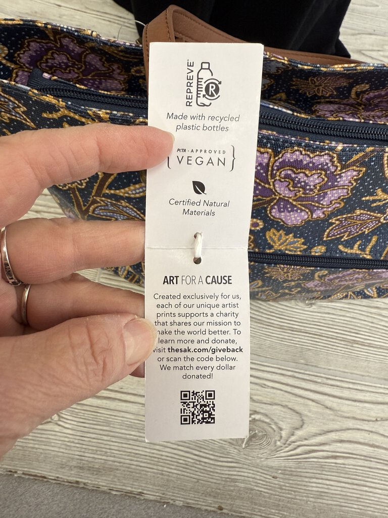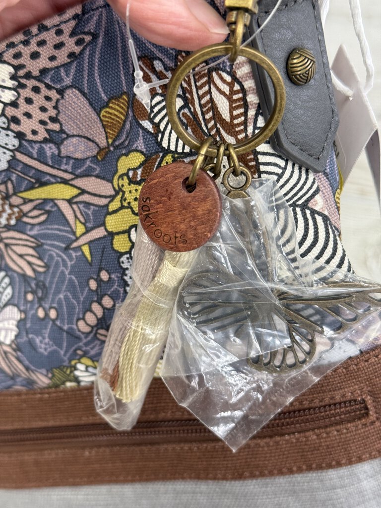 The Sakroots Art for a Cause handbag/purse. From the Artist Circle style 108339 in Sapphire Blue floral print. Purse retails for $79.00. Double strap, exterior zipper and pouch pockets. Interior zipper and pouch pockets. Key ring fob with butterfly charm and tassels. Purse measures 9.5” deep with a 11.5” x 4” base. New with original tags.