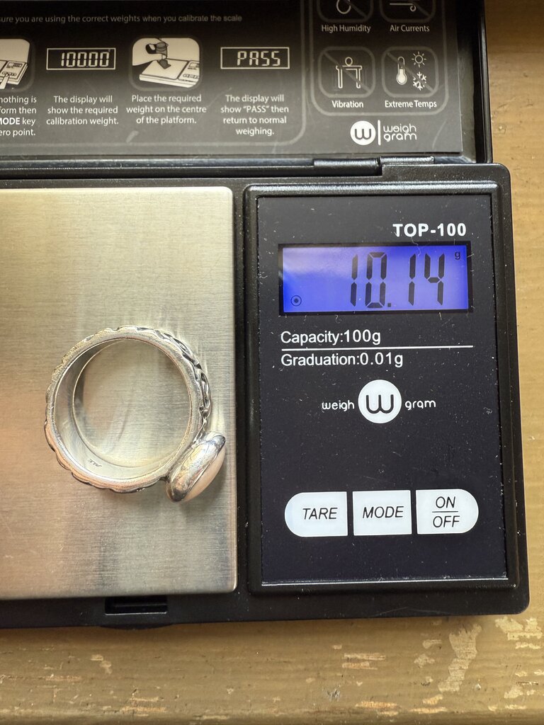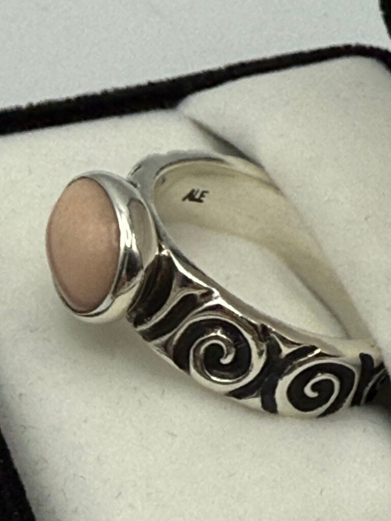 Scrolled Sterling Silver Band with a horizontal set Pink Shell Cabochon stone. Size 9.5, gram weight is 10.14 grams. Raised setting holds the Light PInk stone/shell. Estate ring, hallmarked on the inside of band ALE and 925. No damage found.