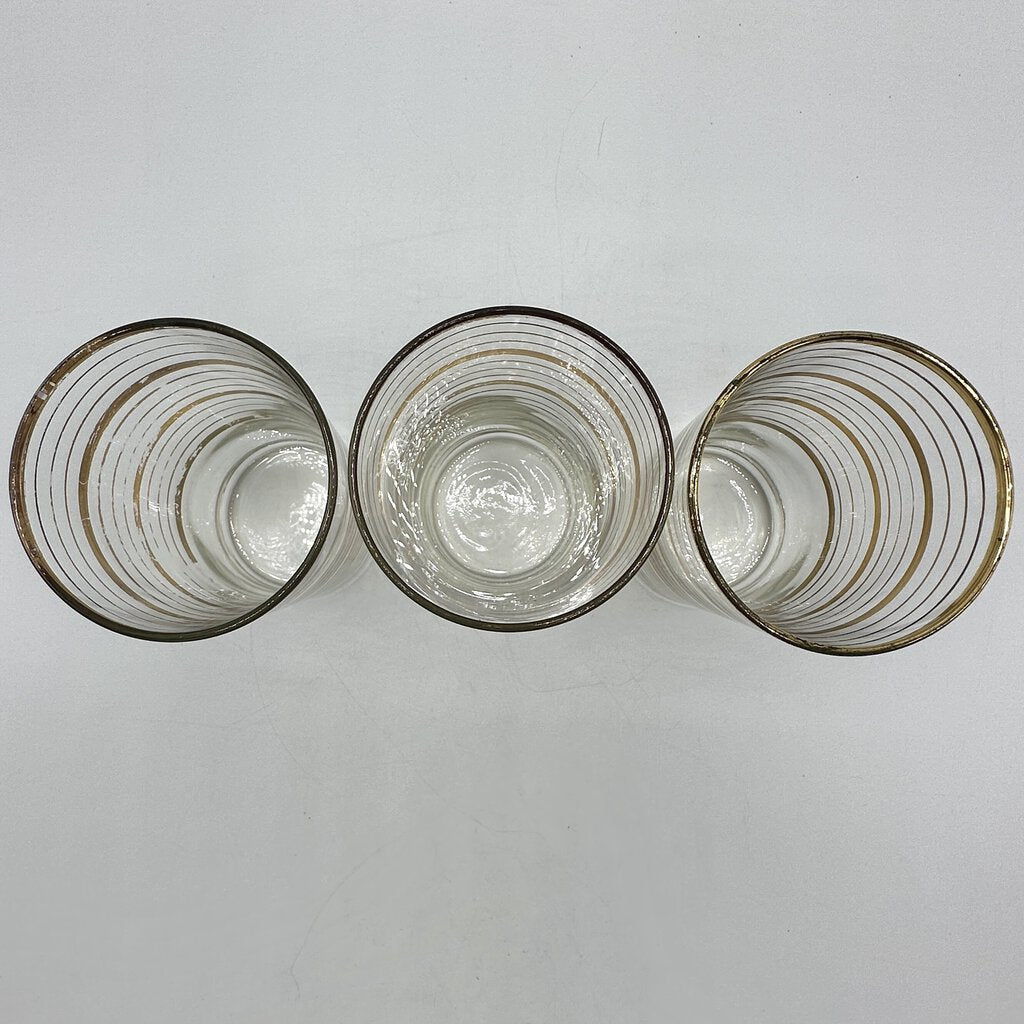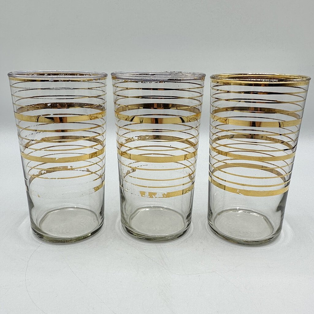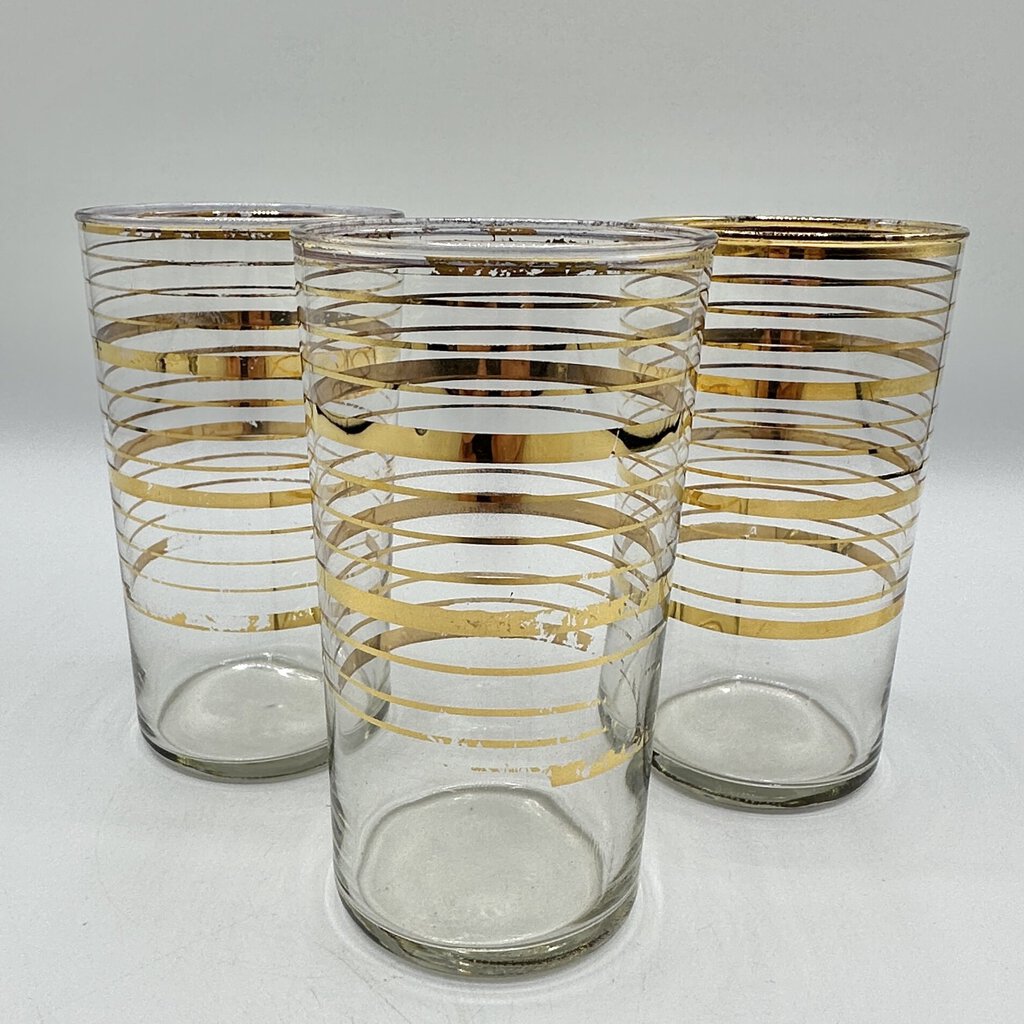 Elevate your vintage barware collection with this set of 3 Mid Century highball glasses. Each 4 1/2inch glasses features 9 narrow and 4 wide gold bands. Time and use have worn away some of the gold trim, but that just adds to the charm of these lovely and elegant vintage glasses.
