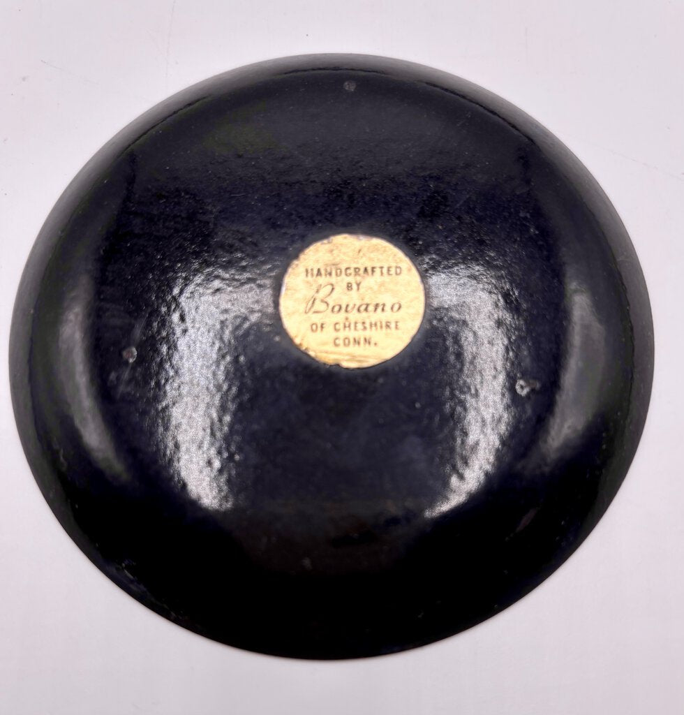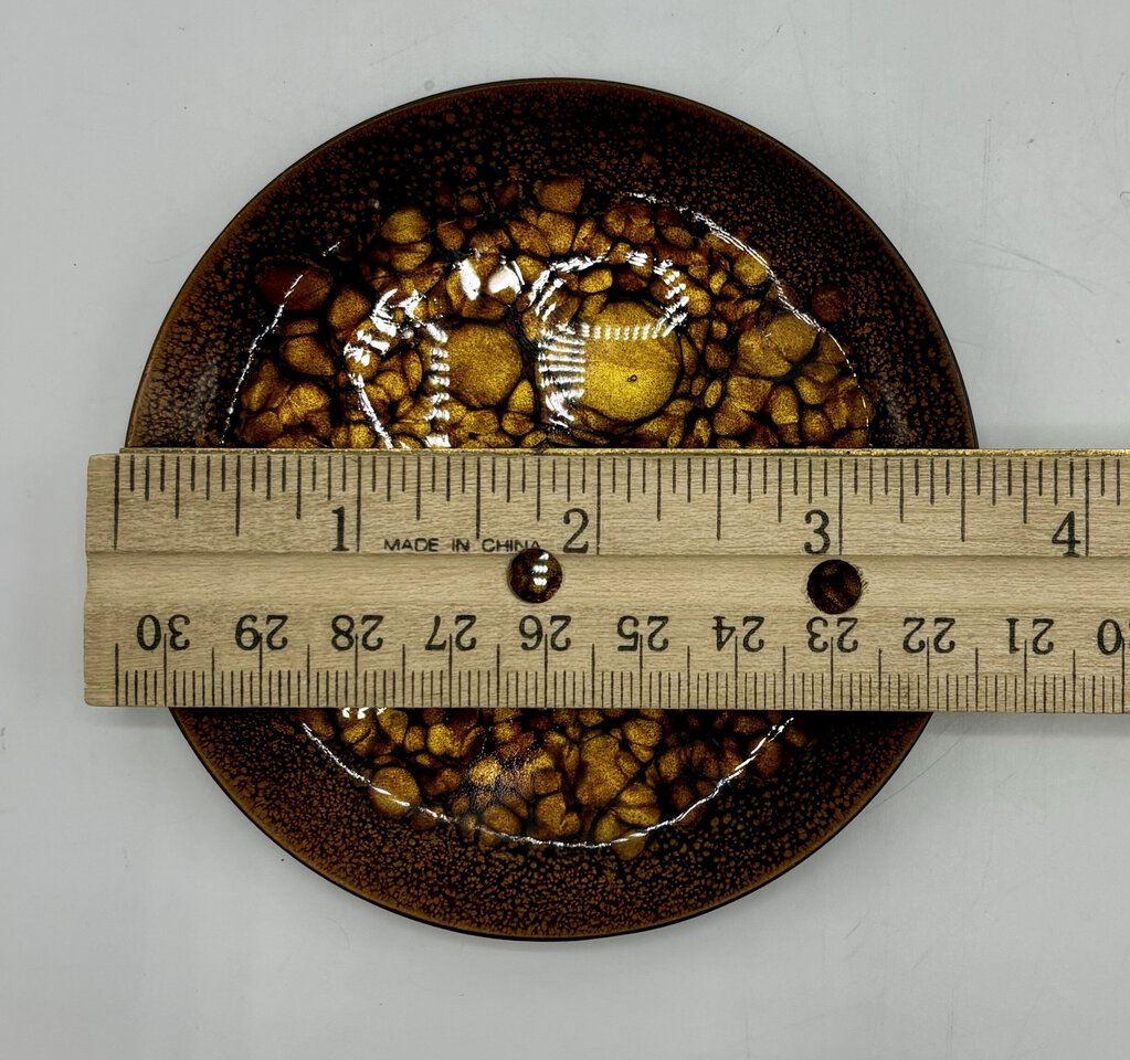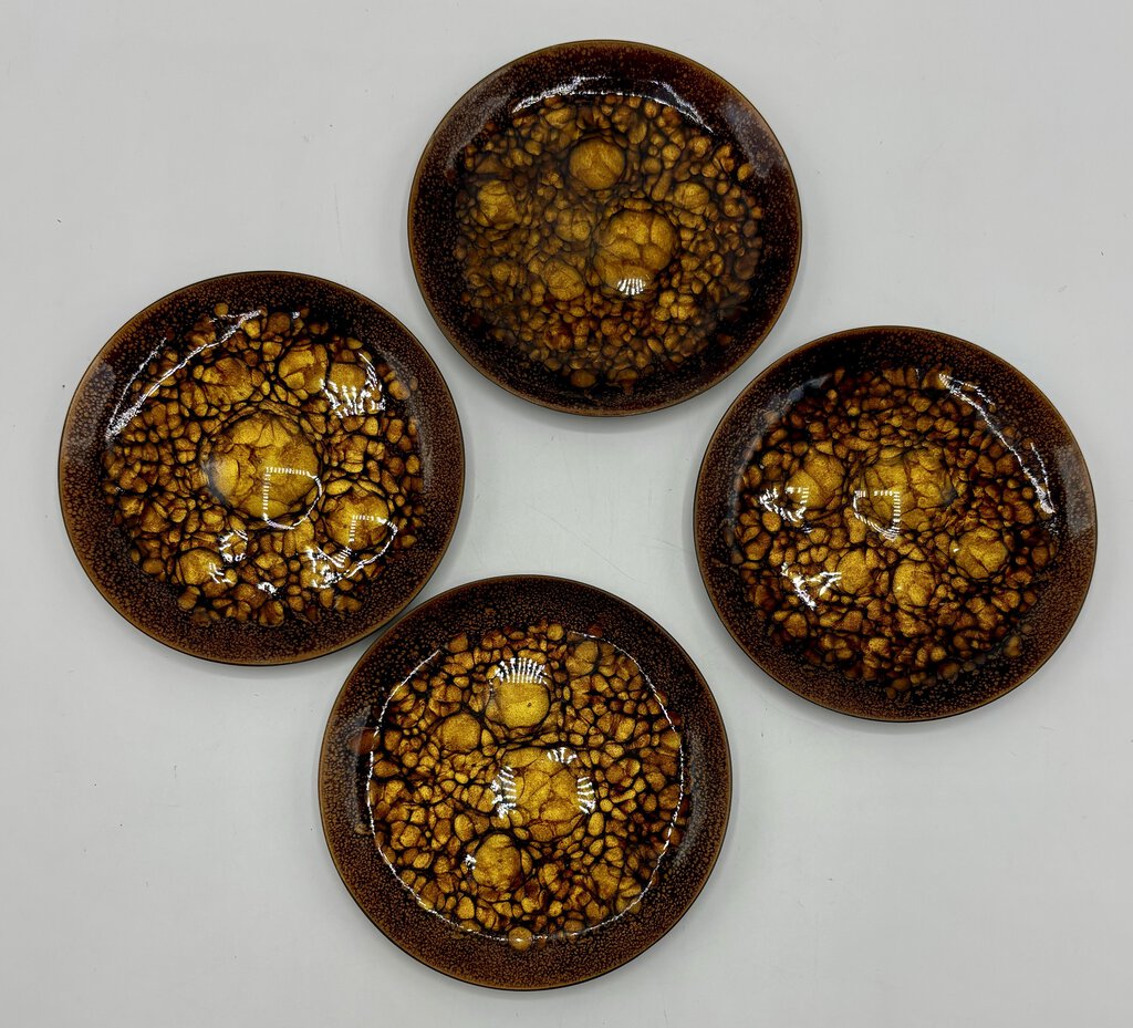 Beautiful set of copper enameled coasters handcrafted by Bovano of Cheshire Conn. The coaster are in rich browns and golds. They are 3 5/8 in diameter. The coasters are pre-owned but show no visible signs of wear.