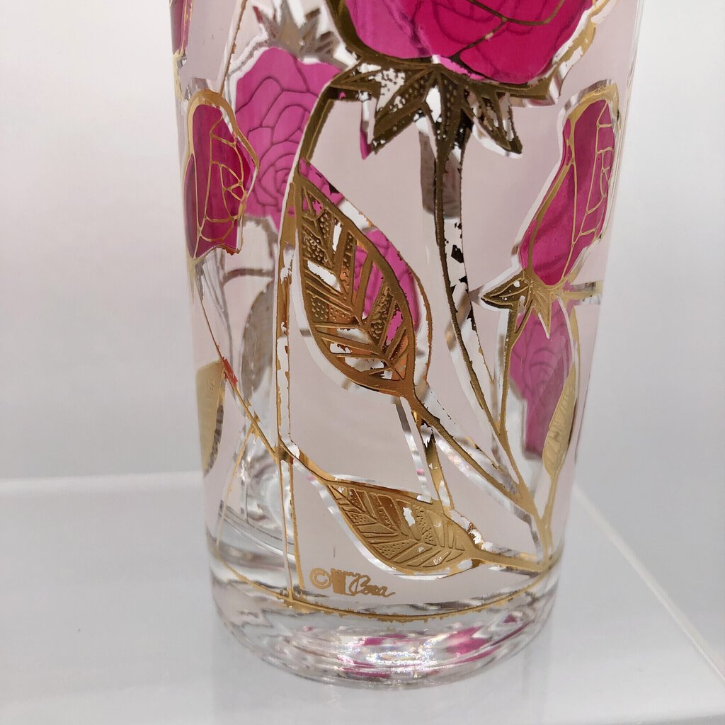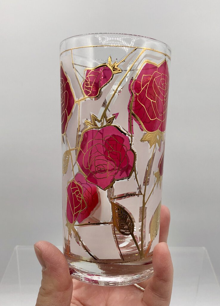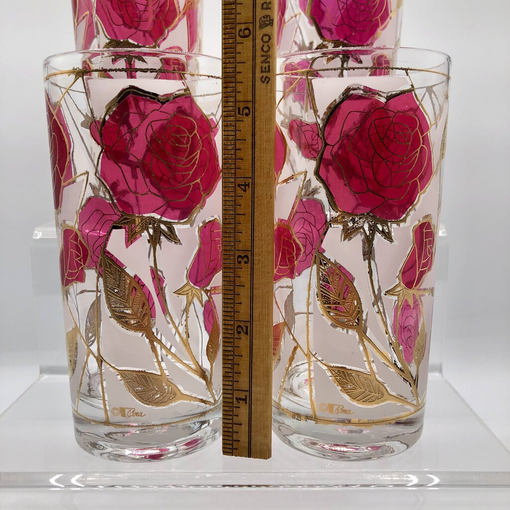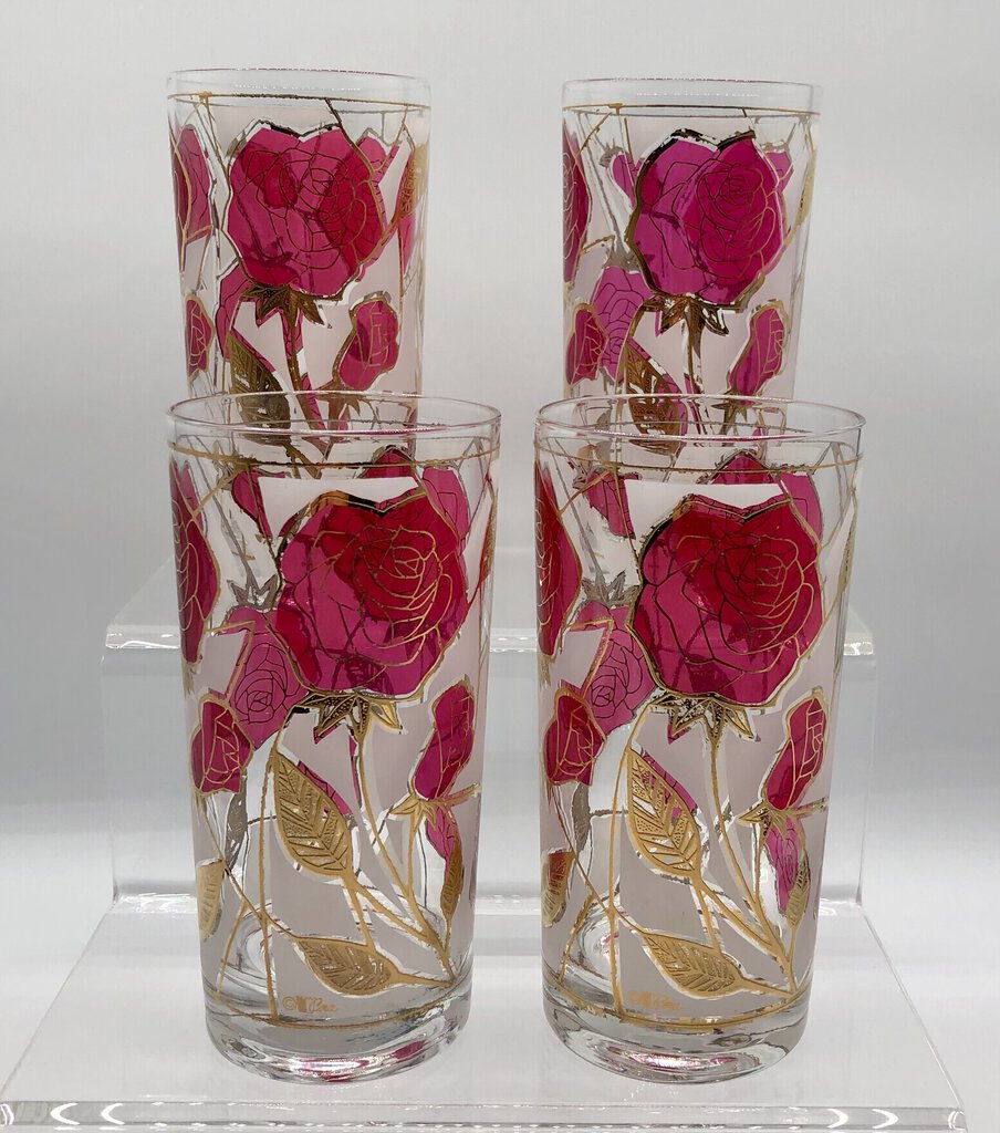 Great set of 4 mid century collectible glasses, all decked out with blooming roses with 22k gold accents. Made by Cora.