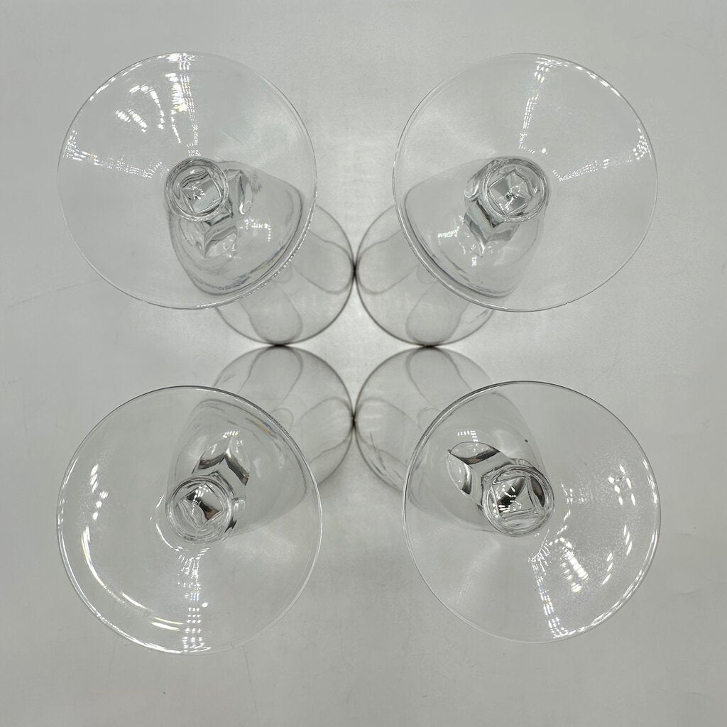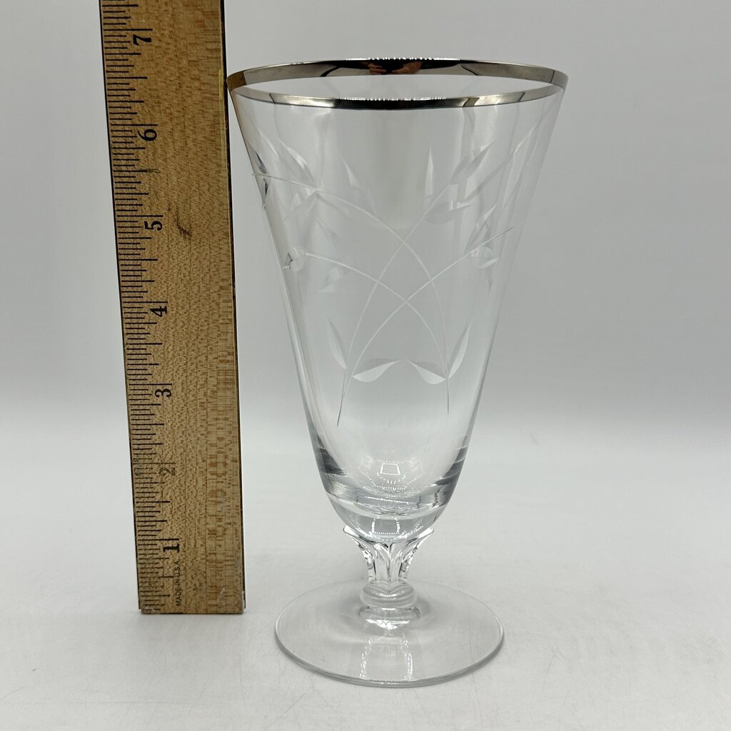 Set of 4 vintage Fostoria Bridal Belle iced tea glasses. They were made by Fostoria from 1957 until 1973 and feature a beautifully cut leave motif, and platinum trim on stem 6072. The glasses are 6 1/2” tall and have a 3 3/4” diameter. They are in wonderful vintage condition, no chips, cracks, or scratches, no wear on the platinum trim. They appear unused. Please carefully review all photos for condition details.