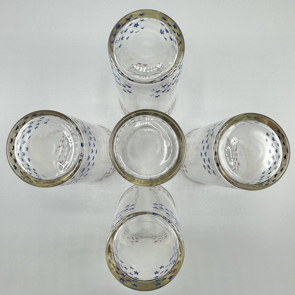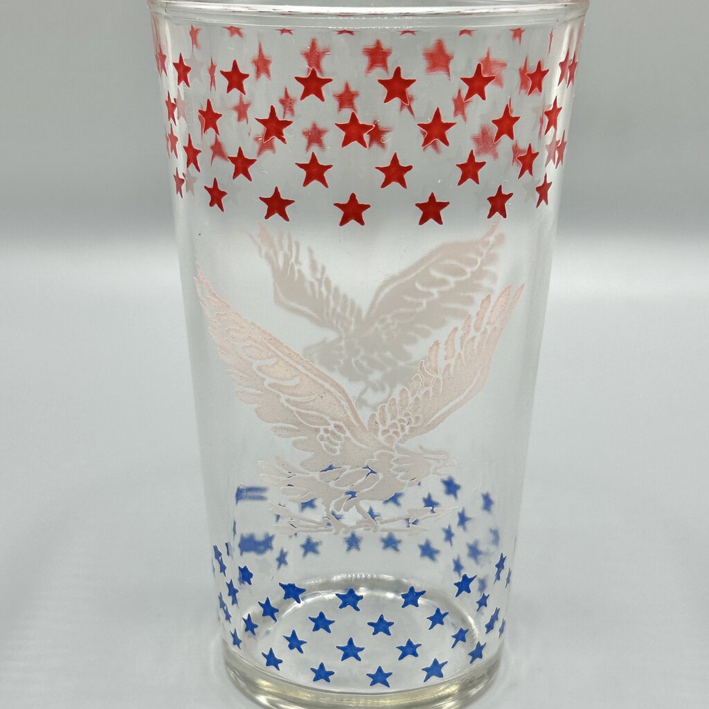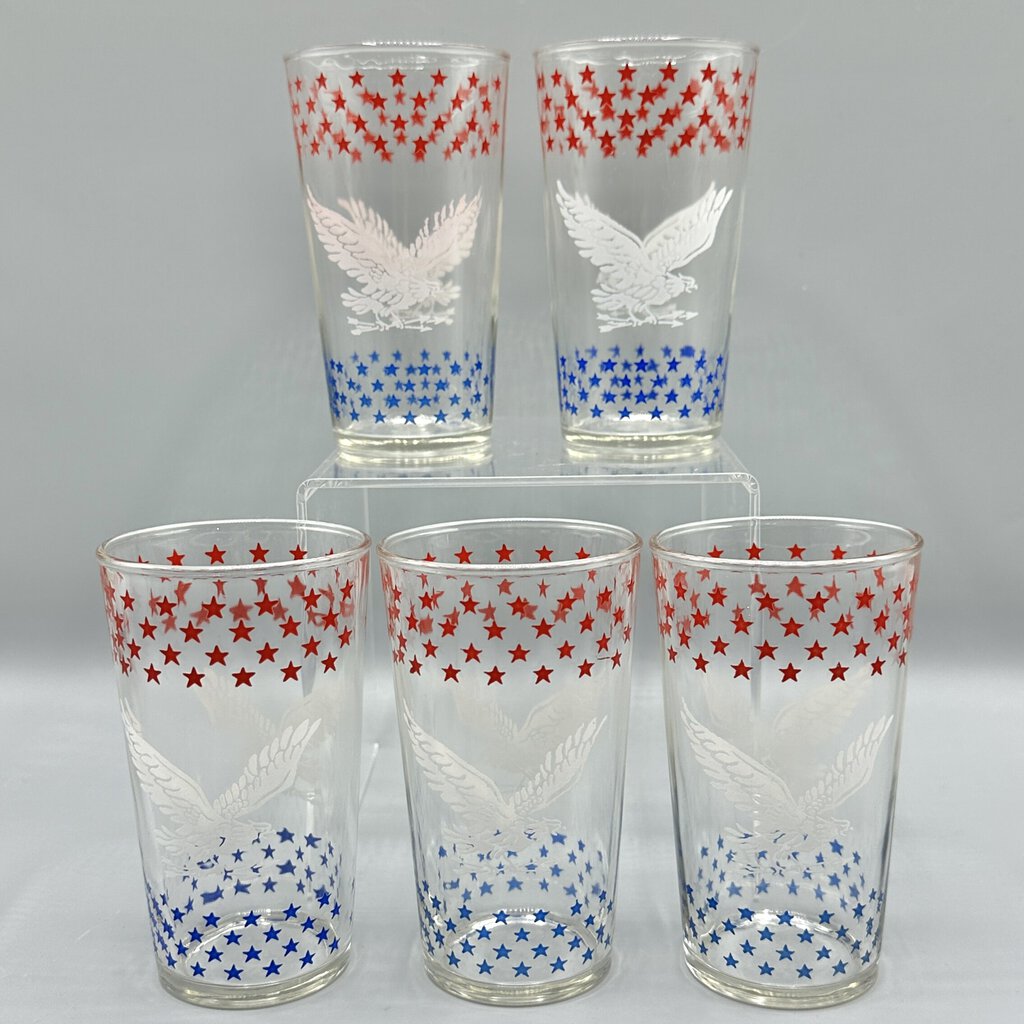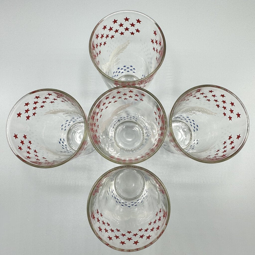 Set of 5 vintage glass tumblers featuring red and blue stars and a white soaring eagle. They measure 4 1/2 inches tall and have a 2 1/2 inch diameter. In very good vintage condition, no chips, scratches or cloudiness. The eagles on one glass have a slightly pink tint. Please see photos for condition details.