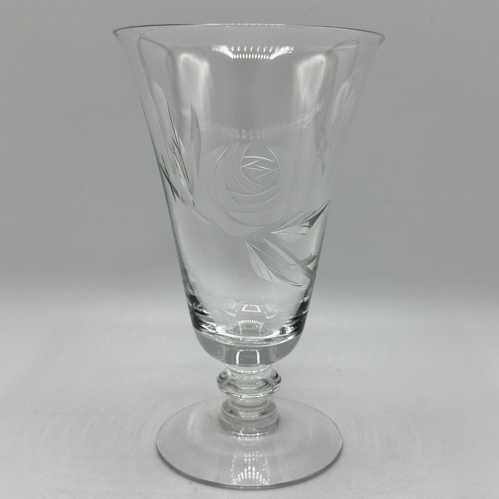 Bring a touch of timeless elegance to your table with this lovely set of 5 Rose by Fostoria footed ice tea glasses. Crafted between 1951 and 1973 they are true vintage pieces. Each goblet features a delicate rose gray cut into the glass. 6” tall with 3 1/2” diameter. They are acid signed on the bottom. In very good vintage condition with no chips or scratches. Minimal age and use appropriate wear. Please see photos for condition details.