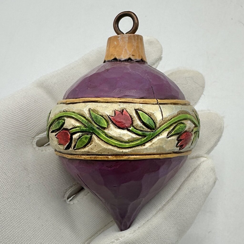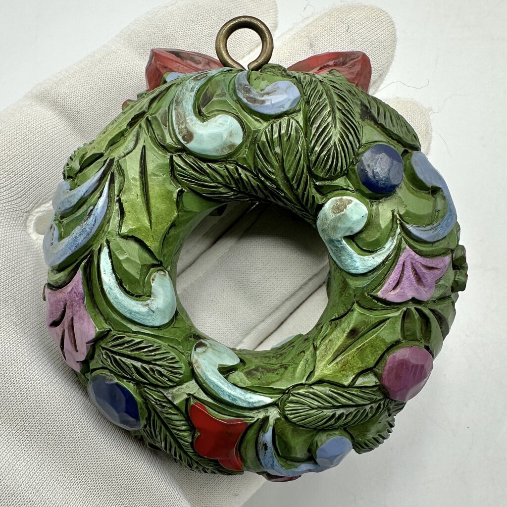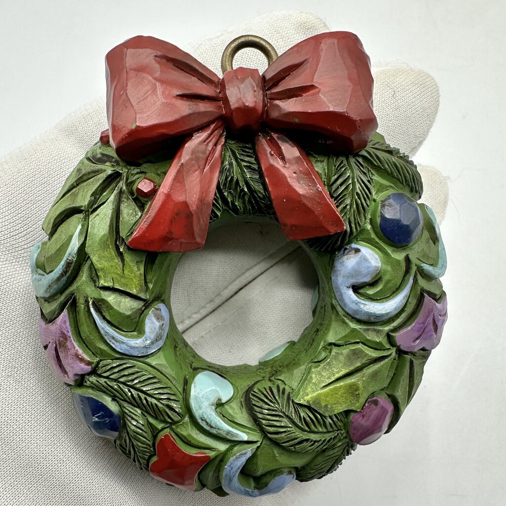 Set of 9 charming Jim Shore Heartwood Creek hanging Christmas ornaments. They are made of resin and feature the intricate whimsical folk art designs Jim Shore is known and loved for. There are 5 bauble and tear drop ornaments as well as a Santa, a snowman, a wreath and a Christmas tree. They measure from 2 to 3 inches and are in very good pre owned condition. They are sure to become a treasured part of your Christmas tree decor. Please carefully review all photos for condition details.
