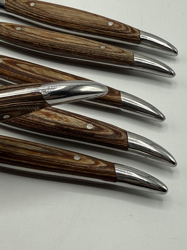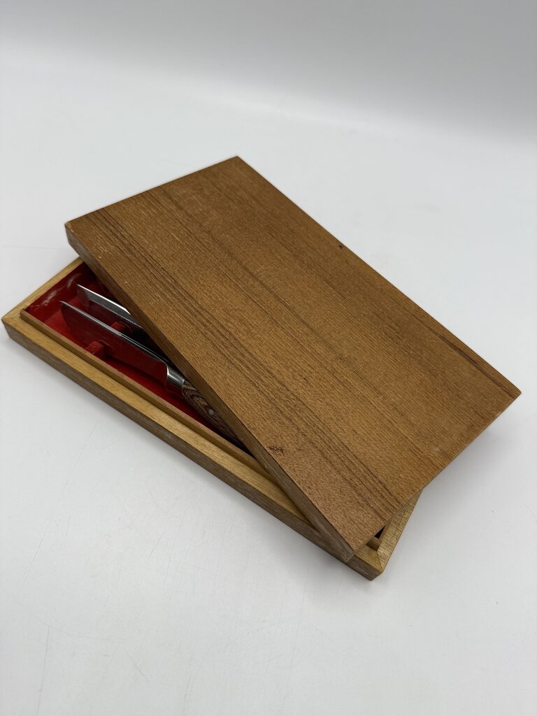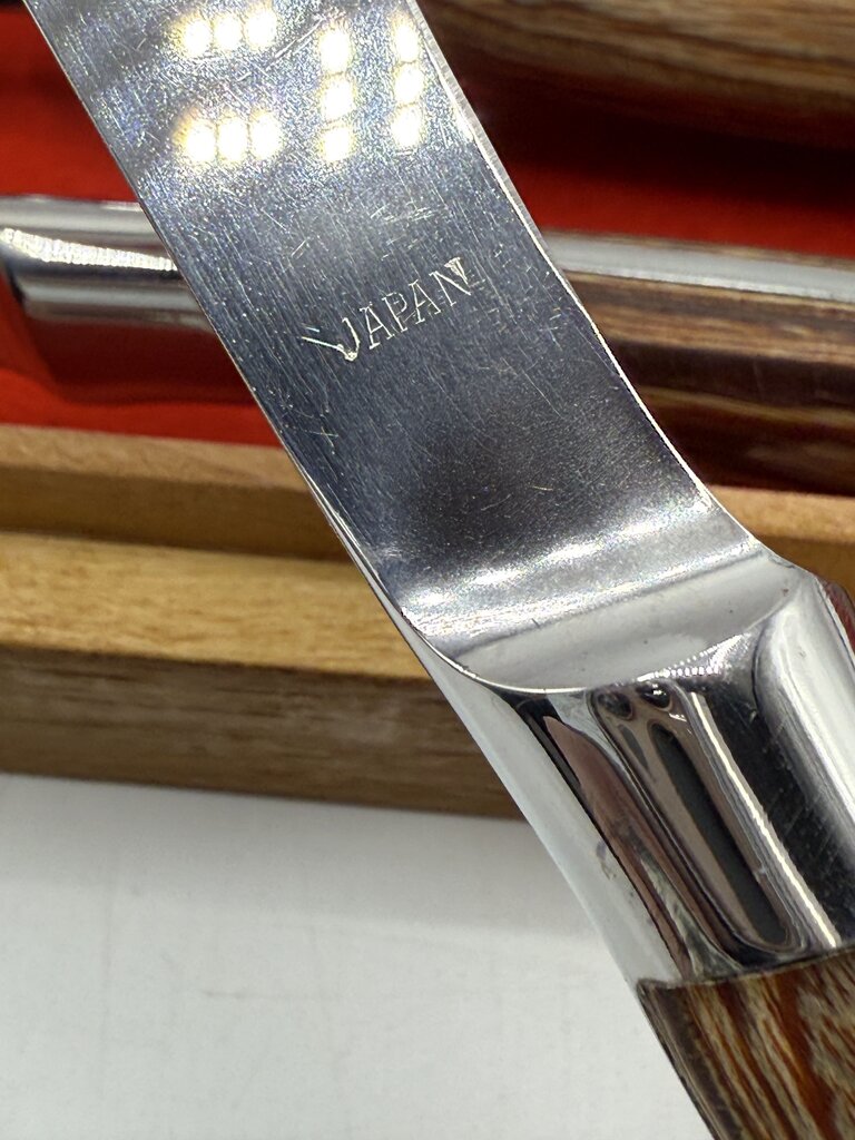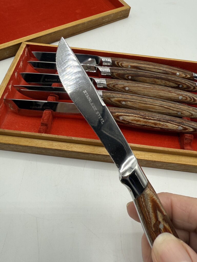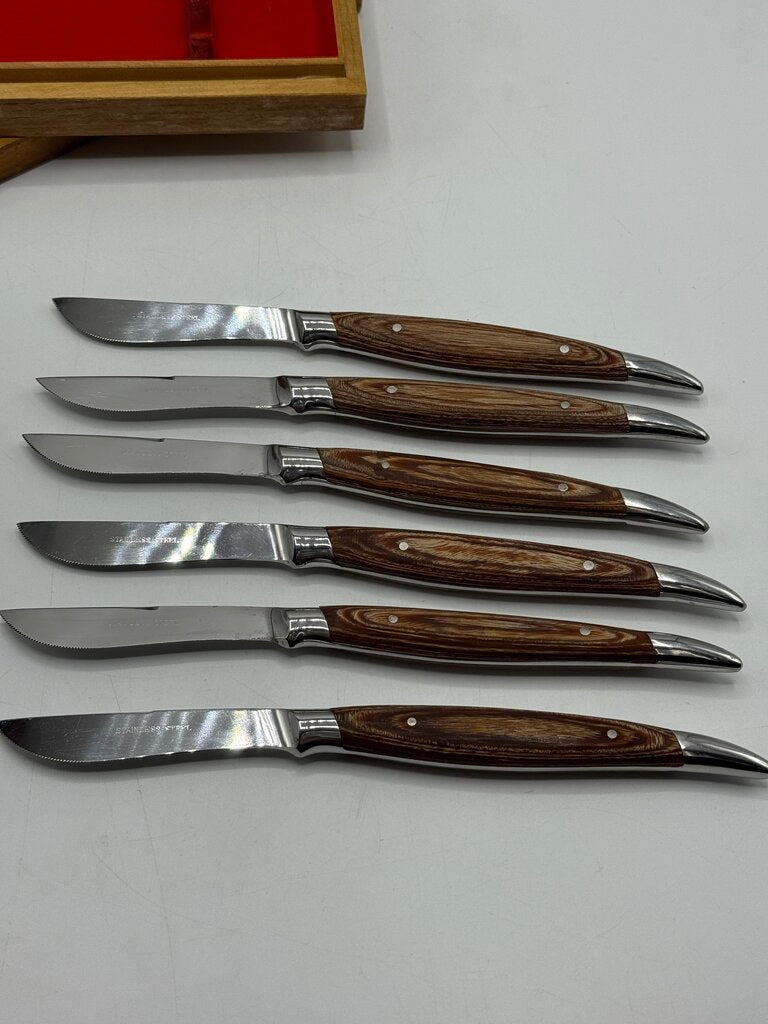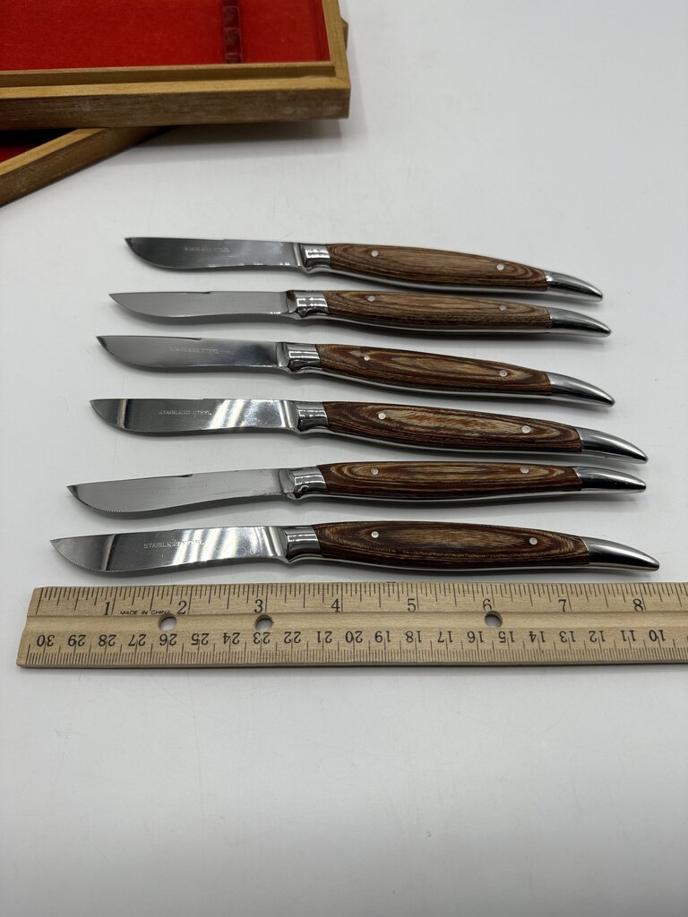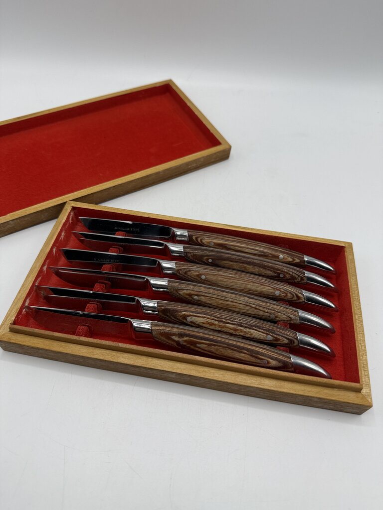 Vintage set of six Hull stainless steel blade steak knives set with wood handles. Blades look rarely used, still sharpe. Nice ergonomic feel to knife when held in hand. In original wood storage box. Made in Japan.