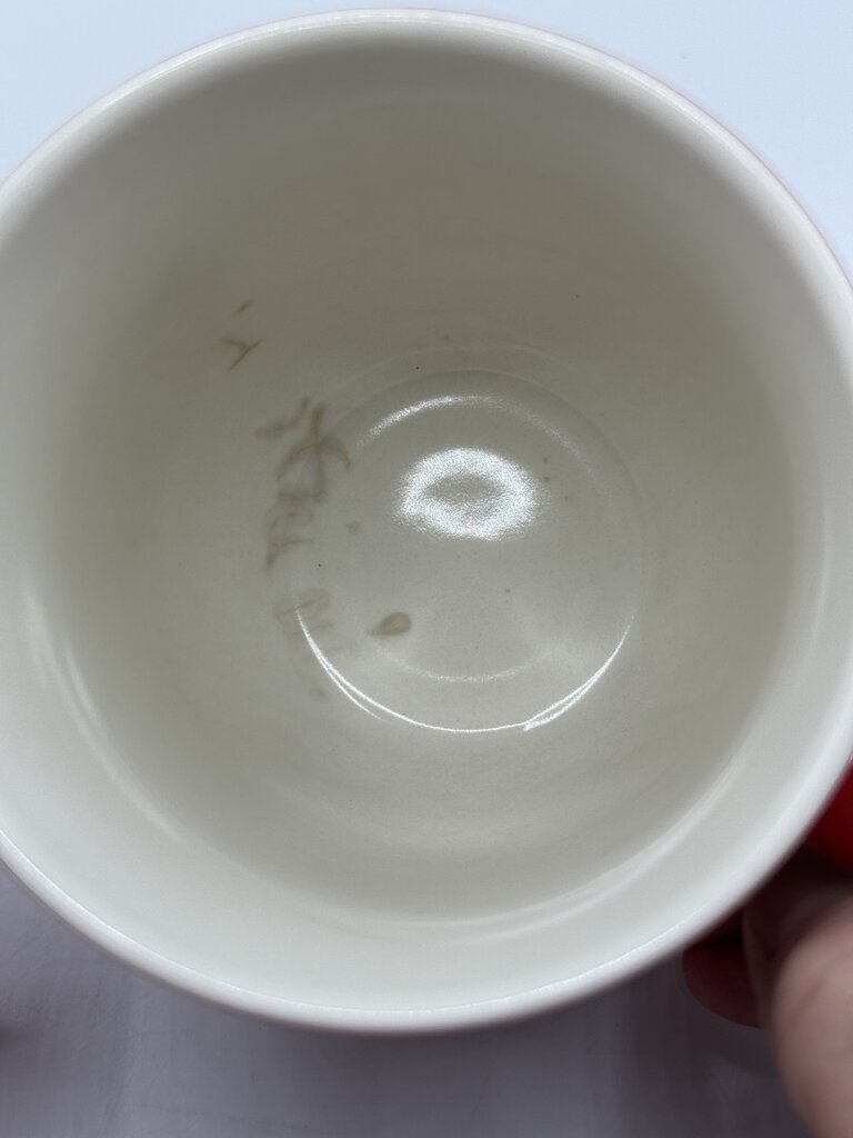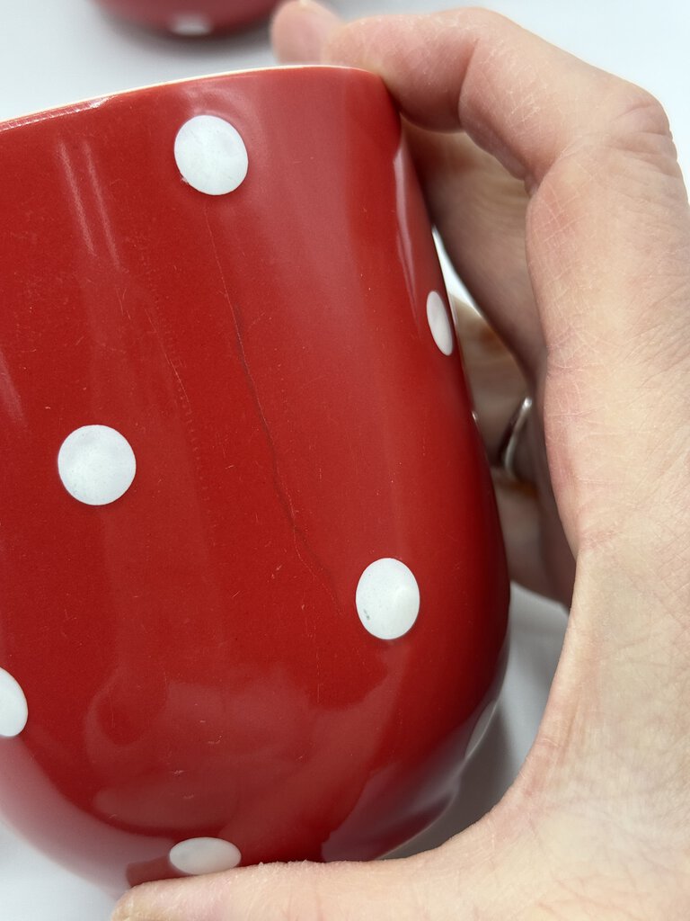 This is a Spode mug from the Baking Days collection, featuring a red and white polka dot pattern. It is perfect for adding a touch of charm to your kitchen or dining table.Mugs measures 4” tall and 3.25” in diameter. No chips or cracks.