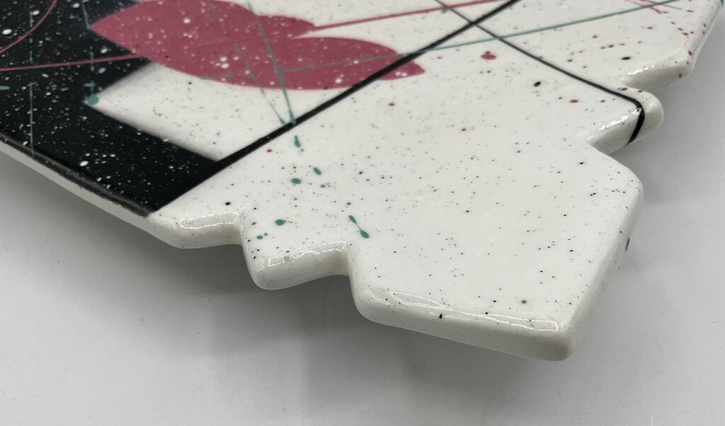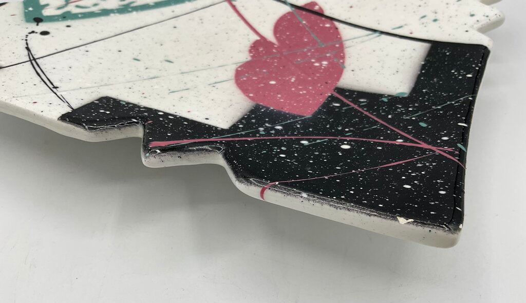 This dish was produced in Starship Studio and signed by the studio’s founder, Rosalyn Tyge. This piece is absolutely incredible and so unique, featuring an abstract 80s/90s finish and pattern, as well as sawtooth notches on the edges of the dish. This piece is in excellent condition, please carefully review all photos for overall condition. Item measures 9 3/4” by 8 1/2” by 1 5/8” and weighs 1 pound and 12.4 ounces. Estate item. Condition is pre owned. Ships USPS Ground Advantage Mail.