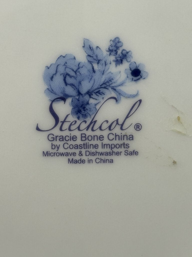 Charming set of 5 matching 7.5” in diameter plates by Stechcol Gracie Bone China in a blue and white floral pattern. Estate set, like new condition, no chips, cracks, utensils scratches or stains.