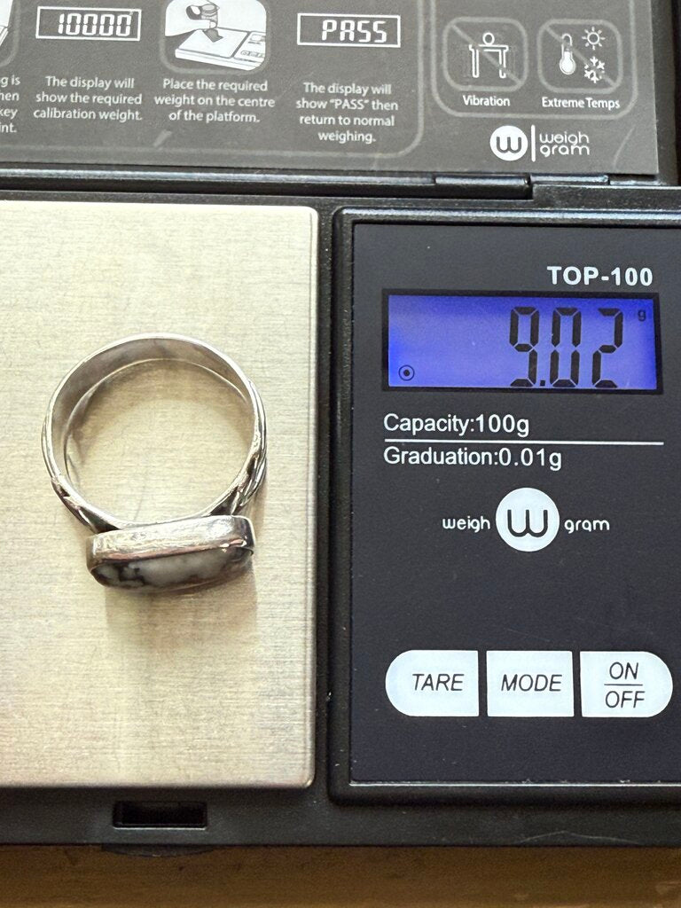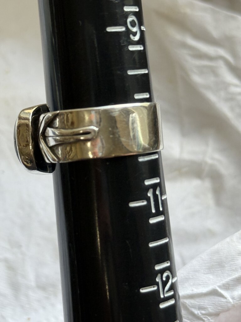 Unisex Sterling Silver Ring with Black and White natural Stone that has a metallic sheen to it. Wide band with side details that leads the horizontal raised mount stone. Ring size is a 10 and gram weight is a little over 9 grams. Light marks in silver from prior owner.
