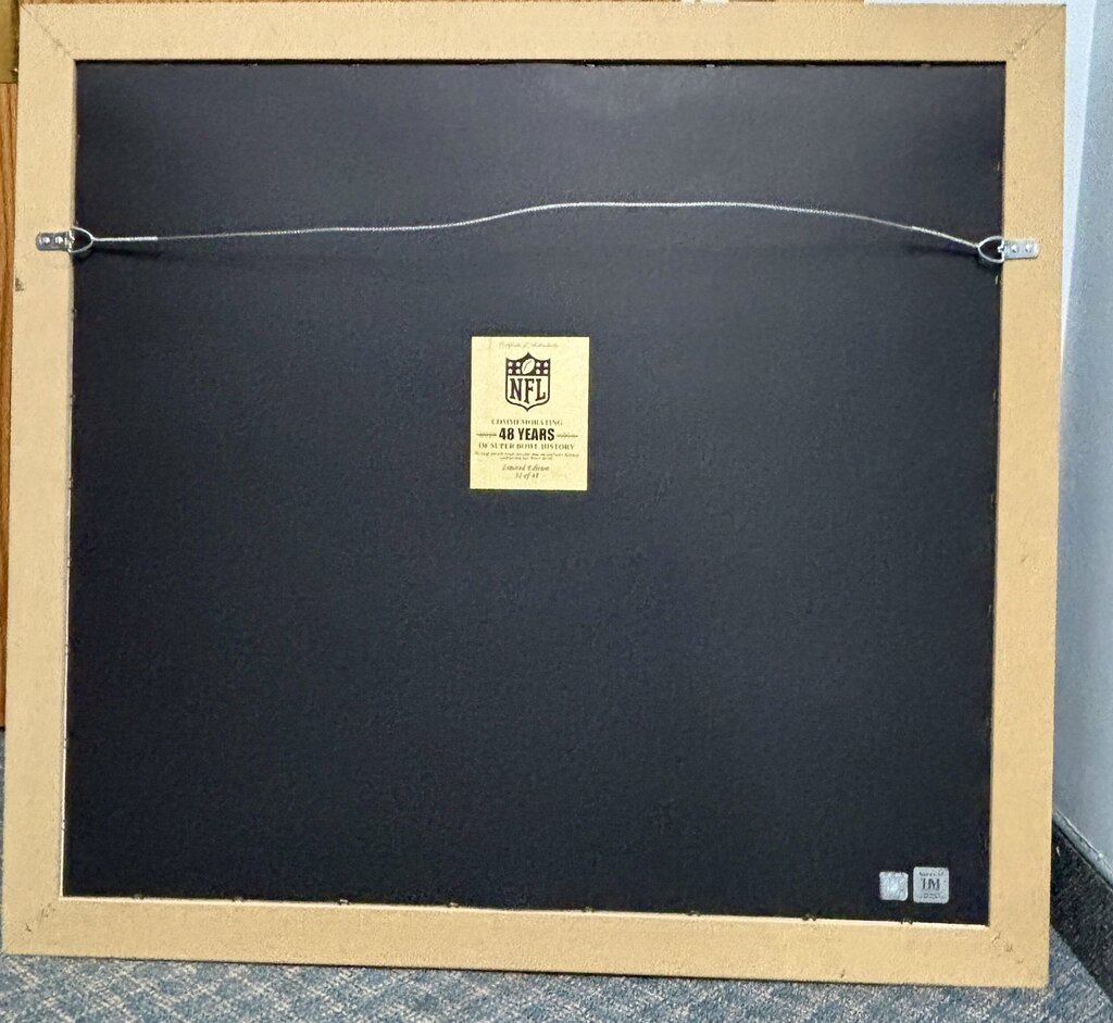 The product is a collection of Super Bowl medallions produced by Highland Mint, showcasing the NFL teams and their respective Super Bowl wins. Each medallion represents a year from 1967 to 2018, making it a complete set of 48 coins one for each Super Bowl. The coins are mounted and beneath each coin is tells the teams playing, the final score and the MVP of the game. This set of coins is number 32 of 48 made. The set and frame measure 39x36”. The collection comes from a collector’s estate. Please review photos for details and don’t hesitate to ask questions. Local Pickup Only!