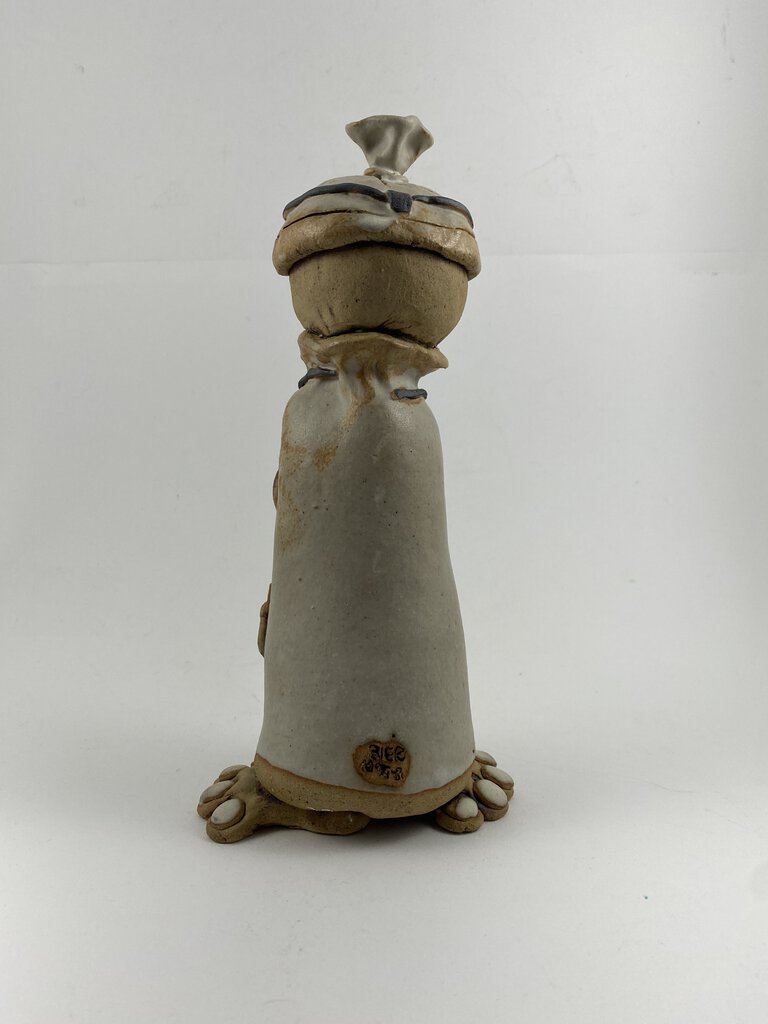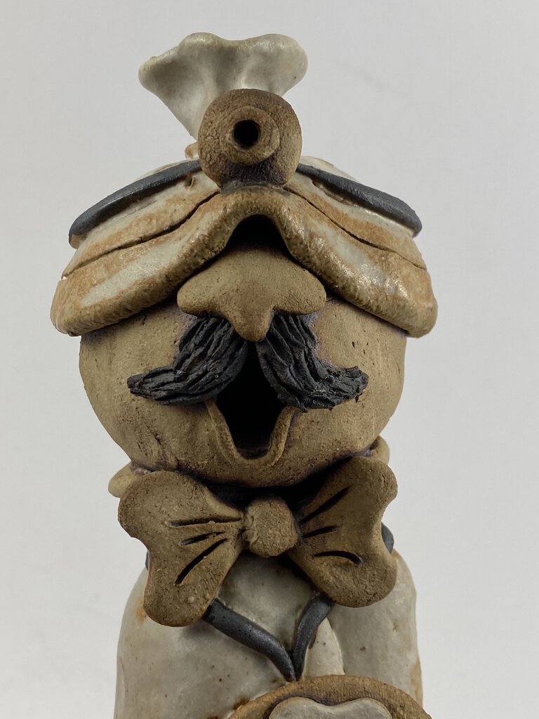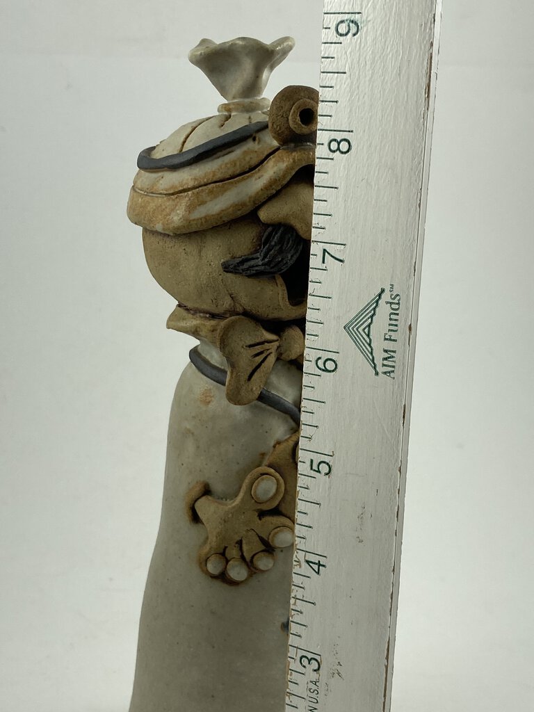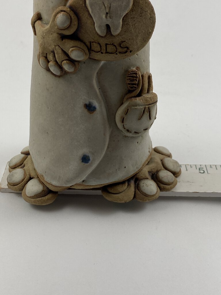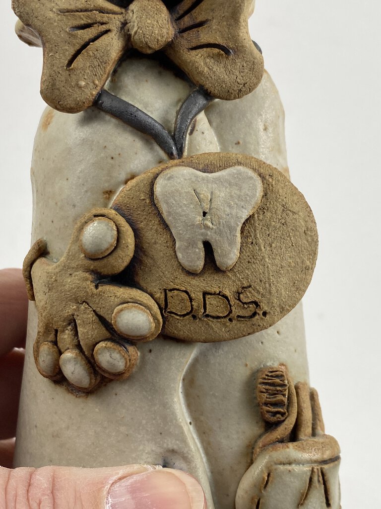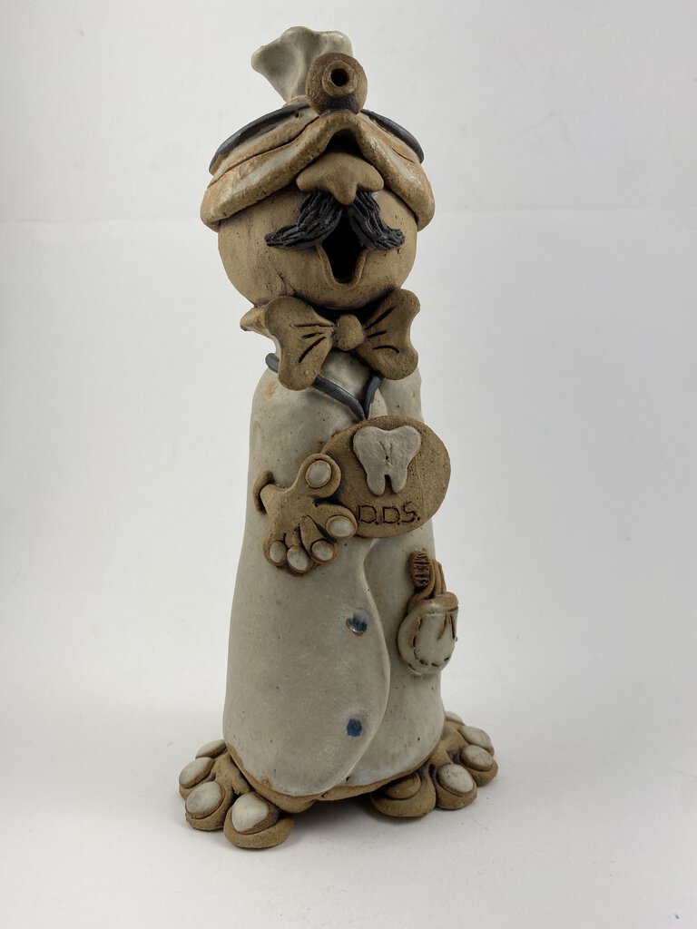 This Sculpture is of a Dentist and created by the artist Tami Bier Of Bier Studio Pottery in Michigan. The Sculpture is approximately 9” tall and the base feet measure 4.5” by 2.75”. A Fun and whimsical piece of art for your favorite Dentist!