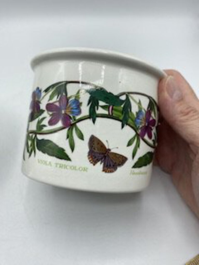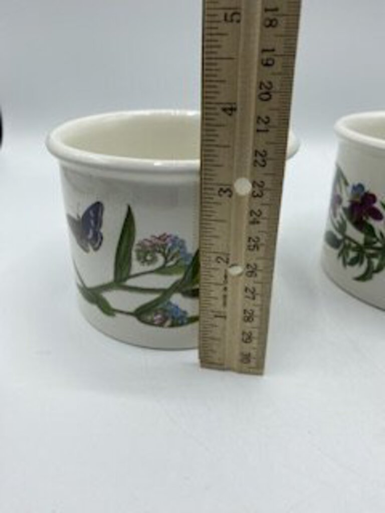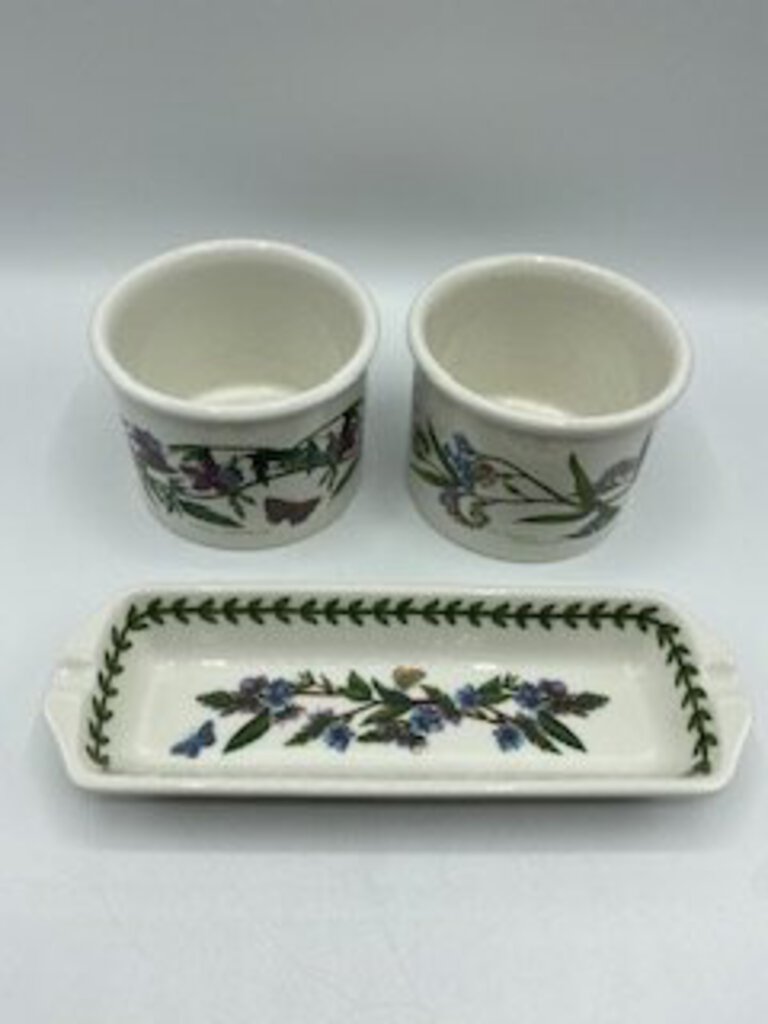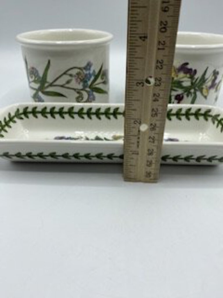 Estate set of 3 different patterned The Botanic Garden Series - Portmeirion dishes. Two bulb forcing pots, one in the Viola Tricolor and one in the Forget-Me-Not pattern. One Corn Cob holder dish in the Forget-Me-Not pattern. Bulb Pots are 4” in diameter and 3.25” deep. Corn cob holder dish is 9” long 3” wide and 1” deep. Combined weight of set is 2 lbs. 6 ounces. No chips or cracks in dishes. Bulb Pot interiors show some staining from use.