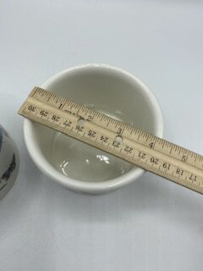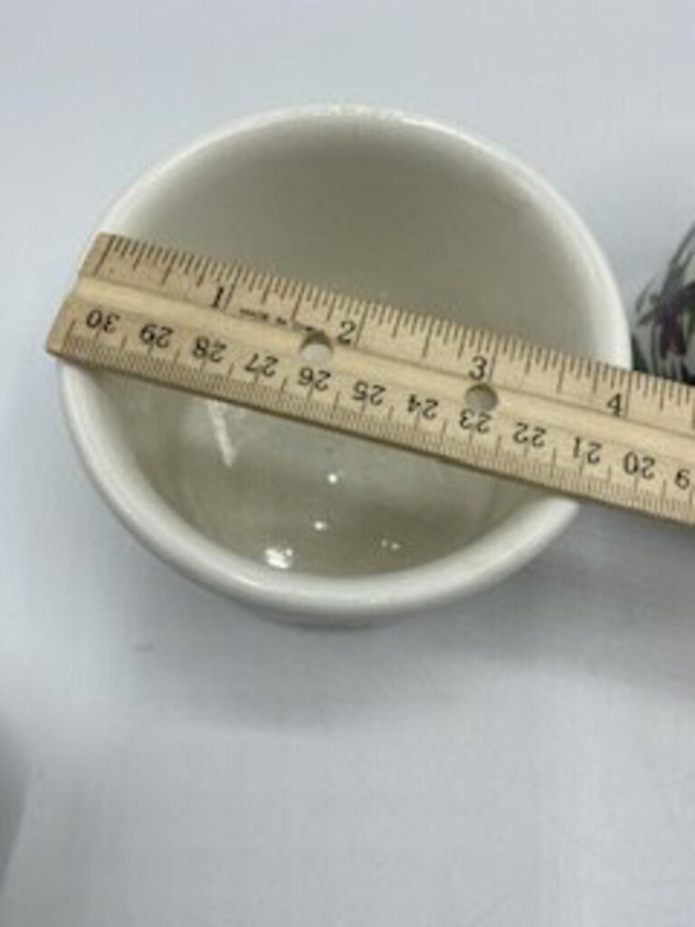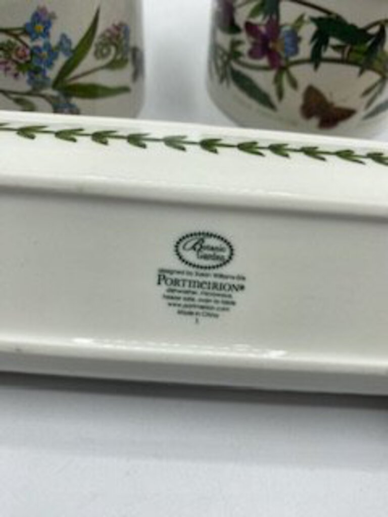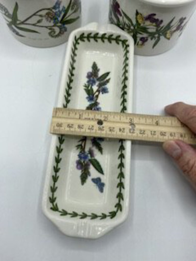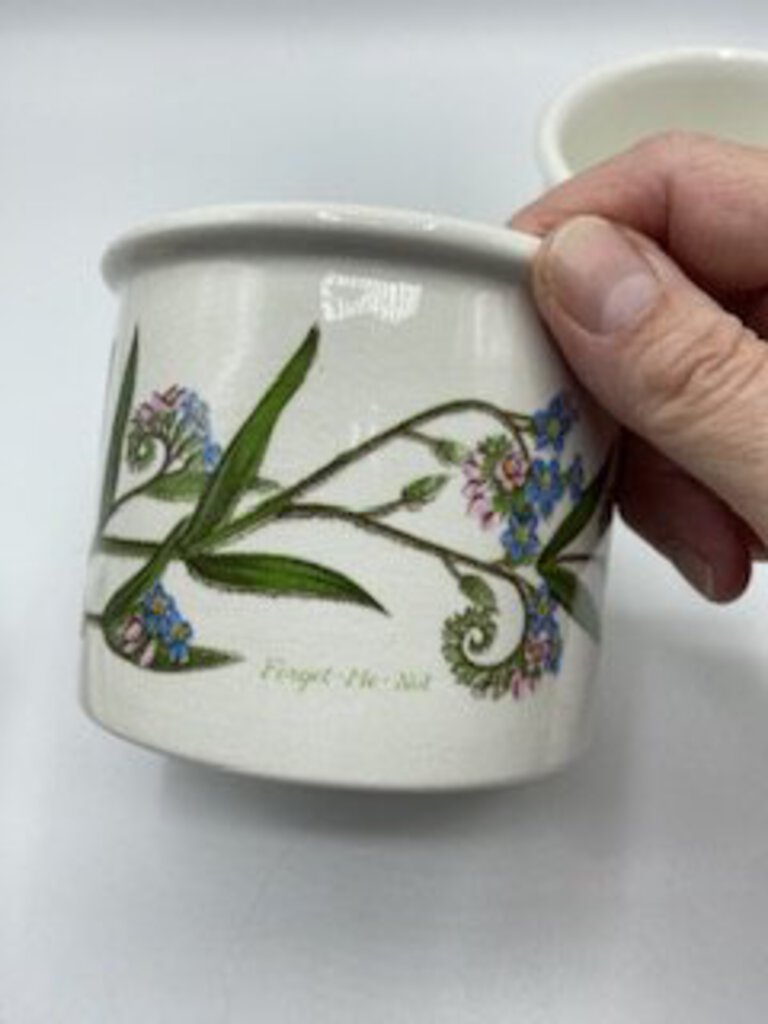 Estate set of 3 different patterned The Botanic Garden Series - Portmeirion dishes. Two bulb forcing pots, one in the Viola Tricolor and one in the Forget-Me-Not pattern. One Corn Cob holder dish in the Forget-Me-Not pattern. Bulb Pots are 4” in diameter and 3.25” deep. Corn cob holder dish is 9” long 3” wide and 1” deep. Combined weight of set is 2 lbs. 6 ounces. No chips or cracks in dishes. Bulb Pot interiors show some staining from use.