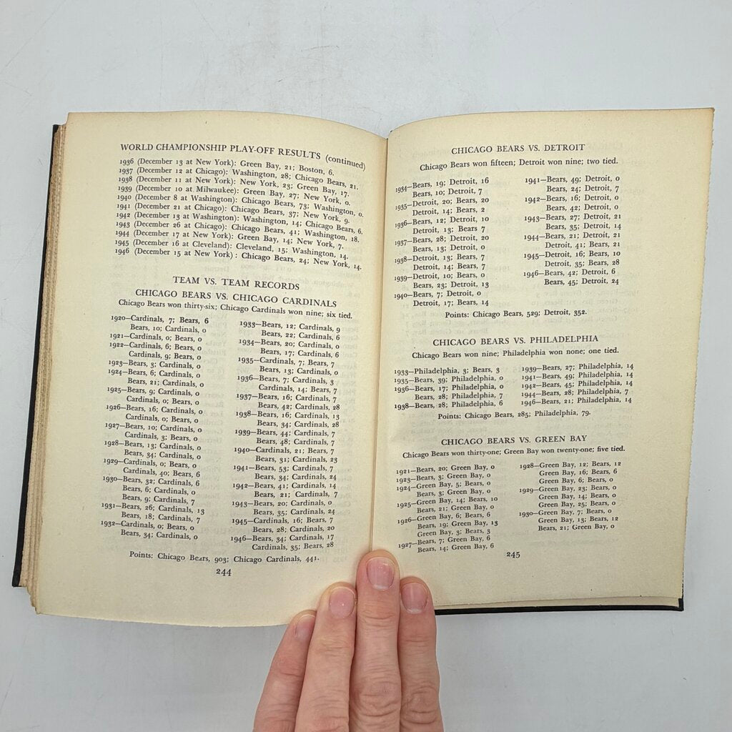 The Chicago Bears by Howard Roberts, published in 1947 by G.P. Putnam’s Sons. First edition, hardcover, cloth bound, 248 pages, no dust jacket. This is the earliest known comprehensive history of the franchise and covers the team’s story from its founding up to the mid 1940s. Includes photographs and standings.