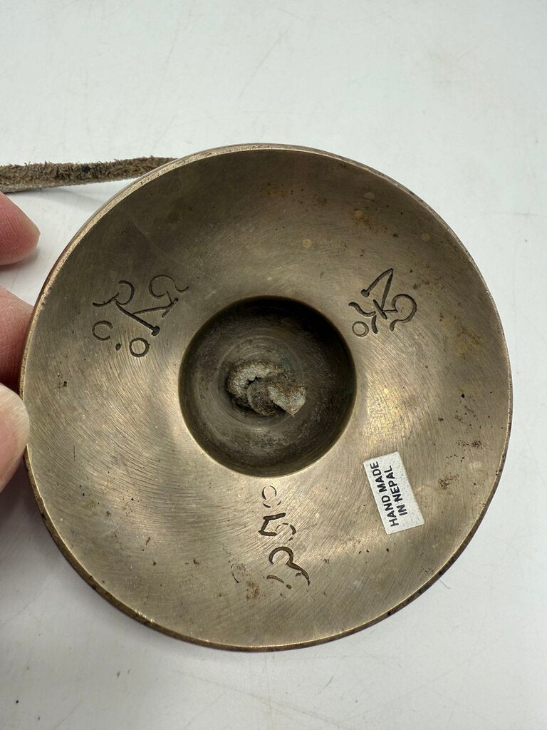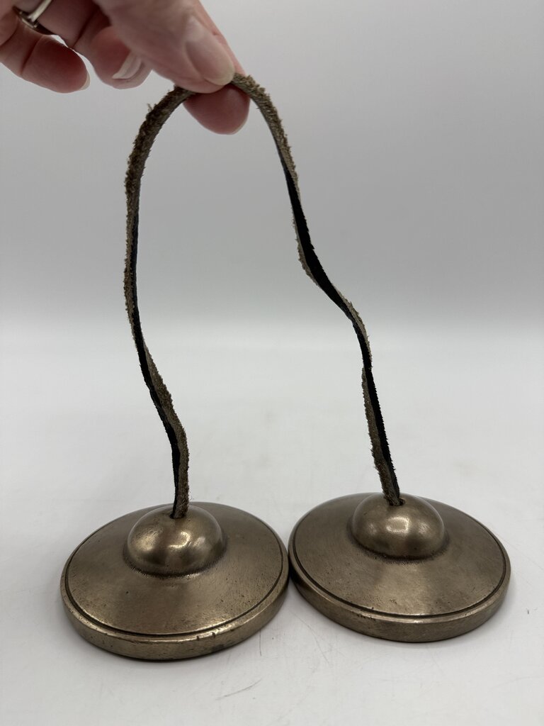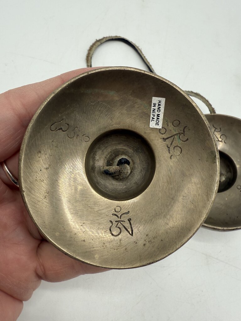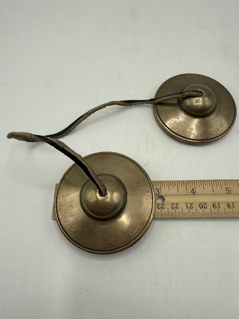 Solid brass Tibetan Tingsha Cymbals made in Nepal. The 2 Cymbals measure 2.75” in diameter and are tied together with an 11 inch leather lace. Nice sound when they chime.