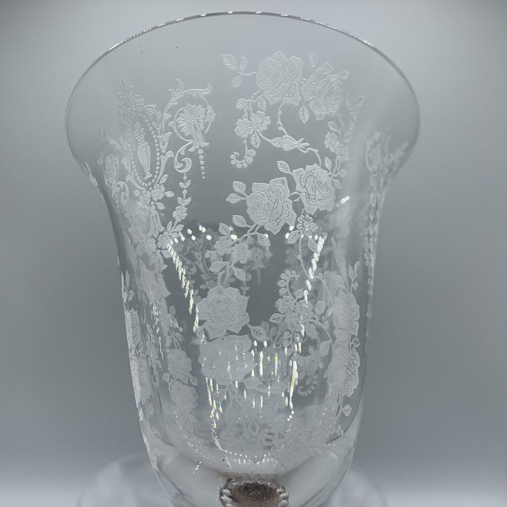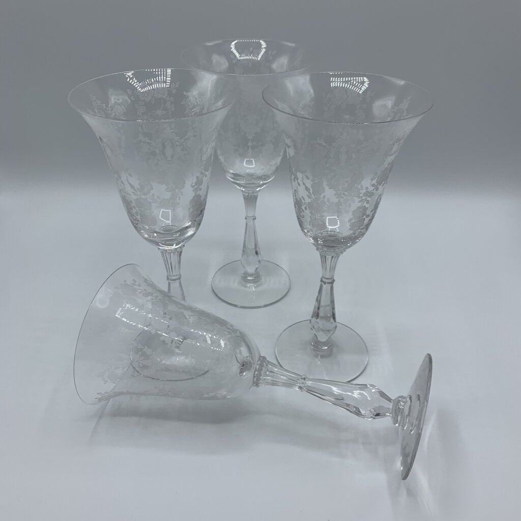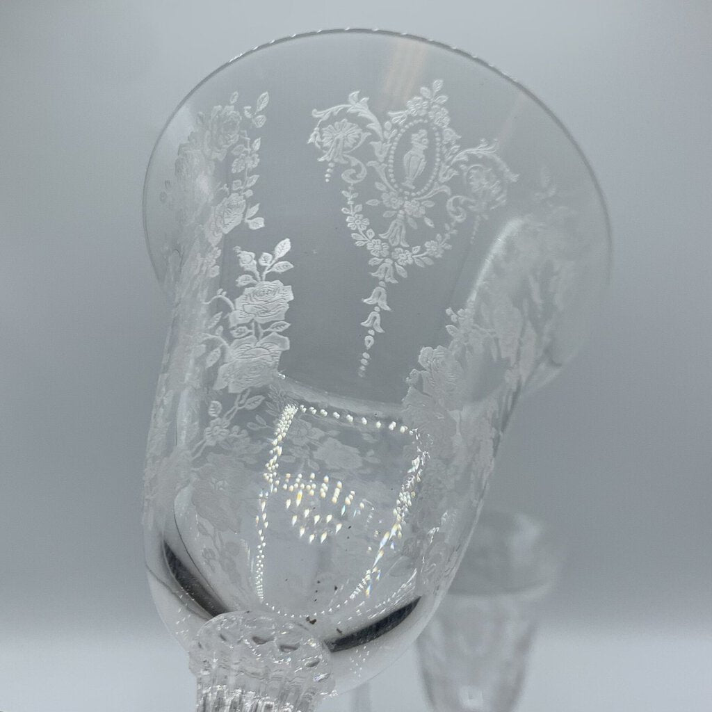 So much vintage charm on these intricately etched water goblets made by Tiffin in the Cherokee Rose pattern. First made in the 1930s, the etching was inspired by an intricate French lace pattern that was very popular with brides of that era. This pattern is very similar to Cambridge’s Rose Point. The etching is nearly identical, but the stems of the glasses are different.