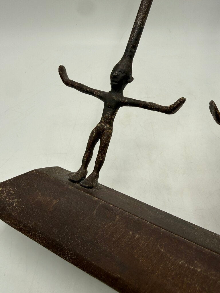 The Twin Figure Hand forged Wrought Iron Candle Holder is an abstract sculpture designed to hold candles. Made of black iron, this candle holder features intricate hand forging that adds a unique and artistic touch to any space. The dual figure design gives it a contemporary and artistic appeal, making it a decorative collectible that can enhance the ambiance of any room. Measures 12.5” without candles, and has a 7.5 x 2” base. Weight is a couple ounces shy of 2 lbs..