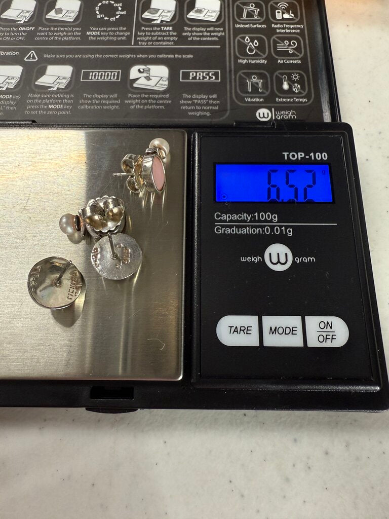 Two pairs of sterling silver pierced stud earrings. Oval Rose Quartz gemstone with a pearl accent set in sterling silver and a set of round Hemitie gemstone in sterling silver make up this set of earrings. Hemitie made in Mexico. Gram weight is 6.52 grams. Nice sterling earring backs with the rose quartz set.