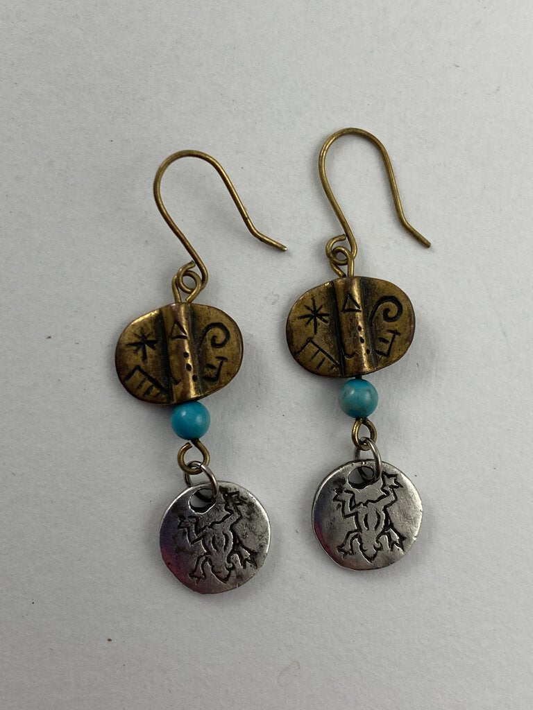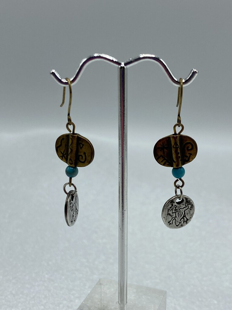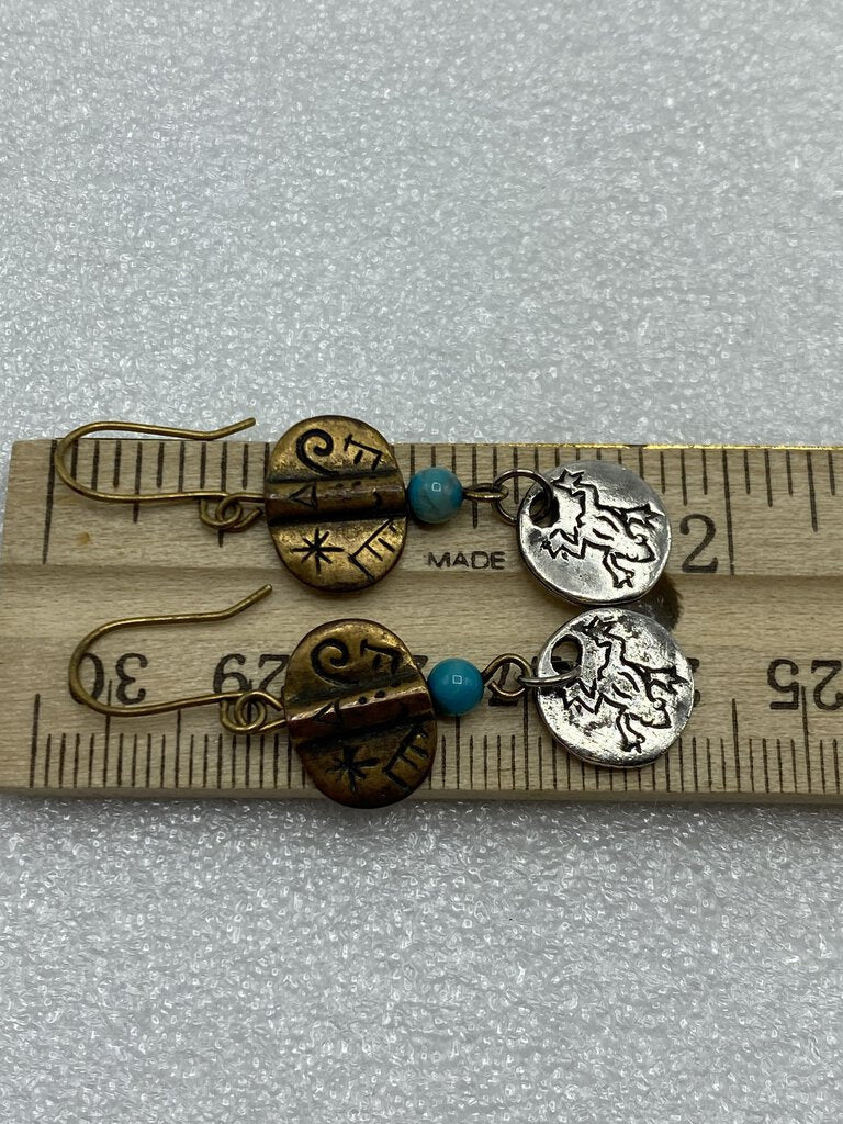 A fun set of dangle drop pierced earrings. The metal is non-magnetic, not hallmarked, but looks to be a sterling silver flat disk with a stamped frolicking frog on both sides of it. The bronze toned upper flat disk has stamped designs on it too, front and back. The disks are separated by a turquoise blue bead. No damage is found on earrings. They hand approximately 1 3/4” from ear lobe.