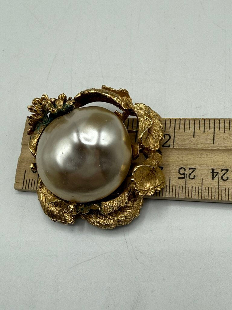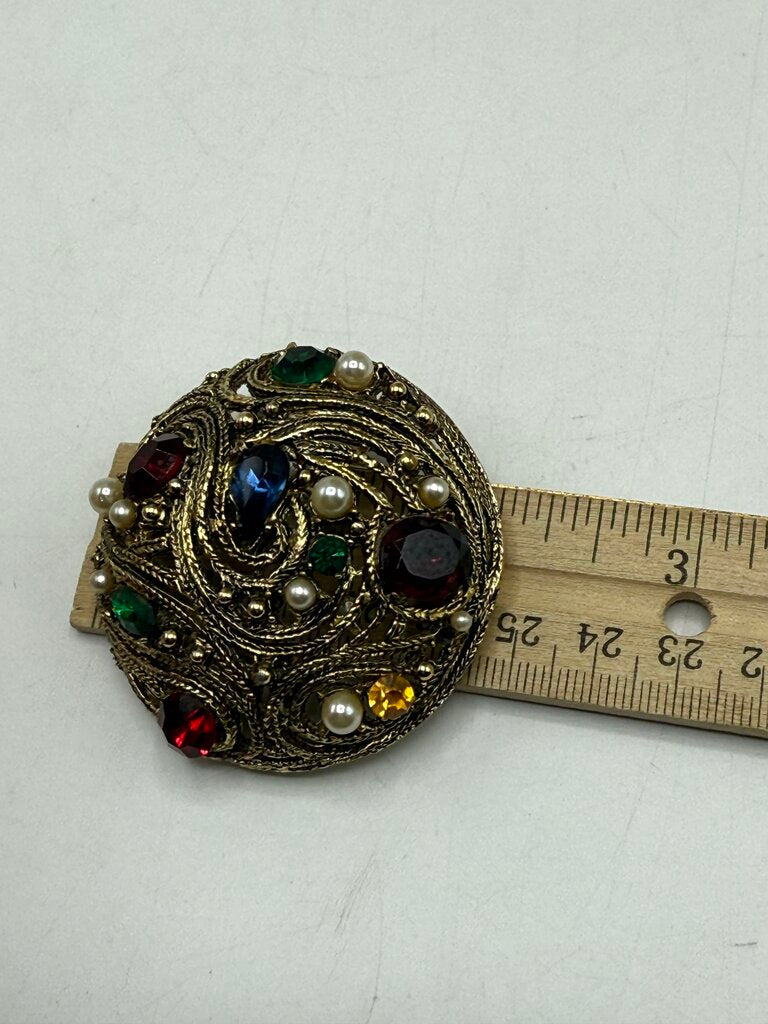 Estate lot of 3 unique vintage brooches, all gold tone metal. All have working pins and safety locks. Faux gems and pearls, attractive lot!