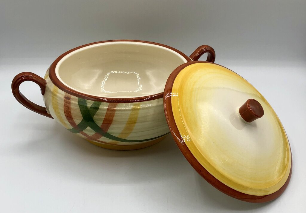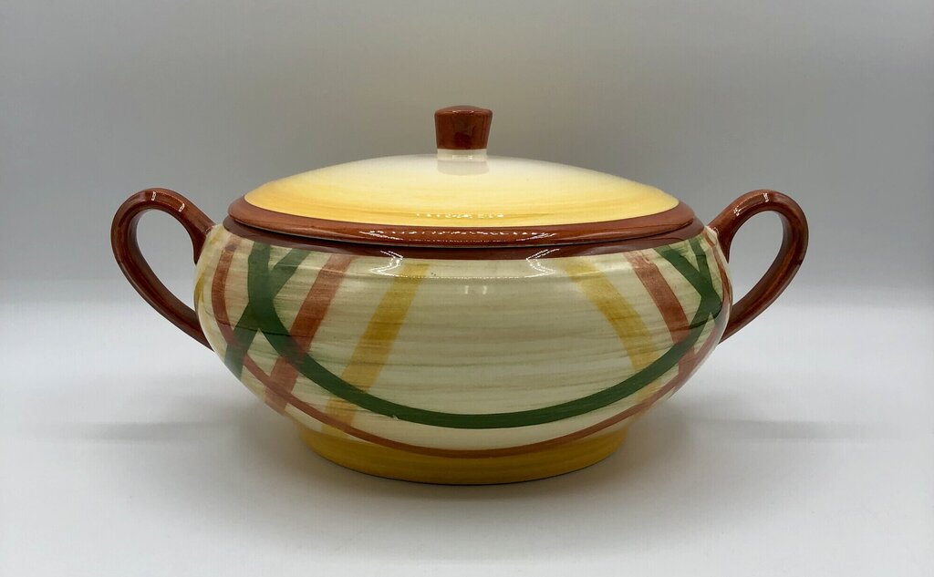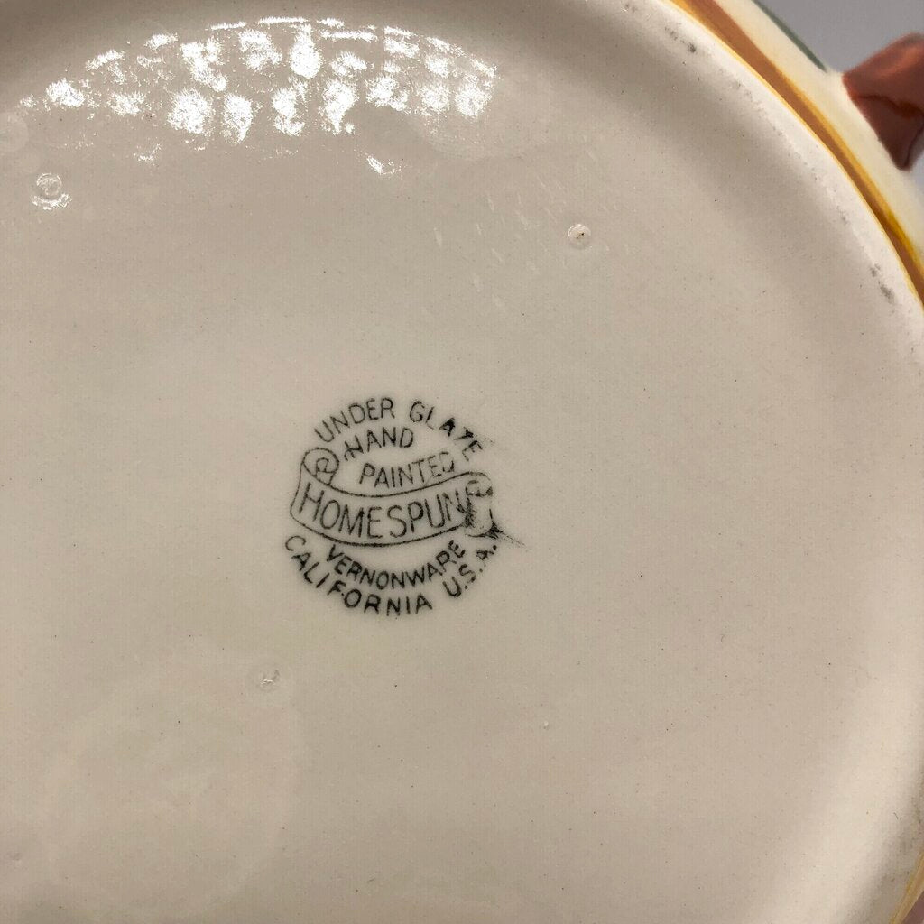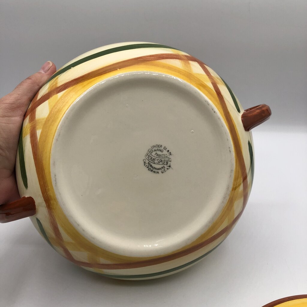 This Vernonware Homespun covered casserole dish was made in California by Vernon Kilns, pre 1958.