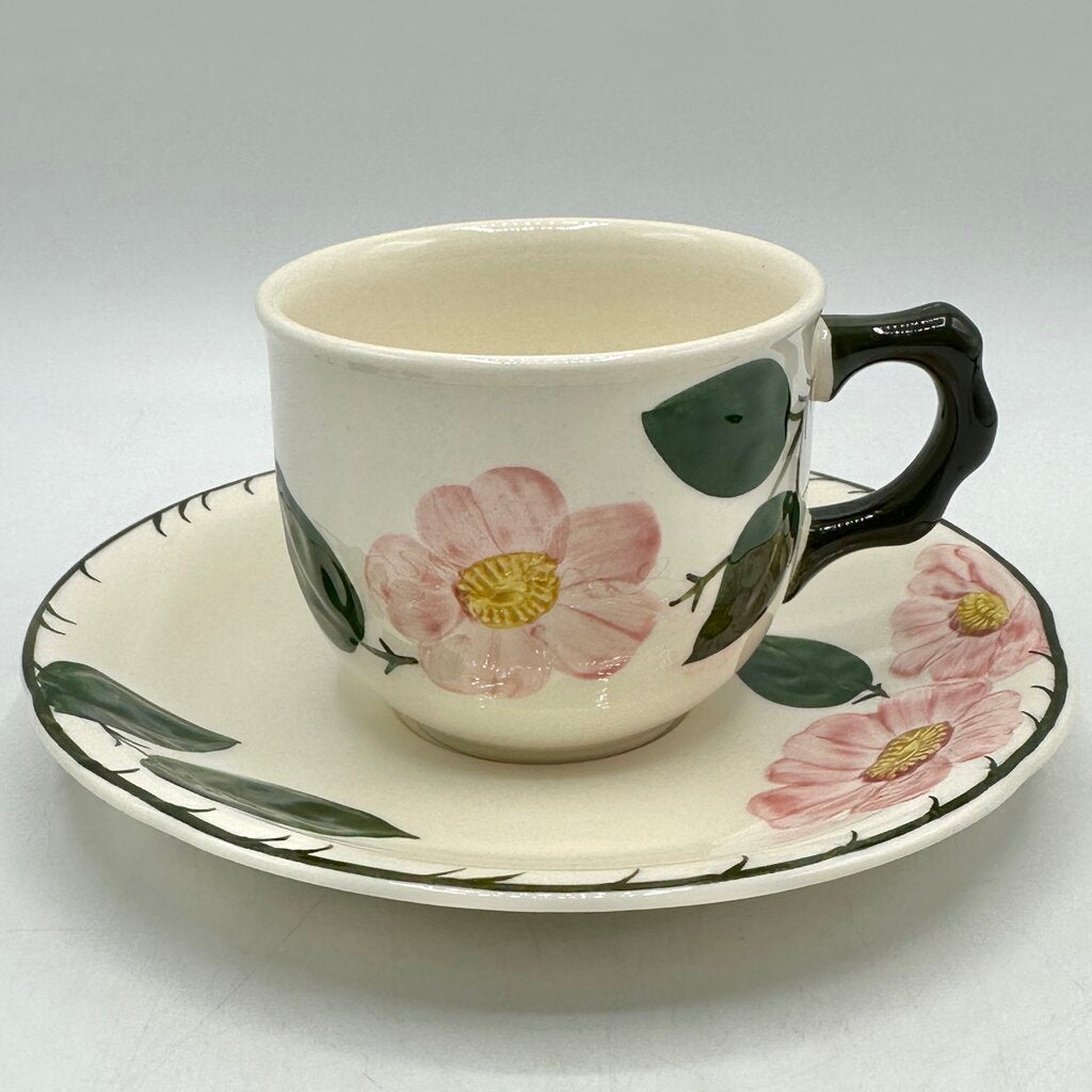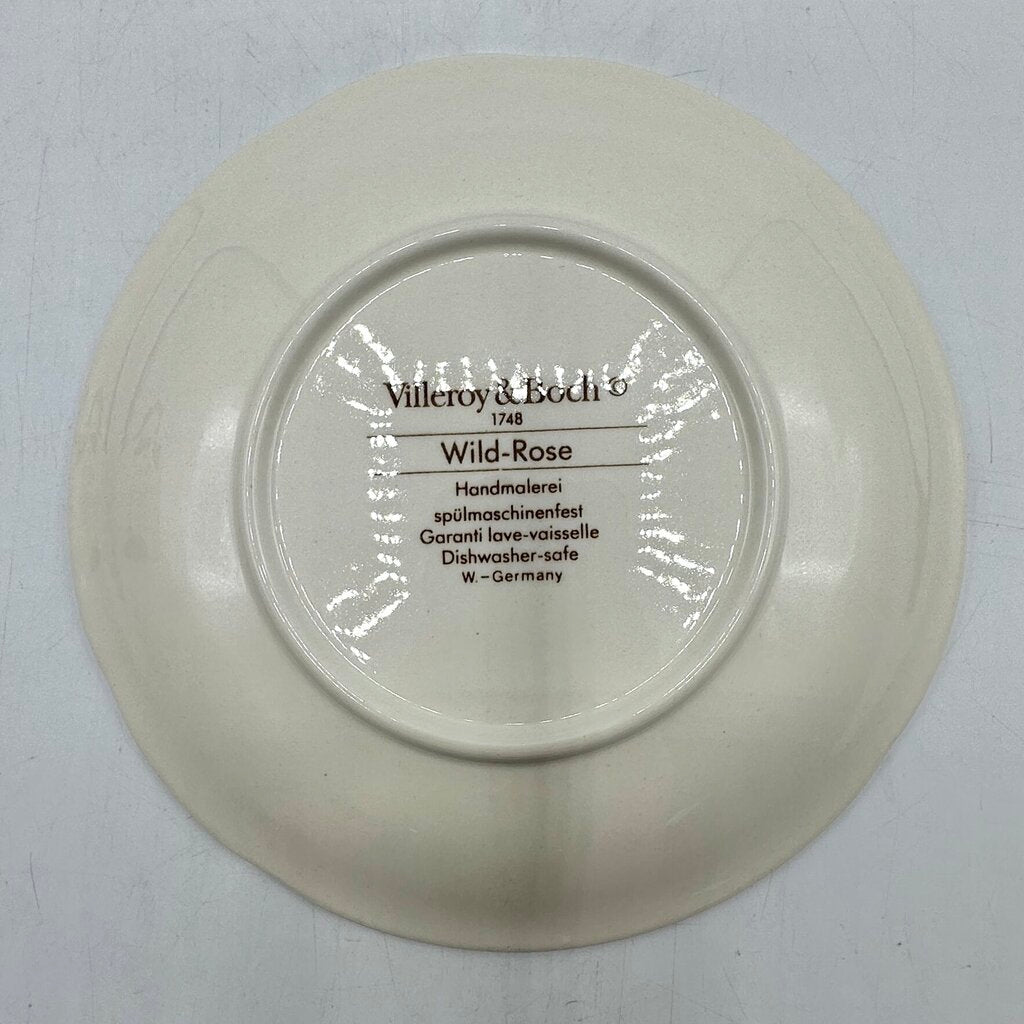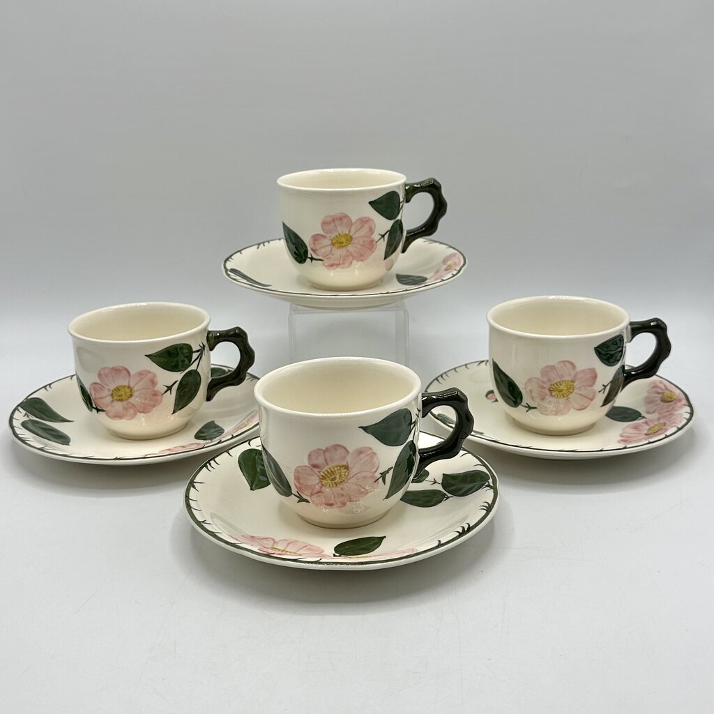 Four Villeroy & Boch Wild Rose fine china flat cup and saucer sets. Made in Germany. The lovely hand painted Wild Rose pattern was a popular generational favorite from 1968 until 2018. The cups have a 3 1/4” diameter and are 2 3/4” tall, the saucers measure 6 1/4”, they are in very good vintage condition, no chips, cracks, crazing or repairs.