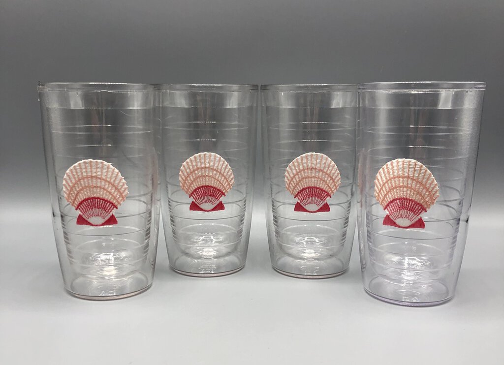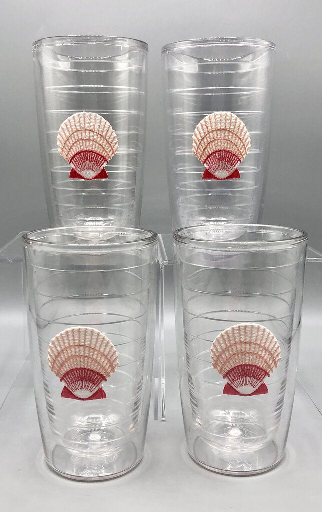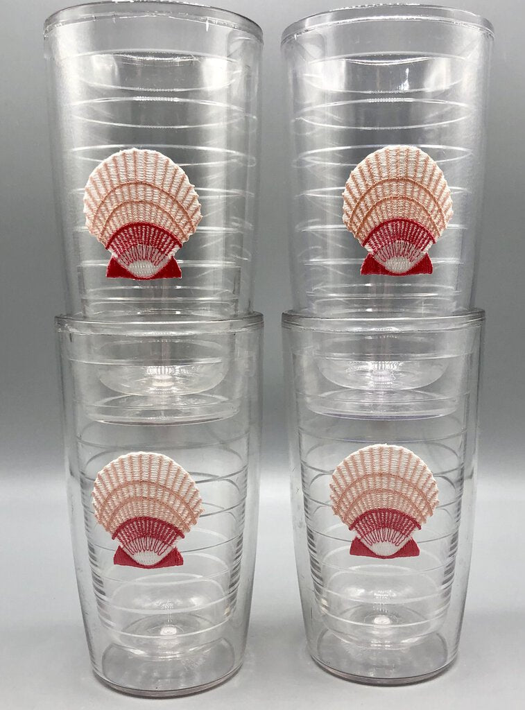 Hold 16 ounces of your favorite beverage. Each has a seashell coastal patch.