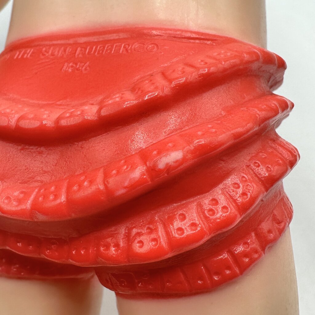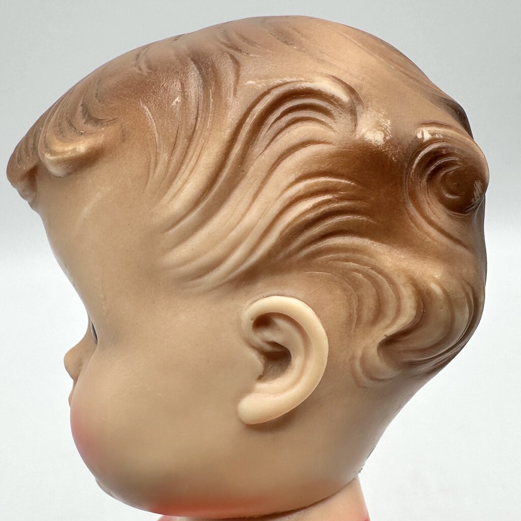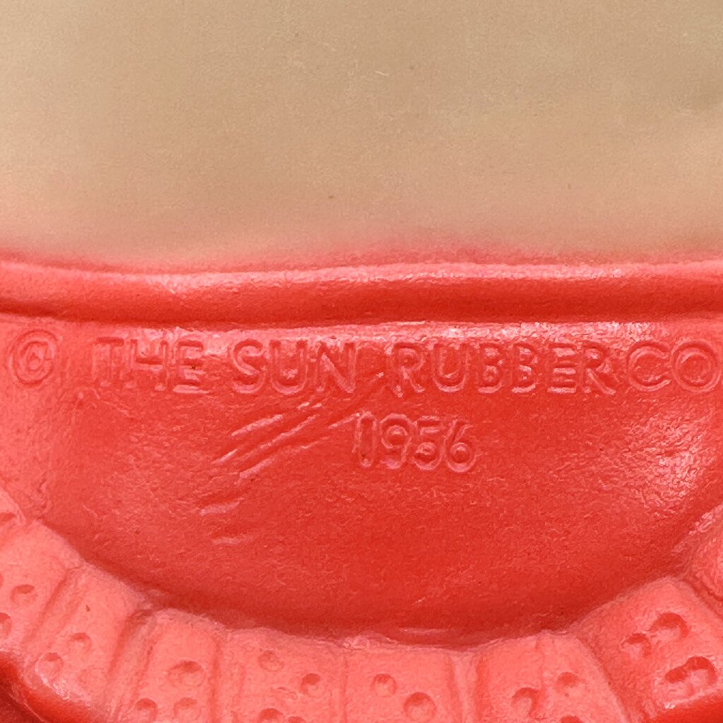 Vintage 1956 The Sun Rubber Company 10” doll. This sweet rubber doll wears a molded red outfit with matching red shoes. It also has molded brown curls, hazel eyes and cute pink cheeks. There is no squeaker. This doll is in wonderful condition and doe not show its age at all, its coloring is still beautiful with only minimal loss. The rubber is soft without holes or tears. A more thorough gentle cleaning will make this little cutie shine. Please carefully review all photos for condition details.