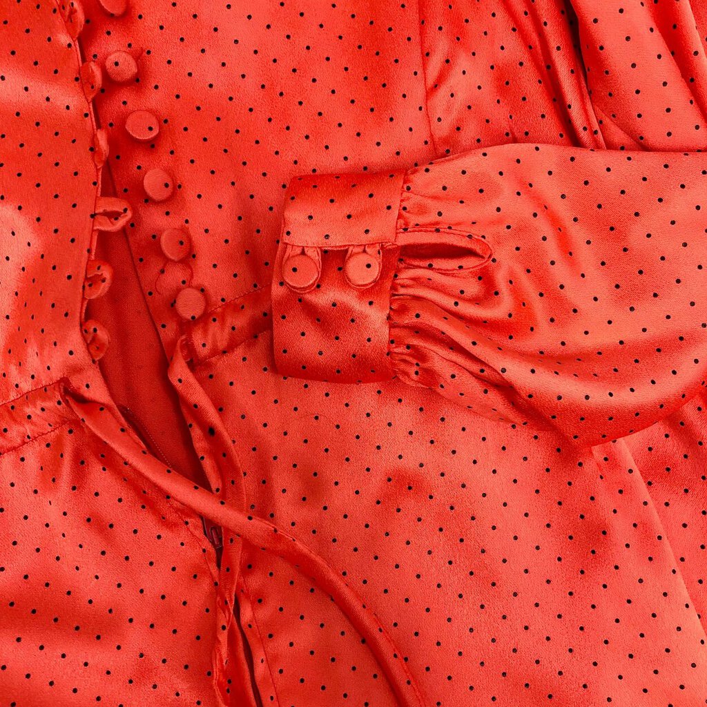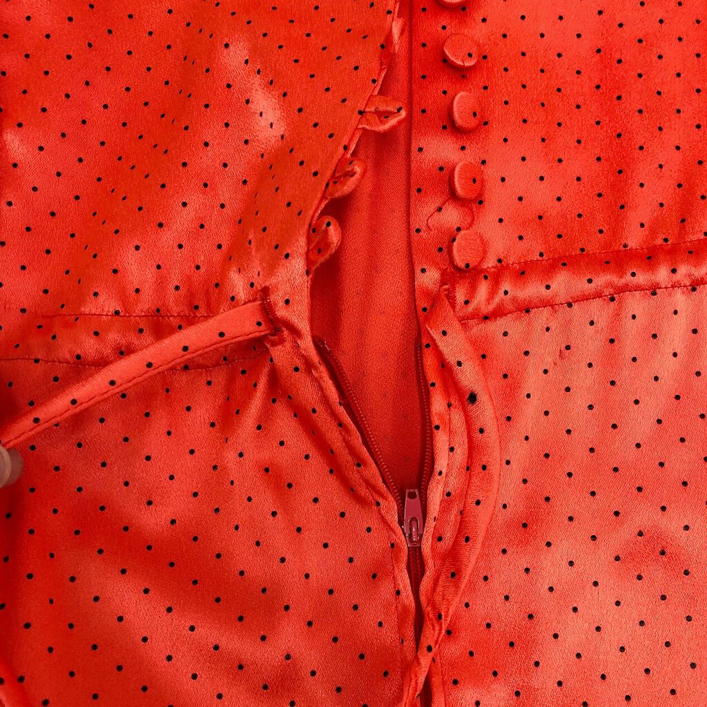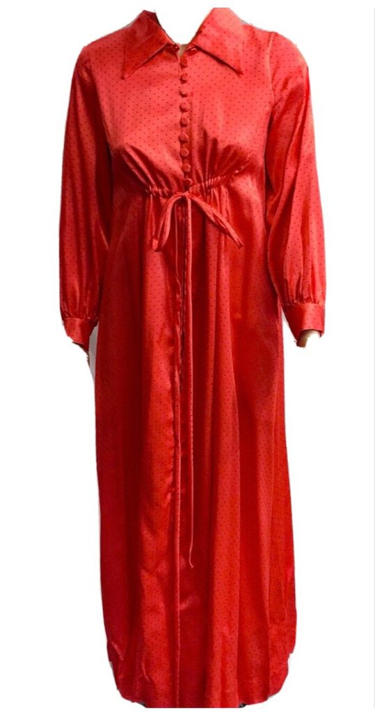 Look fabulous out on the town with friends or sipping coffee on the breakfast patio. This gown is a show stopper. Cloth buttons grace the breast down to a front cinch waist. The front continues on with a zipper for easy on and off. All these closers give a nice fit to the front and leave the back flowing and breezy. Double buttons on cuffs and pockets on each side. ILGWU label 14% Nylon, 86% Acetate. Machine wash, tumble dry low. Do not twist or wring. Measurements: * Size Small * Length 52”. * Shoulders 15”. * Bust armpit to armpit 17” * Sleeve shoulder to cuff 20” Excellent condition. No rips or stains. Please review all photos carefully for condition and consideration.
