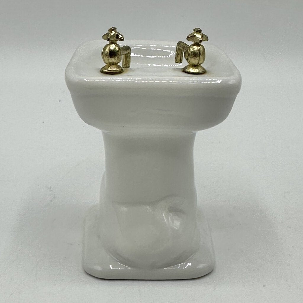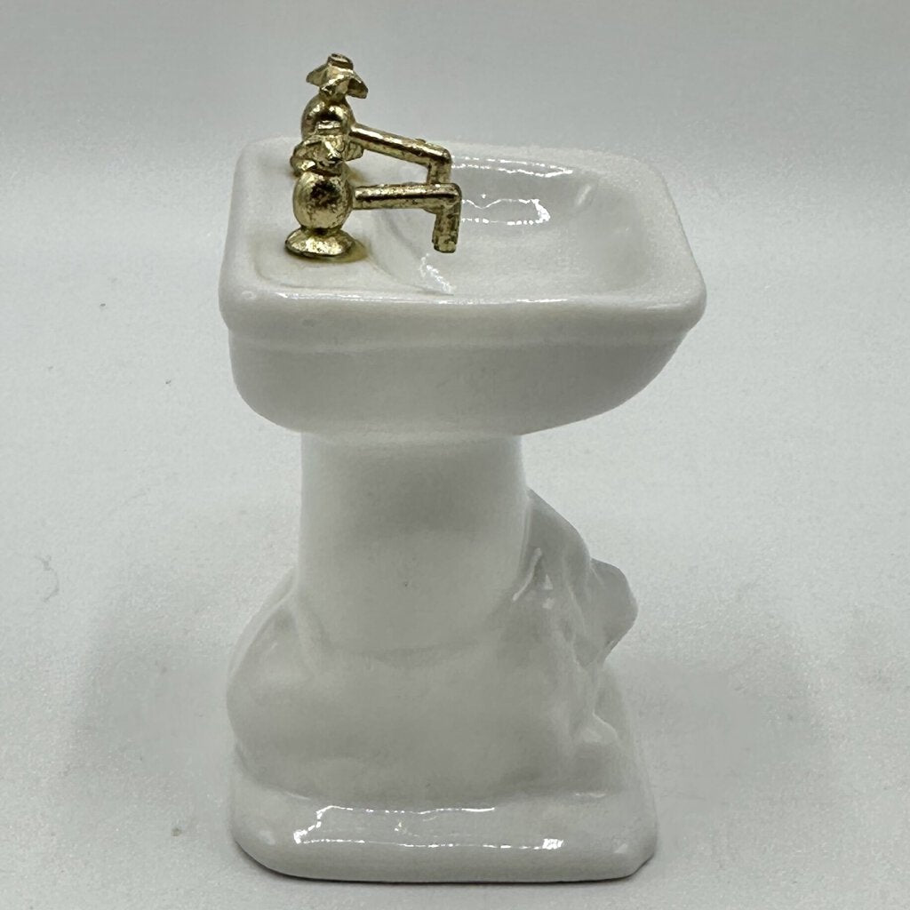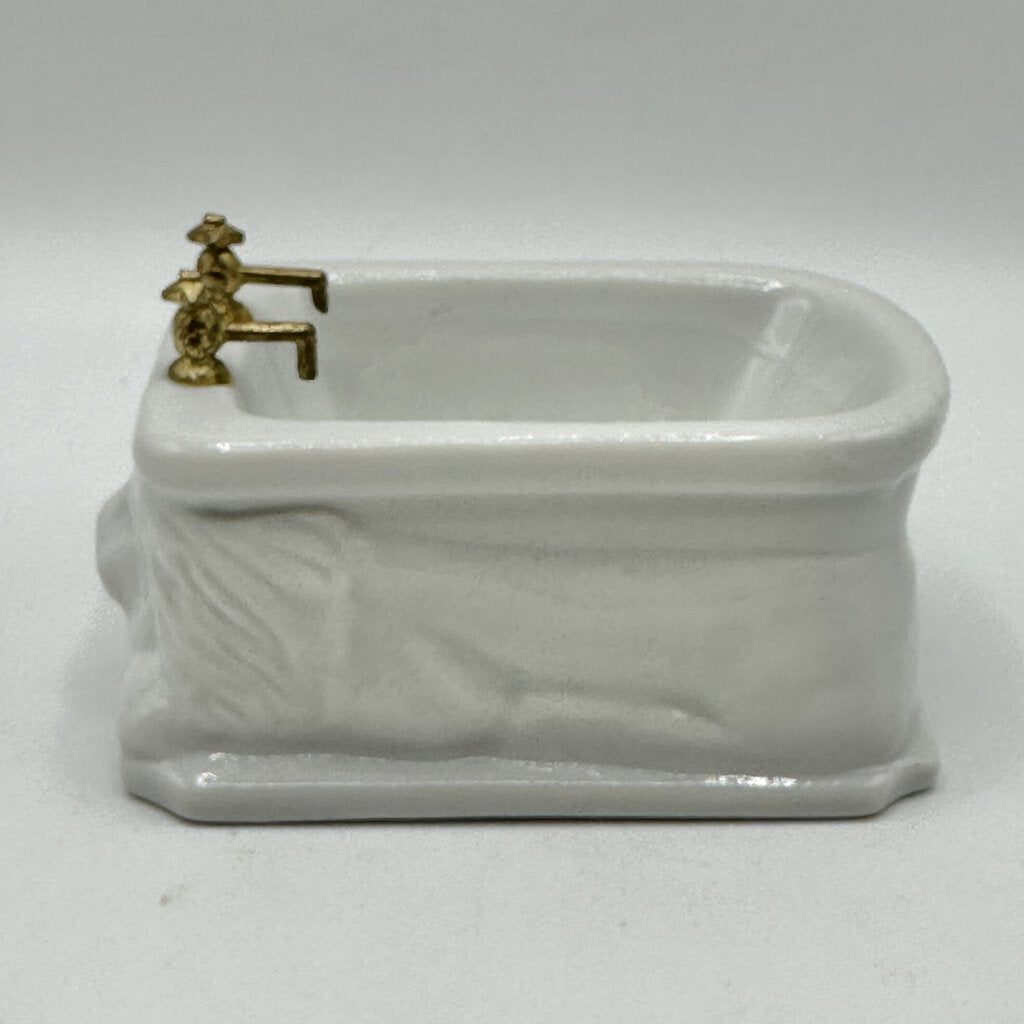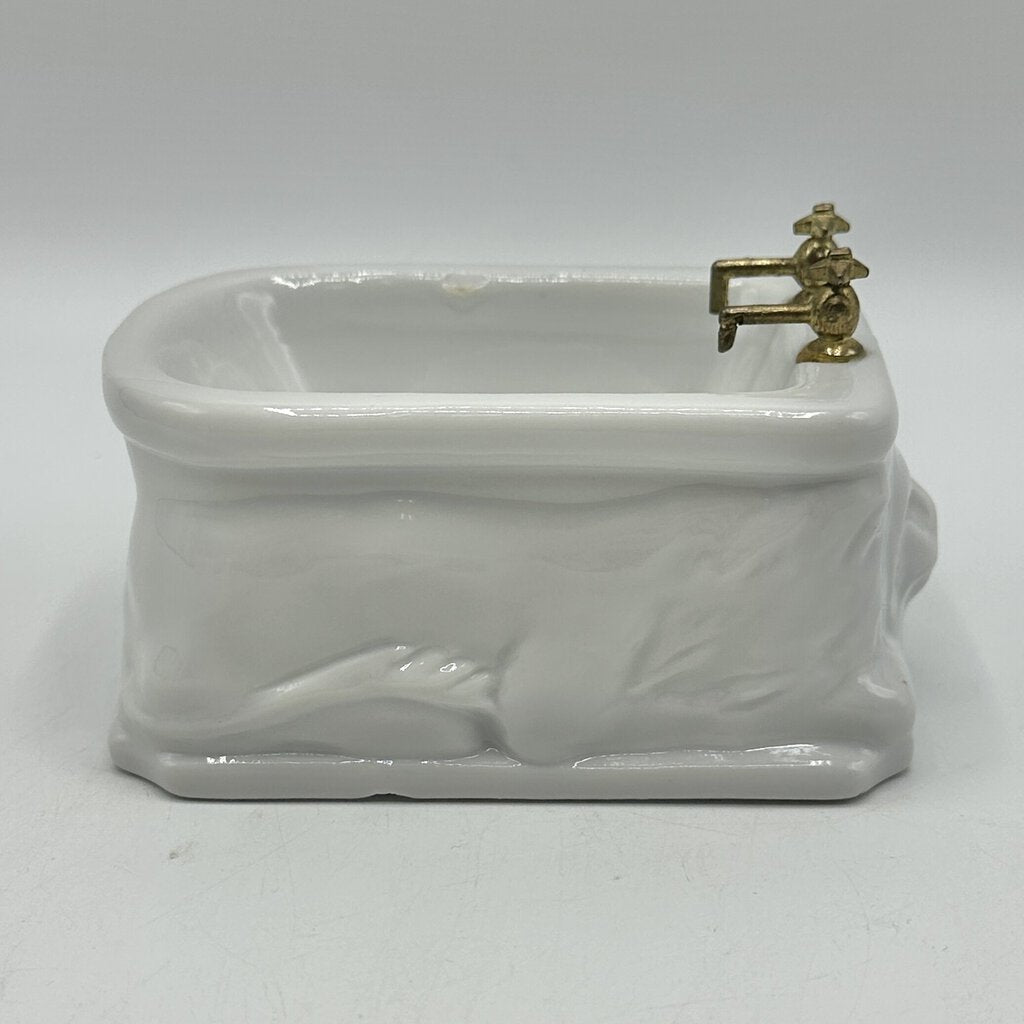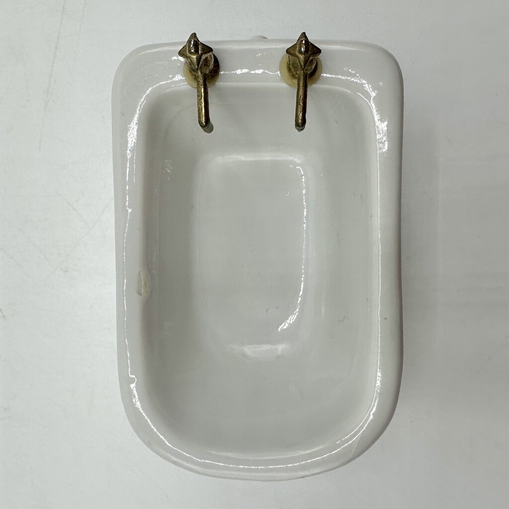 Vintage B.Shackman & Co 1982 3 piece white porcelain “Majestic Lion” dollhouse miniature bathroom set with original box. This set includes a tub, pedestal sink and pull chain toilet. Shackman’s version of a Victorian style set featuring a lion design molded in relief on fine white porcelain with brass fittings. The bathtub measures 4”x 2 1/2”, the sink 2”x 2 1/2” x 1 3/4” and the toilet 5 1/2”x 2 1/2” x 1 1/2”. Everything is in good vintage condition, the toilet is missing the lid and the pull chain and the tub has what appears as a chip on first glance but is a glaze slip. The box shows some age and storage wear. Please carefully review the photos for condition details and feel free to ask questions.