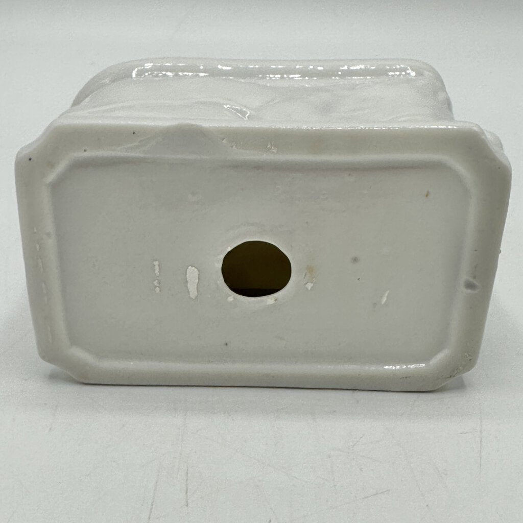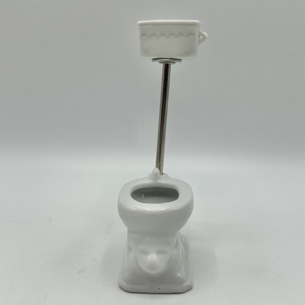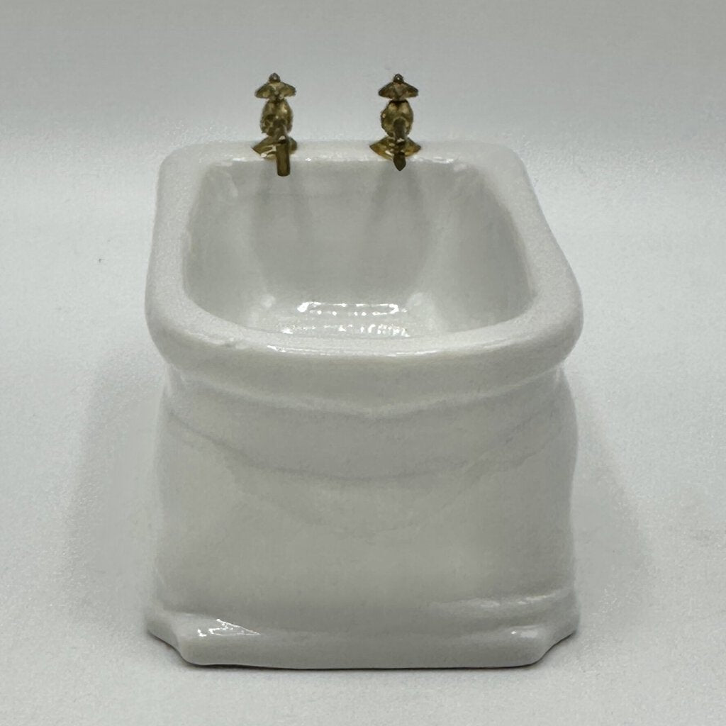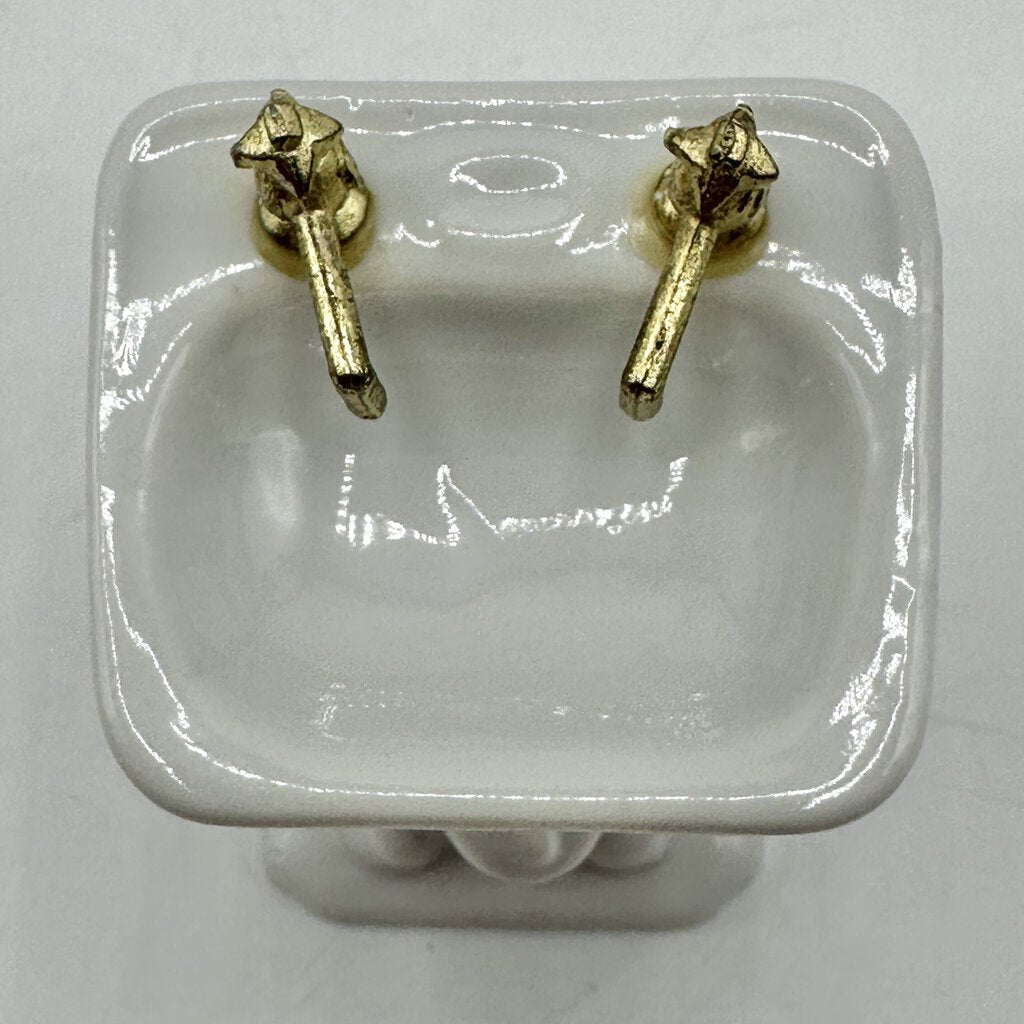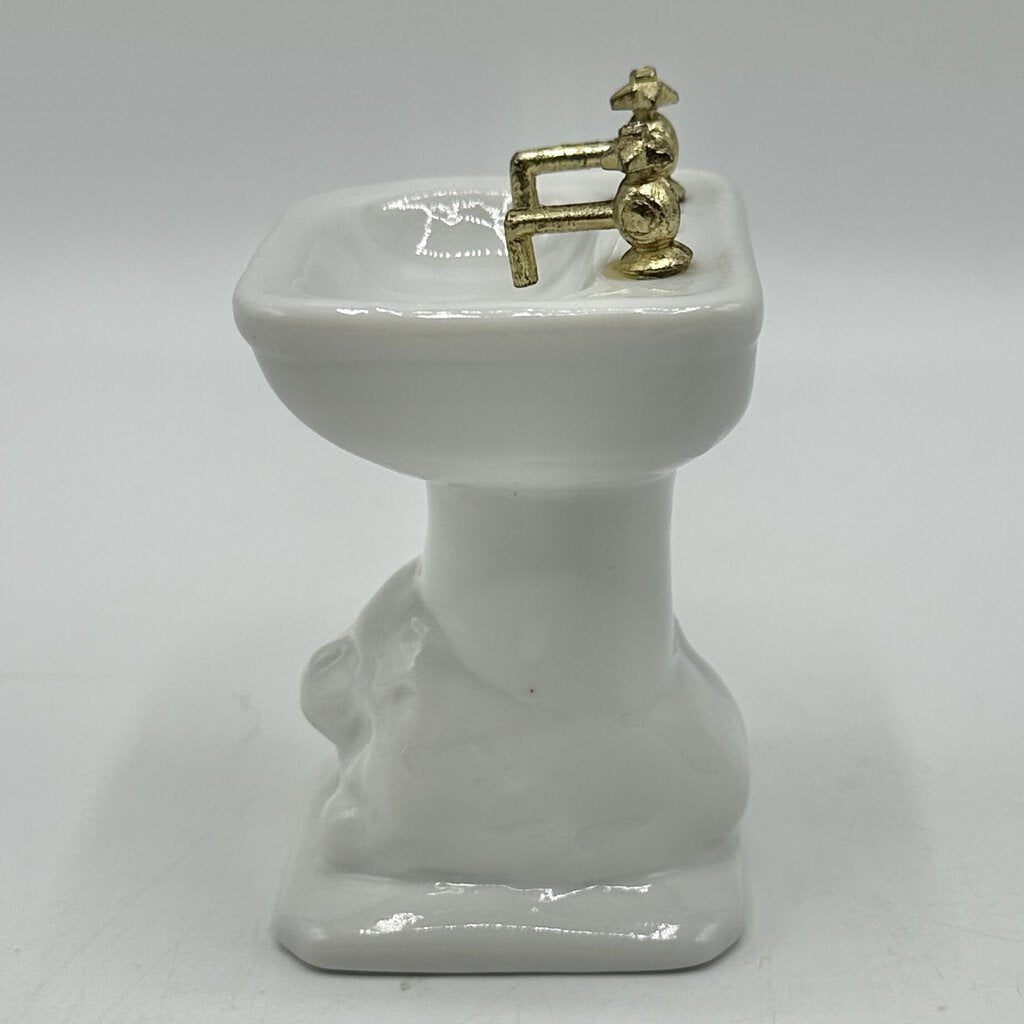 Vintage B.Shackman & Co 1982 3 piece white porcelain “Majestic Lion” dollhouse miniature bathroom set with original box. This set includes a tub, pedestal sink and pull chain toilet. Shackman’s version of a Victorian style set featuring a lion design molded in relief on fine white porcelain with brass fittings. The bathtub measures 4”x 2 1/2”, the sink 2”x 2 1/2” x 1 3/4” and the toilet 5 1/2”x 2 1/2” x 1 1/2”. Everything is in good vintage condition, the toilet is missing the lid and the pull chain and the tub has what appears as a chip on first glance but is a glaze slip. The box shows some age and storage wear. Please carefully review the photos for condition details and feel free to ask questions.