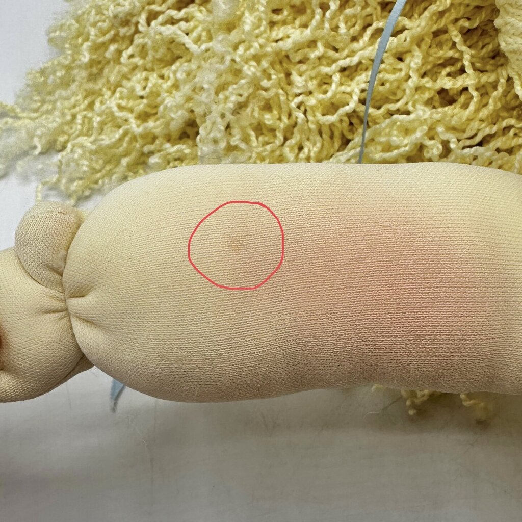She has a small red stain on her face and a shows faint gray stains on face, arm, body, and leg. Otherwise she is in very good clean condition with no musty odors, tears, holes or popped stitches.