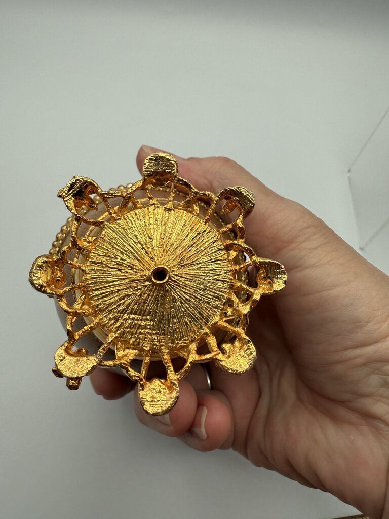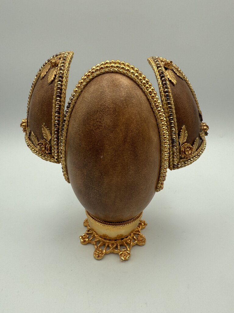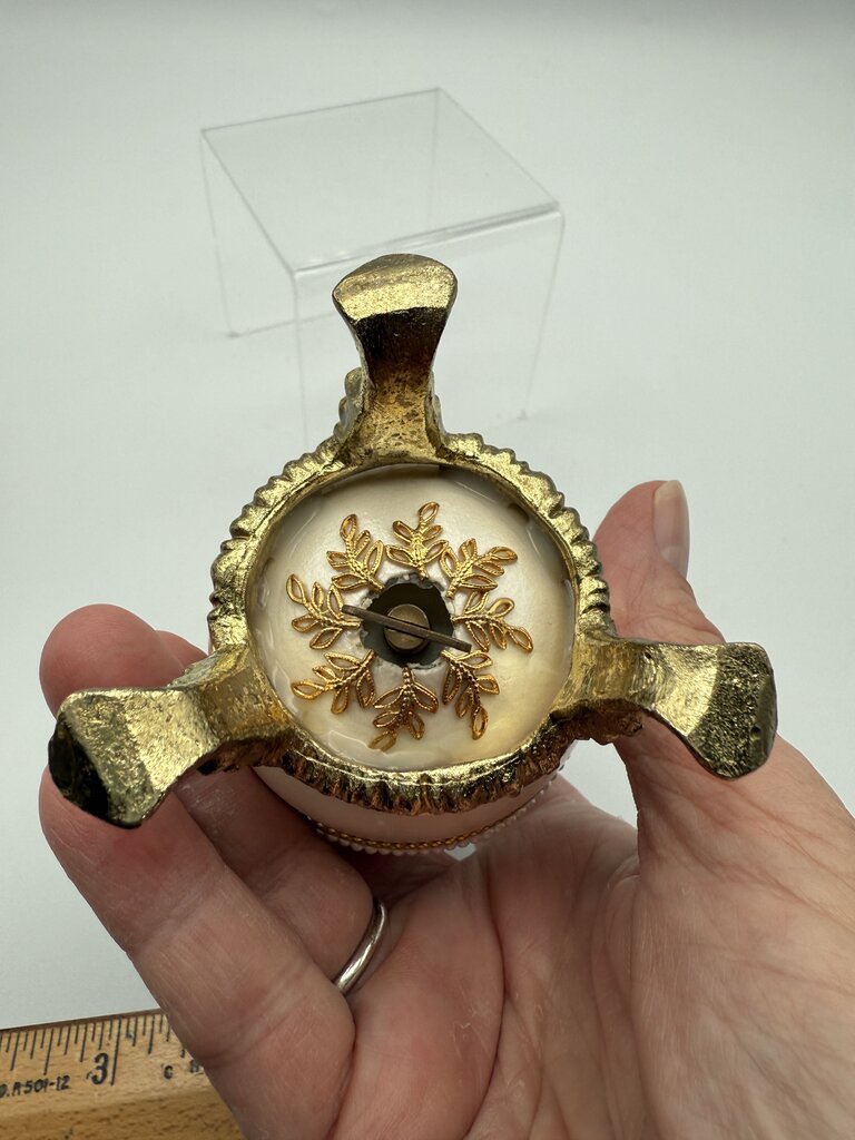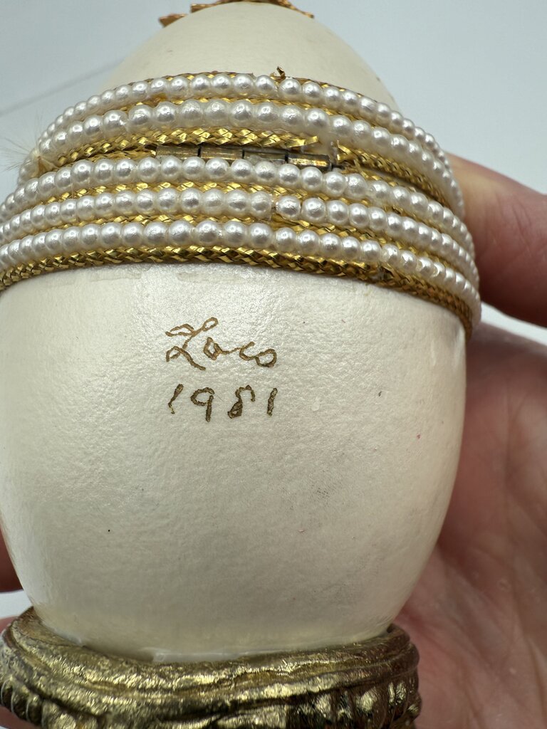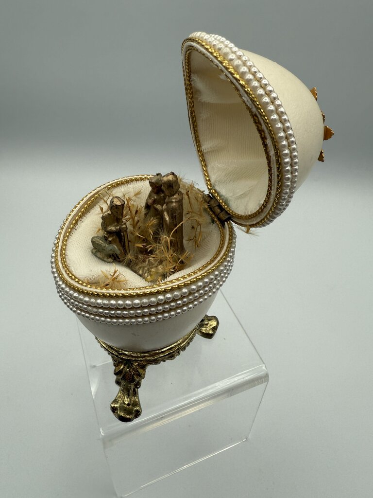 Estate set of two blown eggs, duck size, with the Nativity diorama inside. One egg is brown toned with a double door that opens to see a wood nativity on a gold tone base. The ivory toned egg opens from the top and shows a gold tone tiny nativity inside. The ivory egg also winds on the bottom to play “Silent Night”. Music box works when wound. Gold tone 3 footed base. Signed on the back by maker in 1981. Charming set.ac